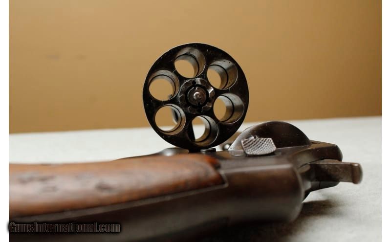 Description: Smith & Wesson U.S. Army Model 1917 with holster. 5.5" pinned barrel and six round fluted cylinder. Wood grips show some dings. Finish is consistent with age. .45 ACP SOLD Metal Condition: good Wood Condition: good Bore Condition: bright Barrels: 5.5" pinned barrel Triggers: SA/DA Butt Pad: wood grips Weight: 2 lb 4 oz Sights: "blade front sight, channel rear sight Item Location: La Vista, NE |