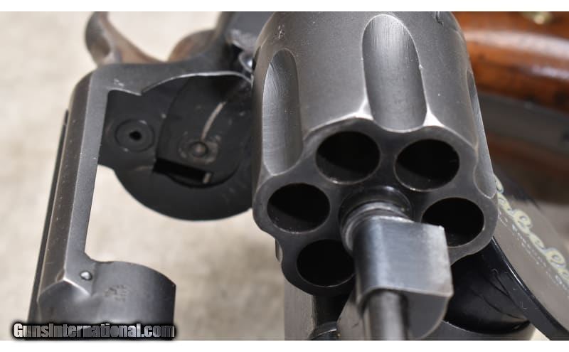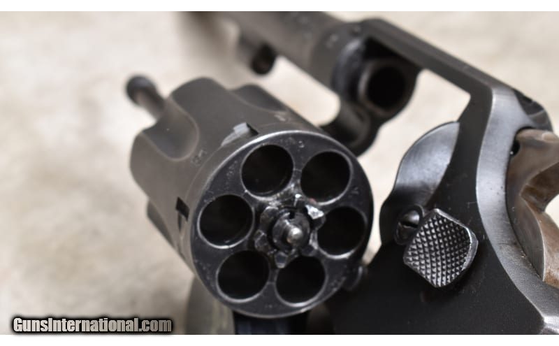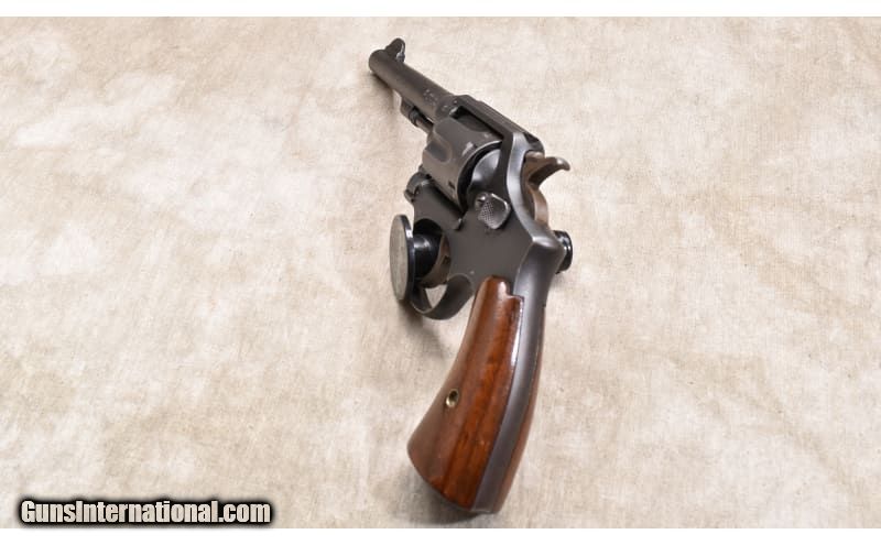 Description: This revolver features double and single action trigger, hardwood stocks, fixed sights, and lanyard loop. It has BNP proof marks. .38 S&W SOLD Chambers: 6 rounds Metal Condition: Very good.Some finish wear on the high points and a light turn line. Wood Condition: Good. There are a few dings. Bore Condition: "Shiny, but a little dark. Barrels: 5-inch Triggers: Factory double and single action trigger. Butt Pad: Smooth hardwood. Weight: 31 oz Sights: Blade and top-strap groove. Item Location: Rogers |