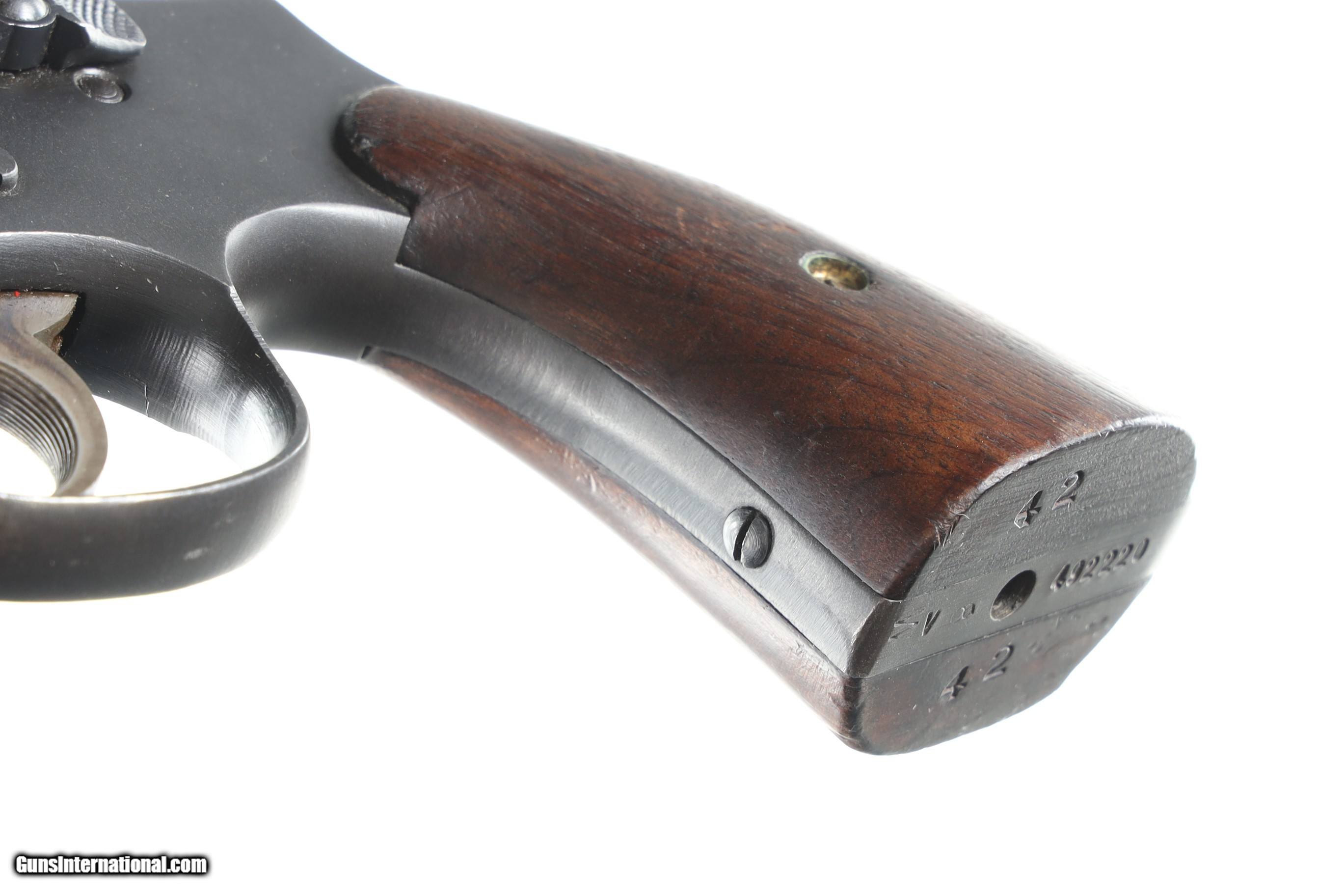 Description: WW2 Smith & Wesson Victory Model .38 revolver. Grips marked "42", ordnance bomb marking present on the butt of the gun. Lanyard loop absent. Excellent overall retaining almost all parkerized finish, vivid case colors on hammer and trigger, grips are good with repair on right side, matching numbers throughout, mechanically excellent. Manufactured c. 1942-1945. • Free Shipping, No Credit Card Fees. • Lay-a-way available for this firearm. • 1/3 Down, a 1/3 in 30 Days 1/3 in 60 Days. SOLD Curio/Relic: Yes Handgun Caliber: .38 Special Manufacturer: Smith & Wesson Model: Victory Serial Number: V492220 Barrel Length: 4 |