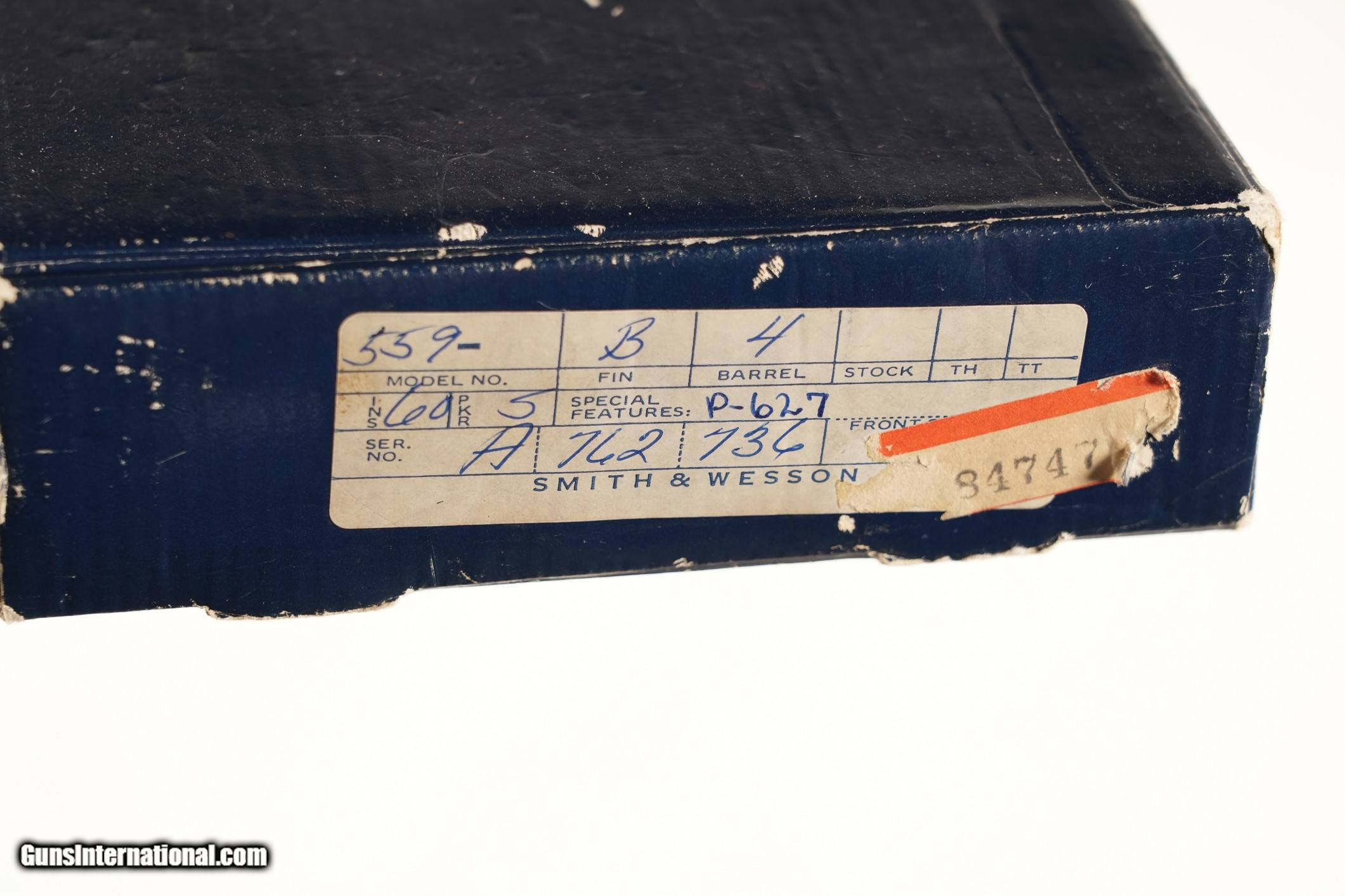 Description: Smith & Wesson Model 559, 9mm 15 round magazine, adjustable sights. steel frame , wide extractor, Single / double action operation with decocking safety. Custom finger groove wood grips. Comes with numbers matching box with spare magazine and cleaning components. Condition, Very fine with excellent bore and over 98% finish. Mechanically fine • Free Shipping, No Credit Card Fees. • Lay-a-way available for this firearm. • 1/3 Down, a 1/3 in 30 Days, 1/3 in 60 Days. SOLD Manufacturer: Smith & Wesson Model: 559 Serial Number: A762736 Barrel Length: 4 |