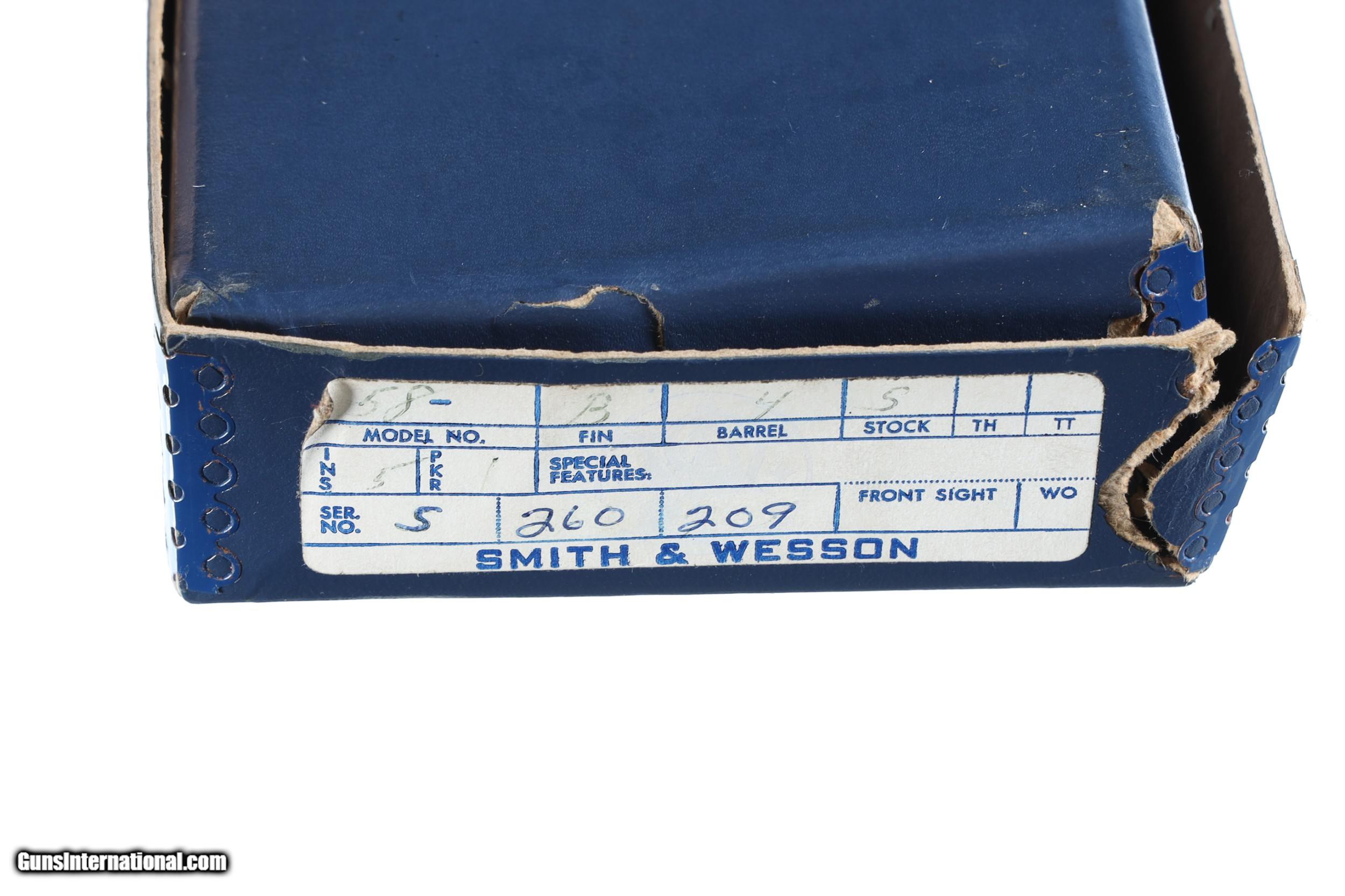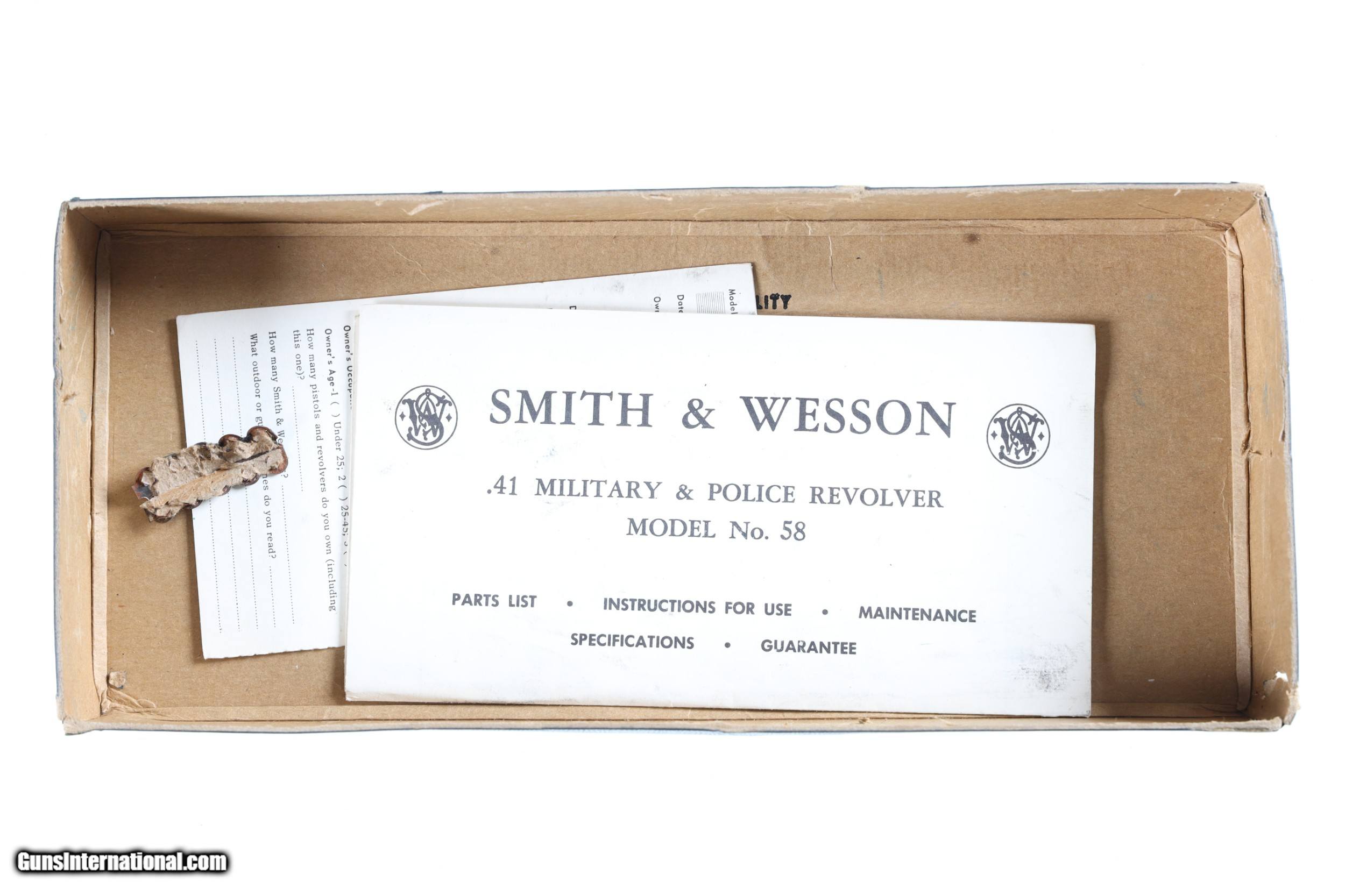 Description: Excellent overall condition, faint cylinder turn line, with factory box numbered to gun (possibly renumbered). Mfg 1965-1966. • Free Shipping, No Credit Card Fees. • Lay-a-way available for this firearm. • 1/3 Down, a 1/3 in 30 Days 1/3 in 60 Days. SOLD Curio/Relic: Yes Manufacturer: Smith & Wesson Model: 58 Serial Number: S260209 Barrel Length: 4 |