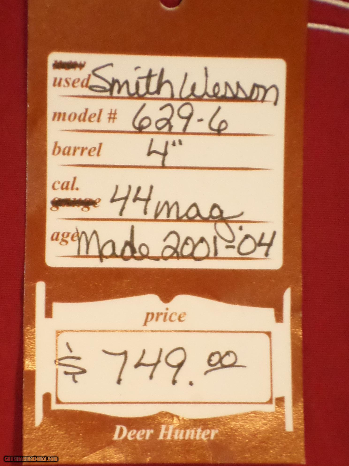 Description: SOLD For sale, Smith & Wesson 629-6, 4" .44 Mag. Excellent condition.Circa 2001/2004 SOLD To see more of our inventory, visit deerhunterguns,com We collect 7% sales tax for Florida sales. We accept MC, Visa and Discover, no AmEx. No Sales to California. Like us on Facebook: Deer Hunter Guns SOLD |