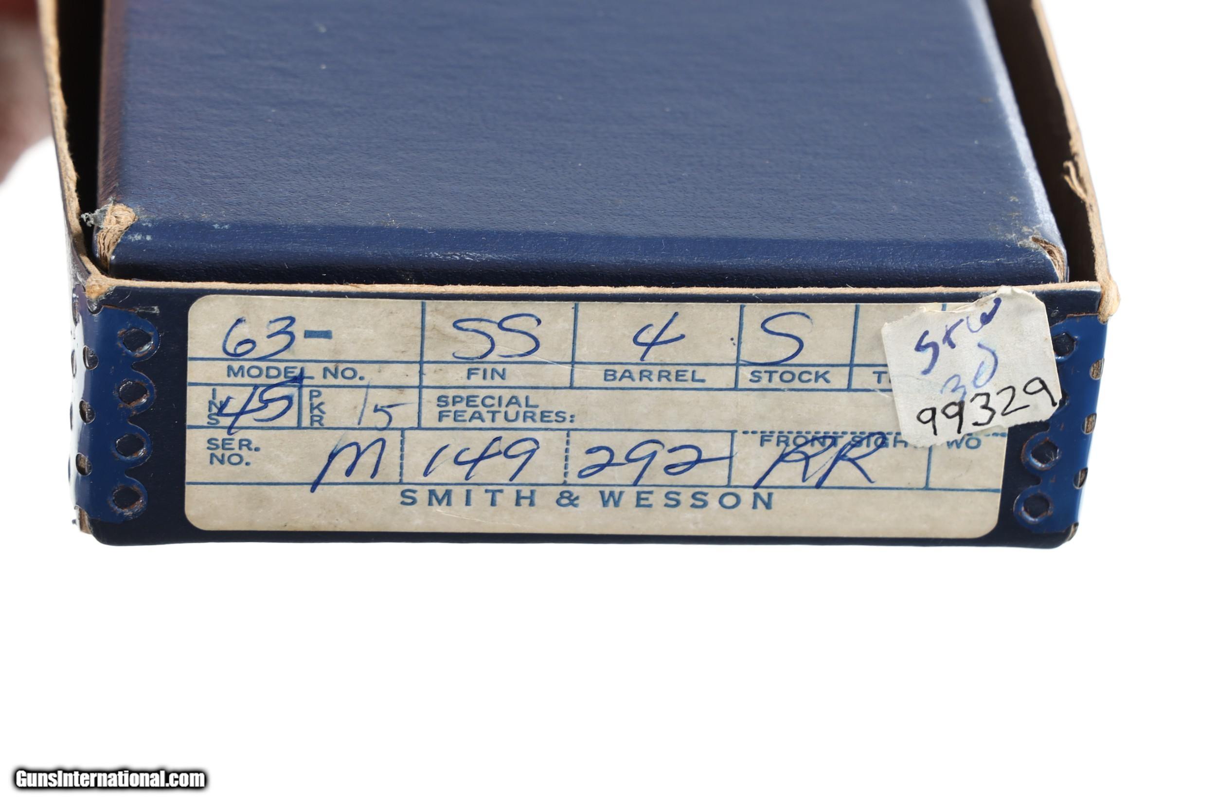 Description: Excellent overall condition with factory box numbered to gun. Manufactured in 1980/81. • Free Shipping, No Credit Card Fees. • Lay-a-way available for this firearm. • 1/3 Down, a 1/3 in 30 Days 1/3 in 60 Days. SOLD Manufacturer: Smith & Wesson Model: 63 Serial Number: M149292 Barrel Length: 4 |