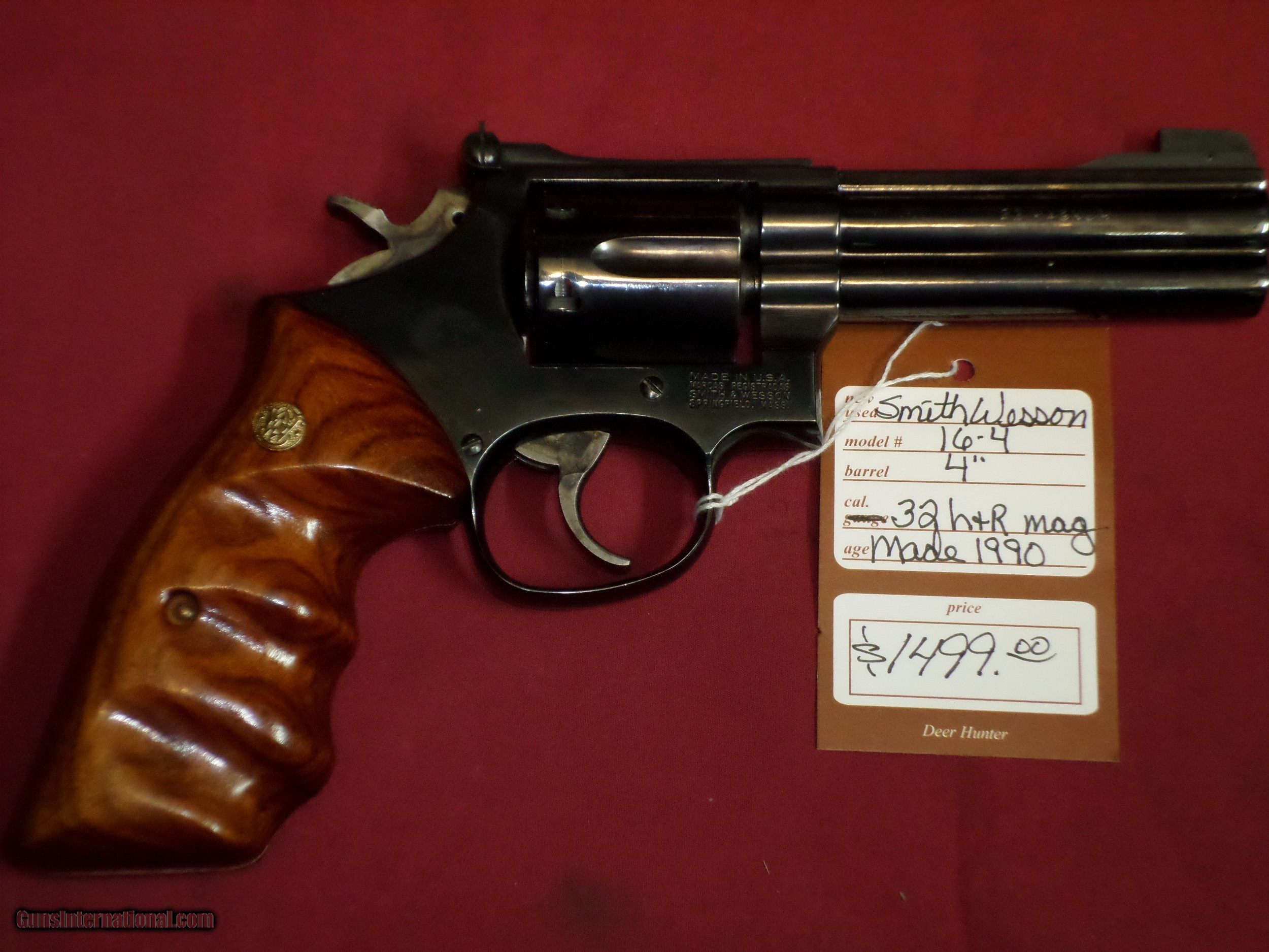 Description: SOLD For sale, Smith & Wesson Model 16-4, 4" blued .32 H&R Magnum. Like new in the box. Circa 1990 SOLD To see more of our inventory, visit deerhunterguns,com We collect 7% sales tax for Florida sales. We accept MC, Visa and Discover, no AmEx. No Sales to California. Shipping to lower 48 is: Handguns= $30 (USPS Priority) Long guns= $40 (UPS Ground Ins.) Like us on Facebook: Deer Hunter Guns SOLD |