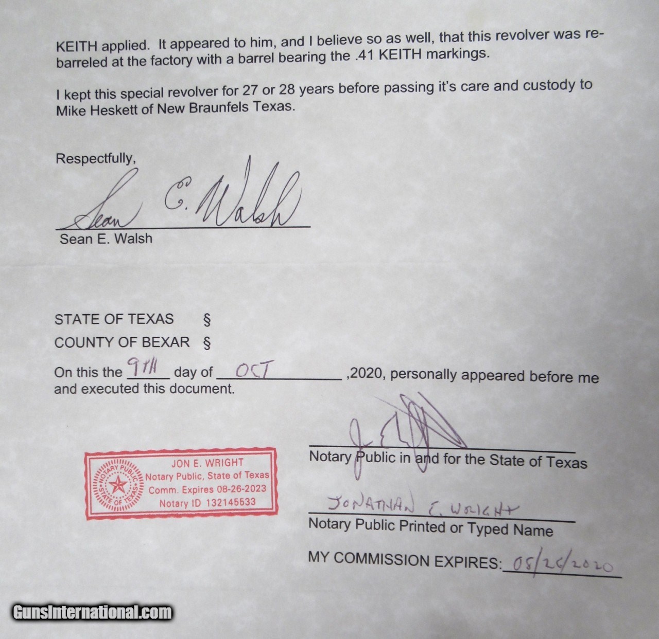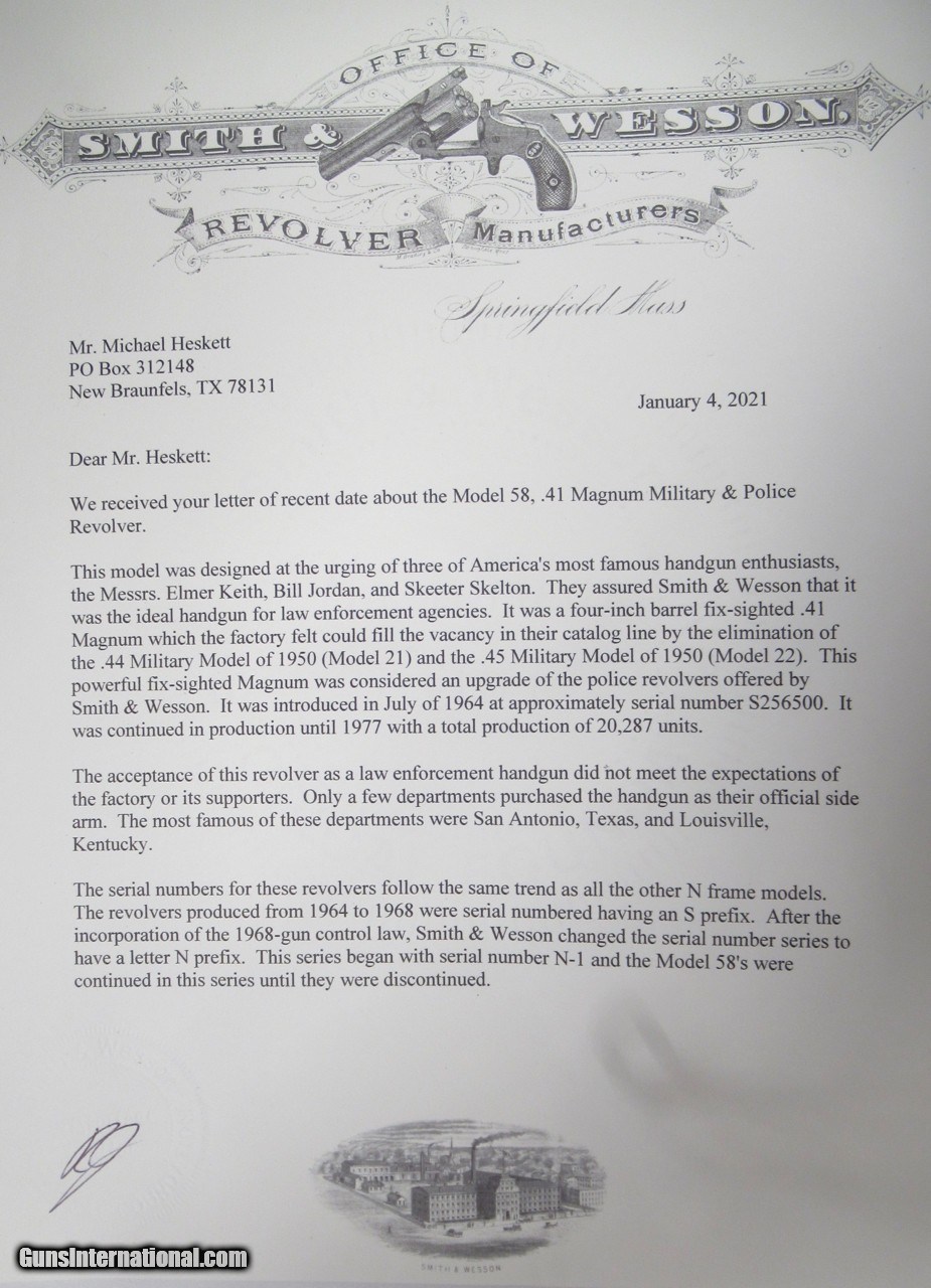 Description: Smith & Wesson Model 58; Serial No. N188356; 4” Blue in .41 Keith Caliber; Only One Ever Made; This Revolver is From the Collection of Retired San Antonio, TX Police Detective Sean Walsh; Factory S&W Letter Describes Revolver; Shipped to City of San Antonio as a “.41 Keith” Caliber and Stamped “SAPD” on Left Side of Frame; Great S.A.P.D. and Elmer Keith History; See All Photos for Condition; No Texts. Call or Email Only (collectingtexashotmail); PERSONAL PROPERTY of Harold Wieser; Price: $13,975 + $45 S&H Via FedEx Express; PLEASE DO NOT SEND PAYMENT THROUGH U.S. POSTAL SERVICE; Payment Address: Harold Wieser - 1466 U.S. Hwy 77 - Rosebud, TX 76570; Price includes insured shipping; return policy: three days inspection from the date the item is received; full refund of shipping both ways ONLY IF THE ITEM IS MISREPRESENTED. SOLD Manufacturer: Smith & Wesson Model: 58 (41 Keith) Serial Number: N188356 |