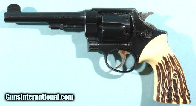 Description: WW1 WWI SMITH & WESSON MODEL 1917 U.S. PROPERTY .45 ACP CAL. 5 ½” REVOLVER. All original except the aftermarket plastic stag grips. Lanyard loop missing. Barrel stamped on underside ‘UNITED STATES PROPERTY” and on butt beneath the grip “U.S./ARMY/MODEL/1917” with serial number. Retains approximately 95% original blue and most of the case colors on the hammer and trigger. Small patch of very fine salt & pepper on cylinder about the border of one flute. Excellent bore and perfect working order. SOLD Curio/Relic: Yes |