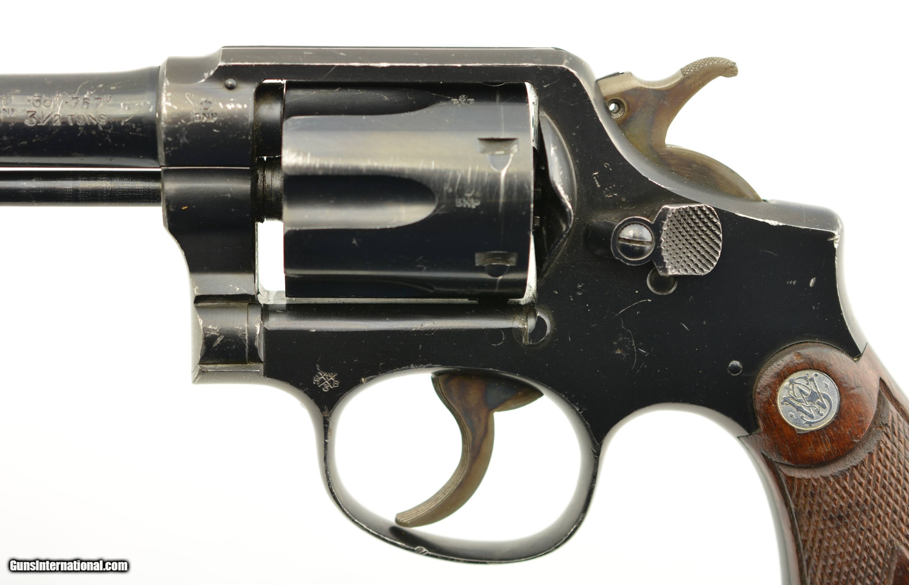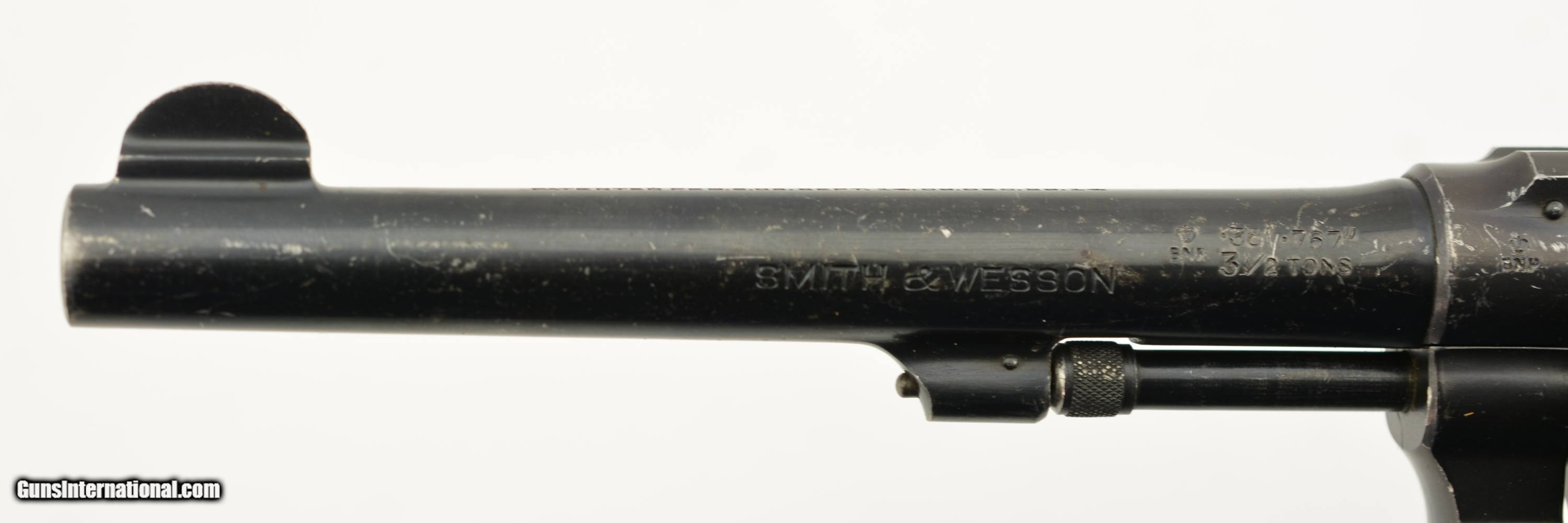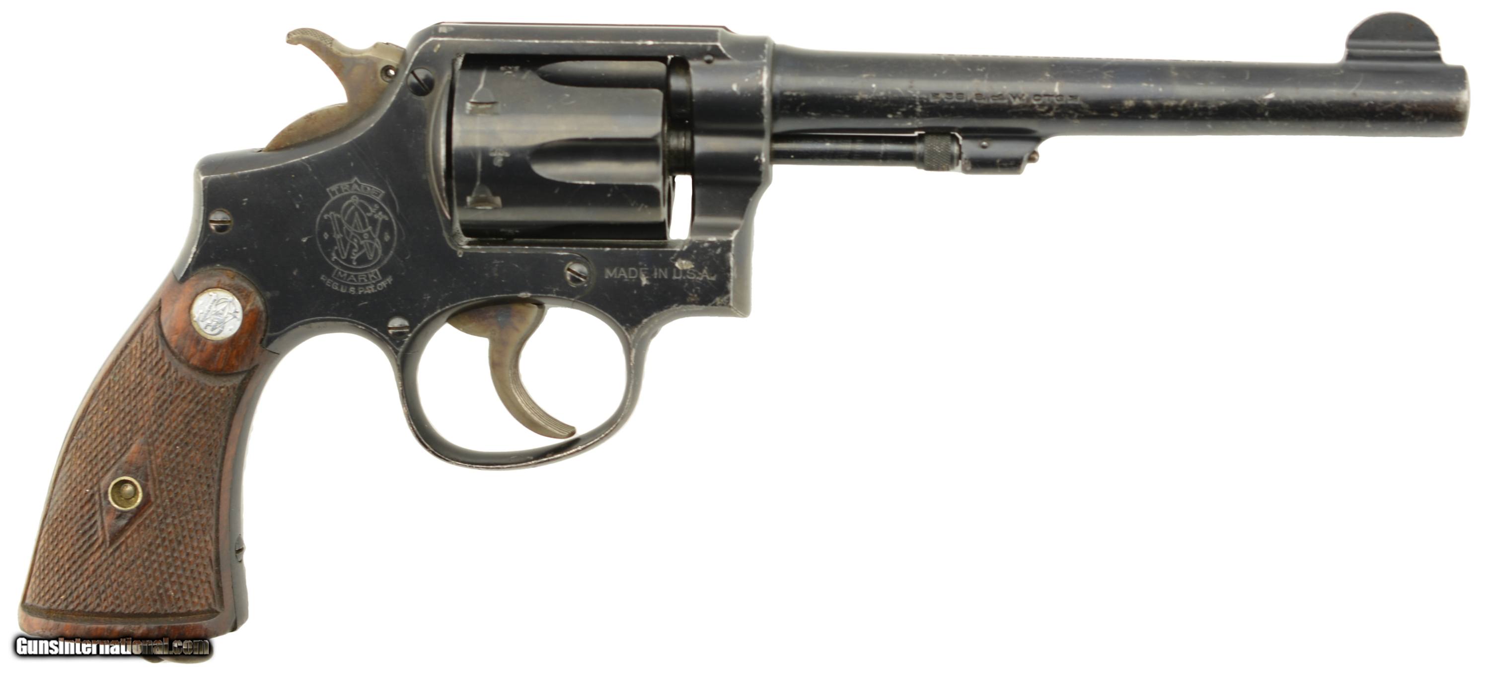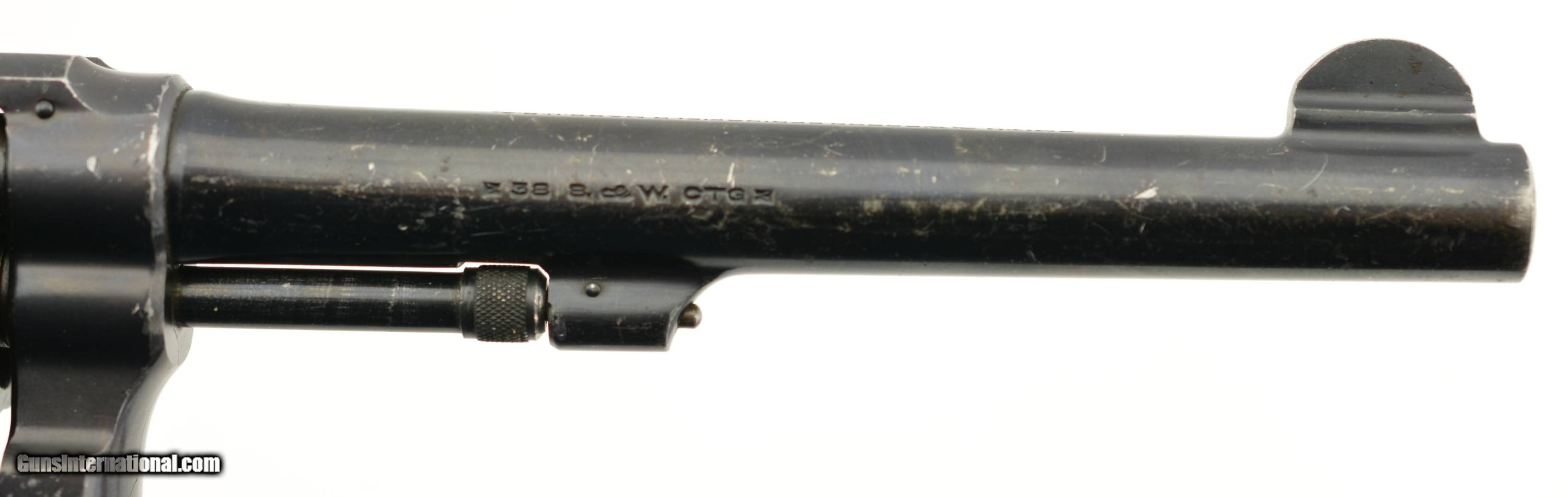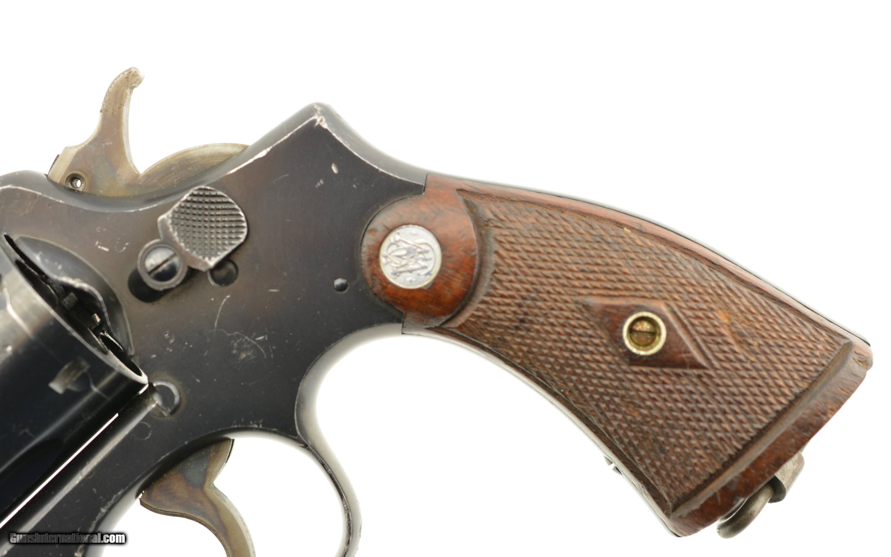 Description: Serial #704010, .38 S&W, 6" barrel with an excellent, bright bore. This is one of the early pre-prefix revolvers and has matching numbers on the frame, barrel, cylinder, yoke, and extractor. The metal retains about 90-92% of the original "Black Magic" finish with scratches and silvering along the barrel, as well as along the high edges and bearing surfaces. The hammer and trigger have retained about 80-85% of the original color case-hardening, and extensive post-war Birmingham commercial proofs are present on the barrel, frame, and cylinder. The checkered walnut, diamond-center grips are numbered to the gun on the interior, and are in good-near very good condition with some flattening of the points, and small chips missing around the butt. The lock-up is still tight, and the original lanyard swivel is still in place. This is a fine example of a WW2 British contract S&W, and would make a great addition to any collection. FFL or C&R SOLD Curio/Relic: Yes Manufacturer: S&W Model: 1905 Serial Number: 704010 Caliber Info: .38 S&W Gauge Info: .38 S&W |