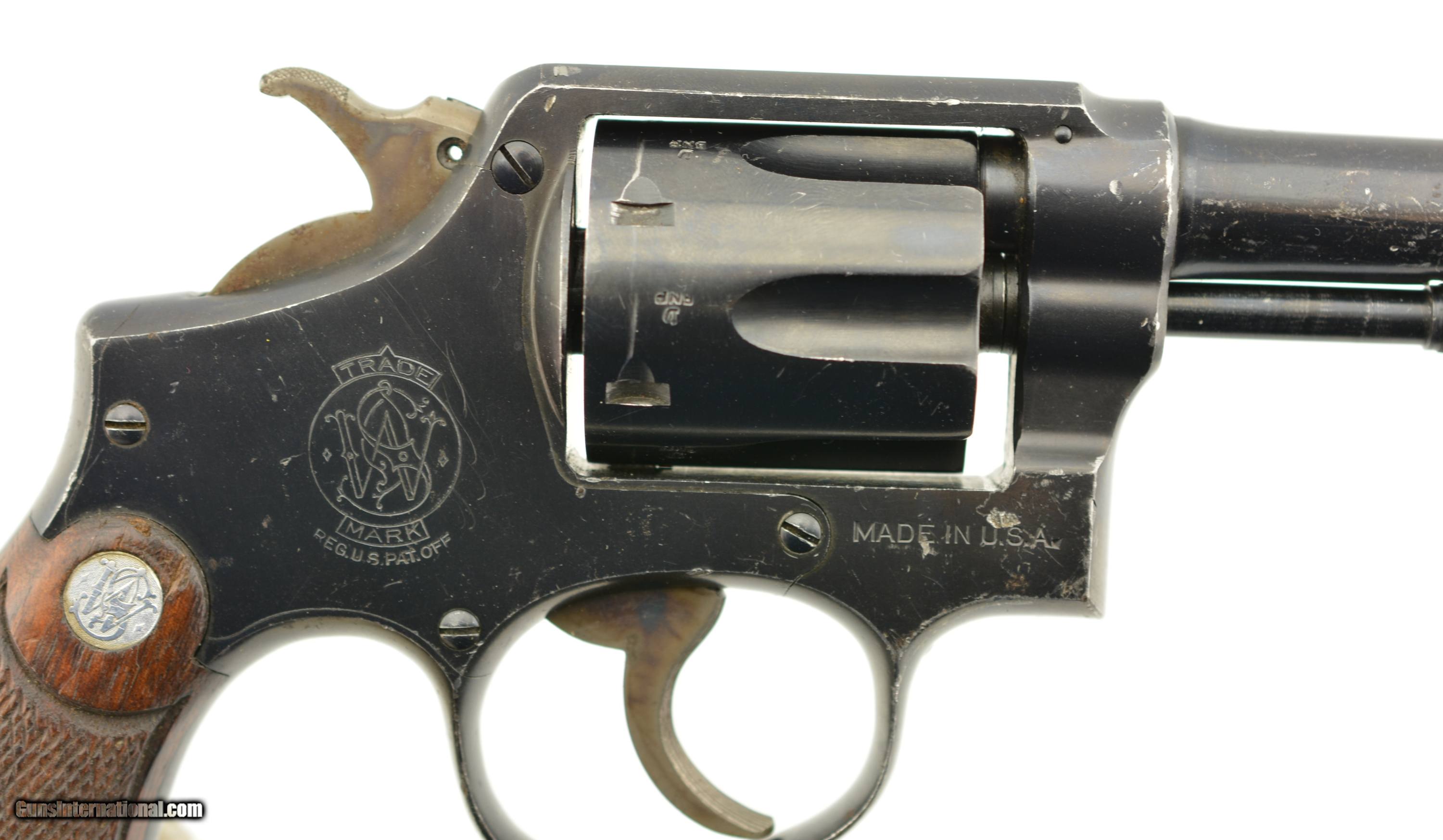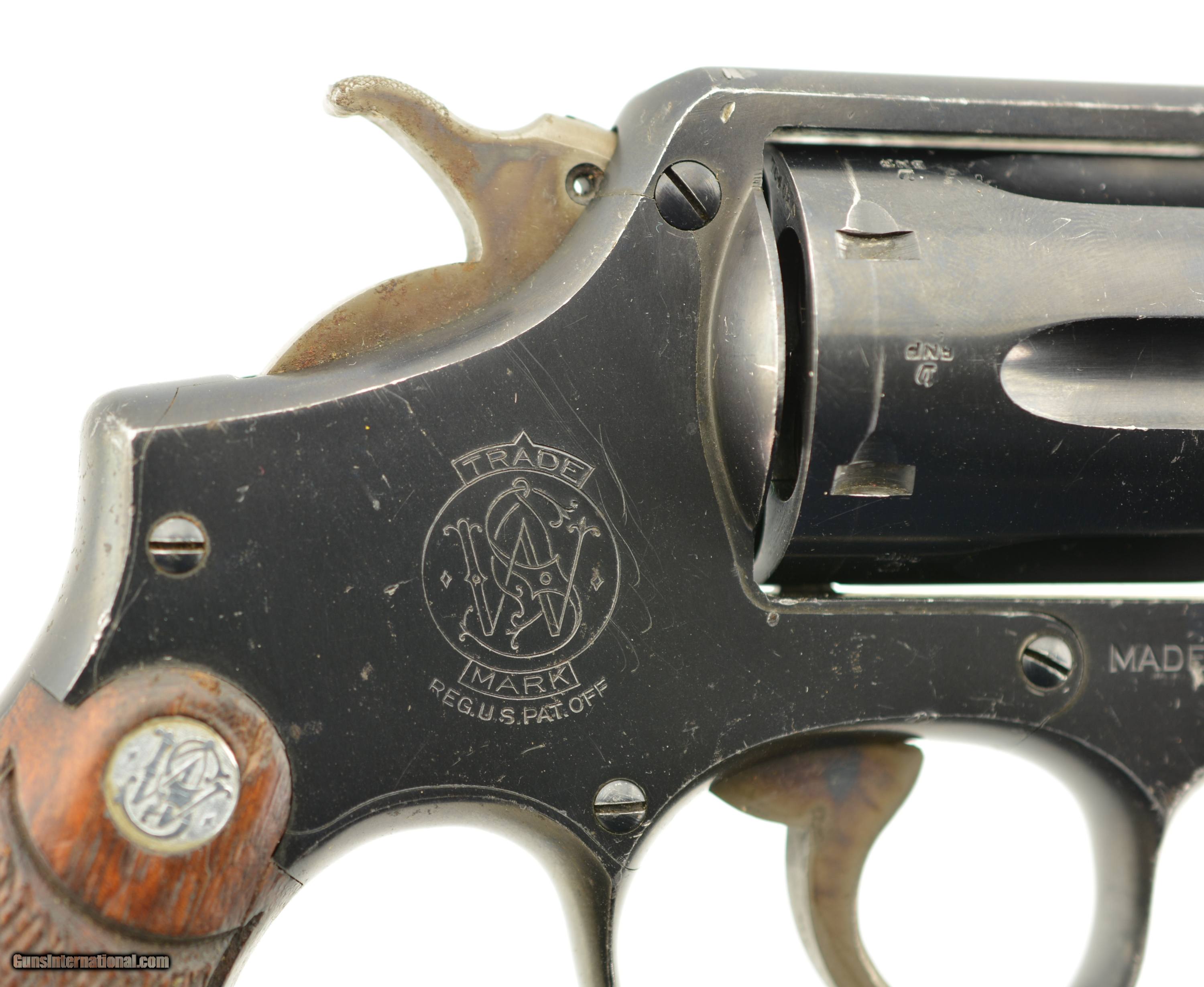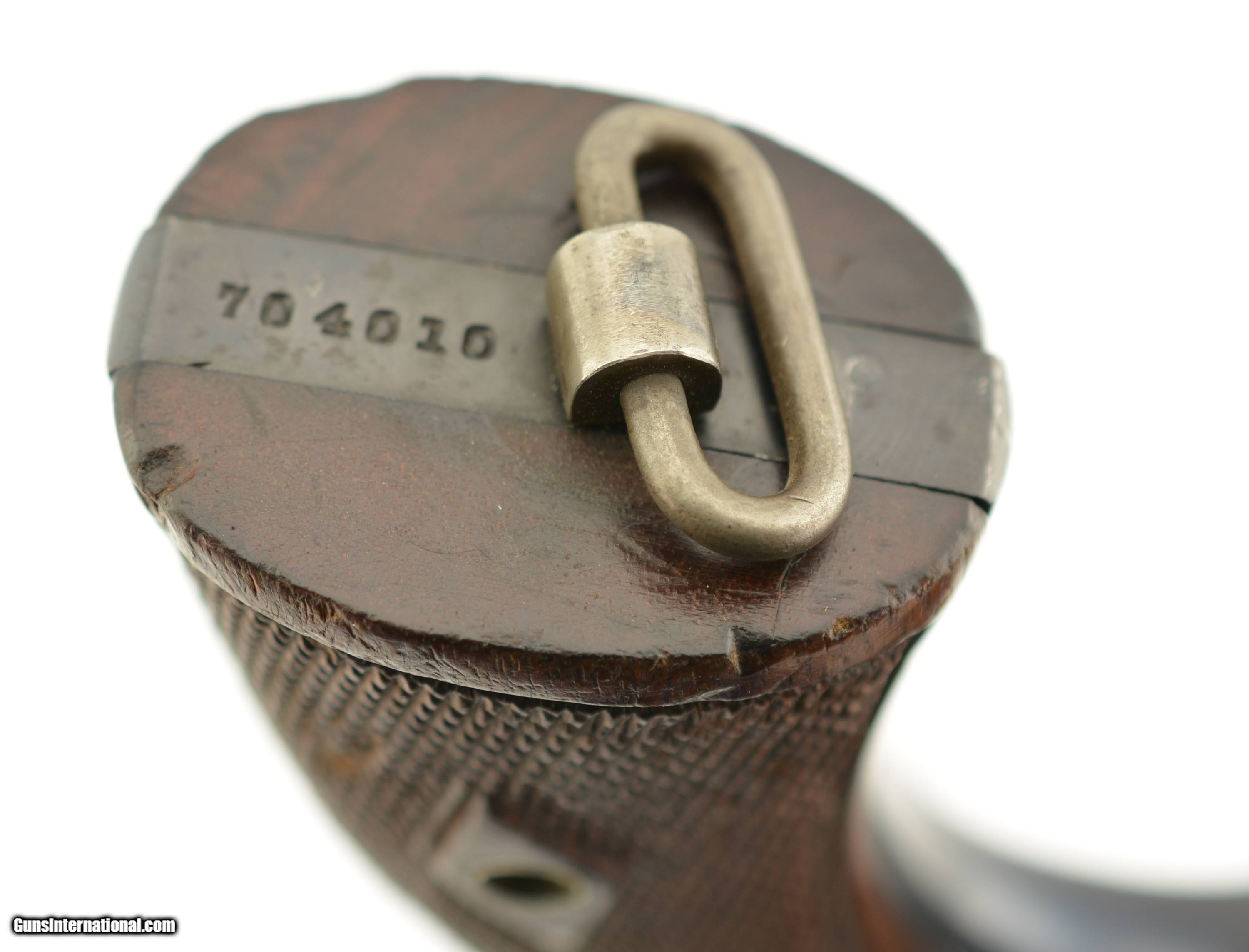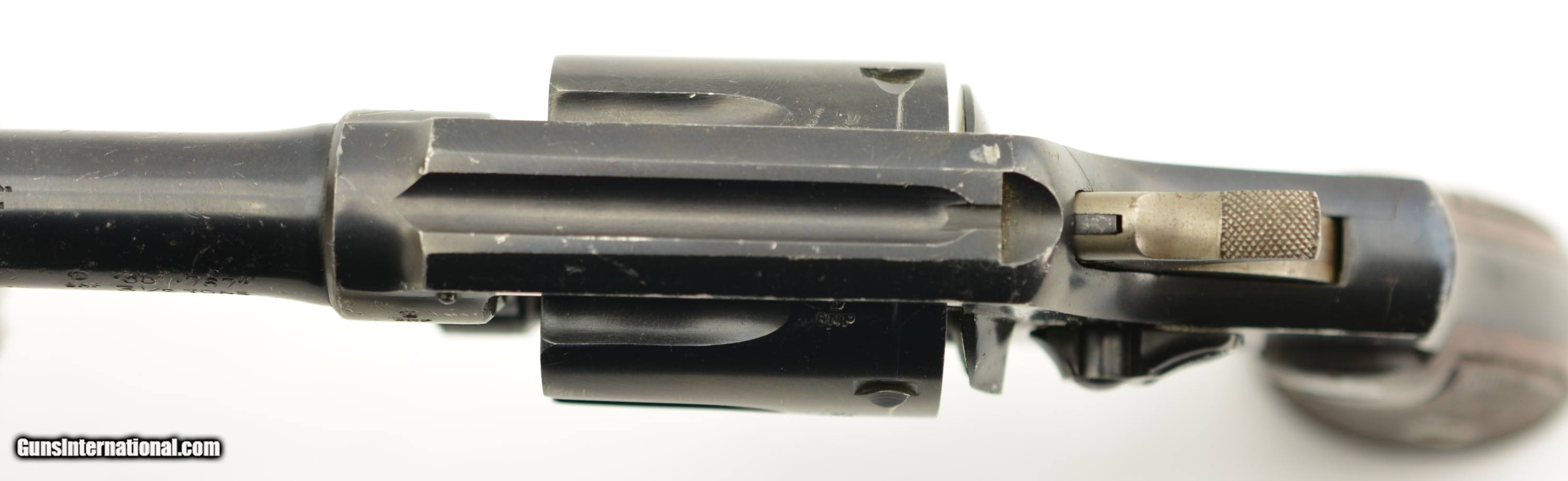 Description: Serial #704010, .38 S&W, 6" barrel with an excellent, bright bore. This is one of the early pre-prefix revolvers and has matching numbers on the frame, barrel, cylinder, yoke, and extractor. The metal retains about 90-92% of the original "Black Magic" finish with scratches and silvering along the barrel, as well as along the high edges and bearing surfaces. The hammer and trigger have retained about 80-85% of the original color case-hardening, and extensive post-war Birmingham commercial proofs are present on the barrel, frame, and cylinder. The checkered walnut, diamond-center grips are numbered to the gun on the interior, and are in good-near very good condition with some flattening of the points, and small chips missing around the butt. The lock-up is still tight, and the original lanyard swivel is still in place. This is a fine example of a WW2 British contract S&W, and would make a great addition to any collection. FFL or C&R SOLD Curio/Relic: Yes Manufacturer: S&W Model: 1905 Serial Number: 704010 Caliber Info: .38 S&W Gauge Info: .38 S&W |
