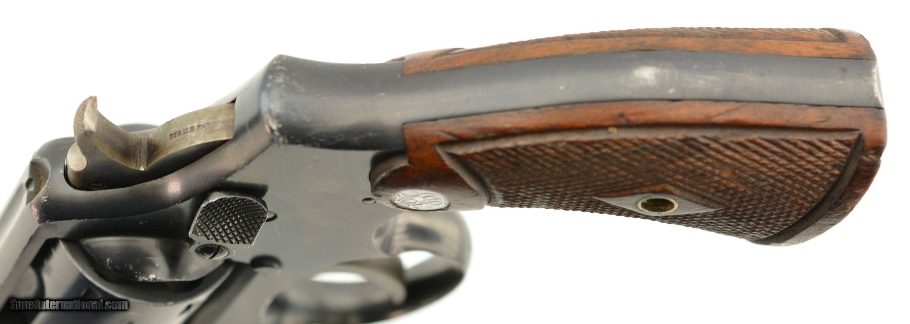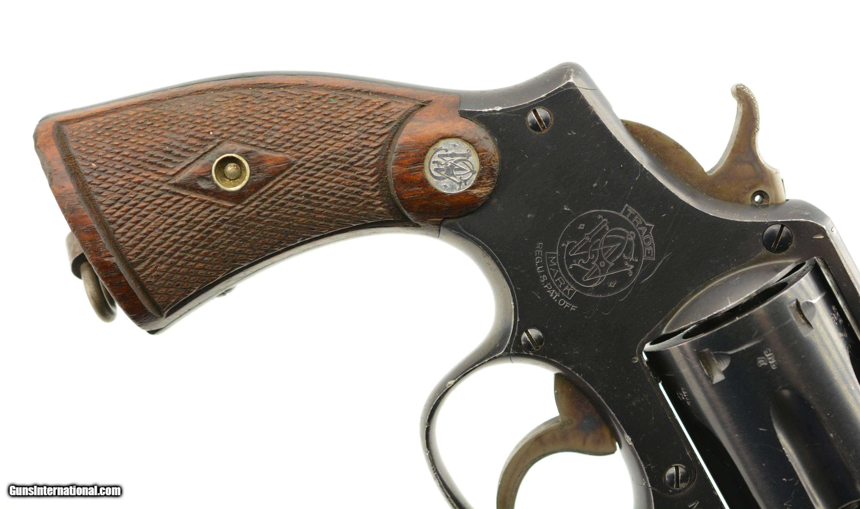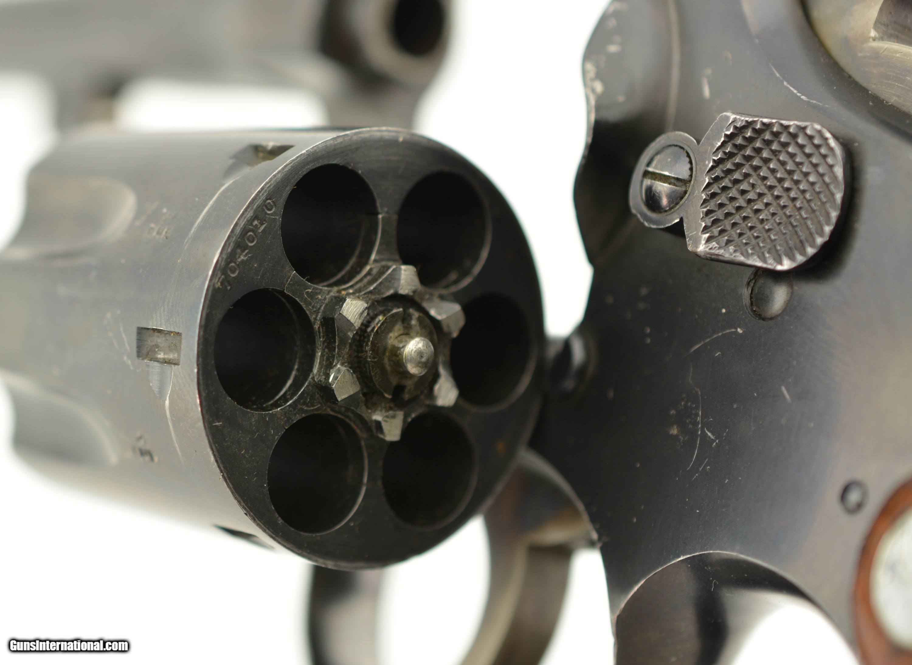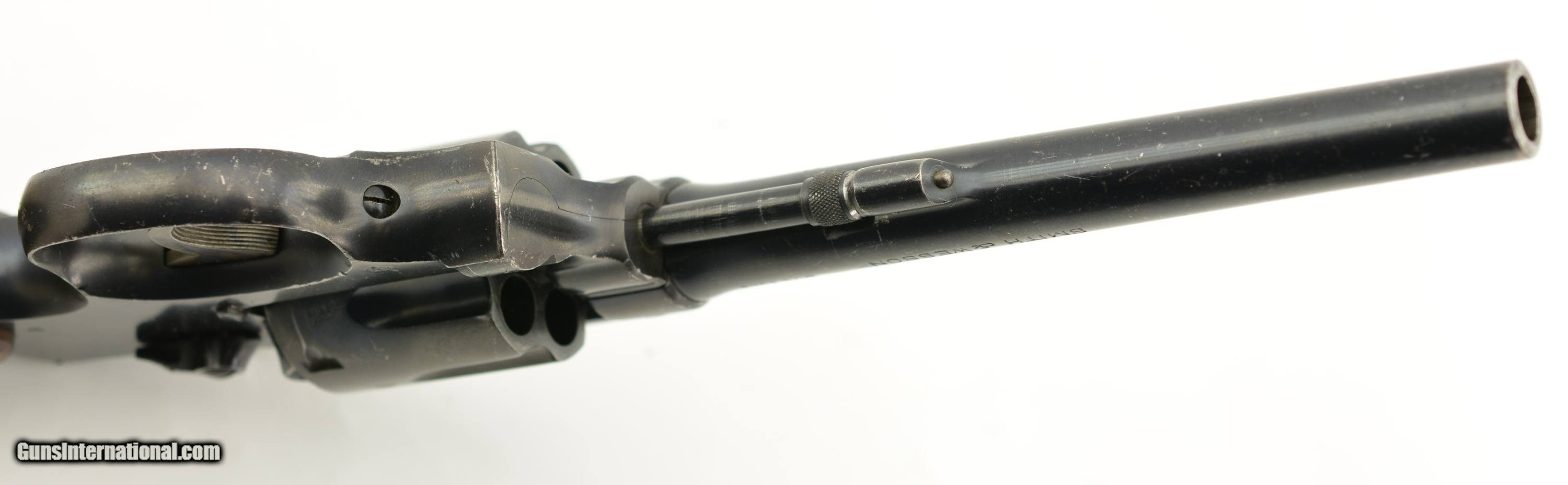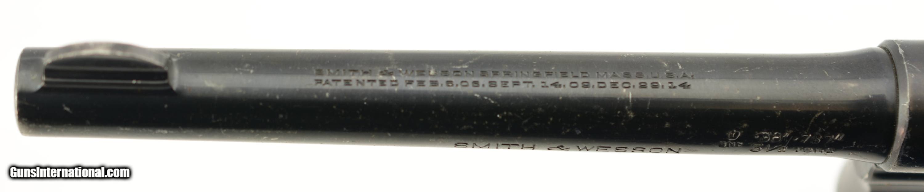 Description: Serial #704010, .38 S&W, 6" barrel with an excellent, bright bore. This is one of the early pre-prefix revolvers and has matching numbers on the frame, barrel, cylinder, yoke, and extractor. The metal retains about 90-92% of the original "Black Magic" finish with scratches and silvering along the barrel, as well as along the high edges and bearing surfaces. The hammer and trigger have retained about 80-85% of the original color case-hardening, and extensive post-war Birmingham commercial proofs are present on the barrel, frame, and cylinder. The checkered walnut, diamond-center grips are numbered to the gun on the interior, and are in good-near very good condition with some flattening of the points, and small chips missing around the butt. The lock-up is still tight, and the original lanyard swivel is still in place. This is a fine example of a WW2 British contract S&W, and would make a great addition to any collection. FFL or C&R SOLD Curio/Relic: Yes Manufacturer: S&W Model: 1905 Serial Number: 704010 Caliber Info: .38 S&W Gauge Info: .38 S&W |