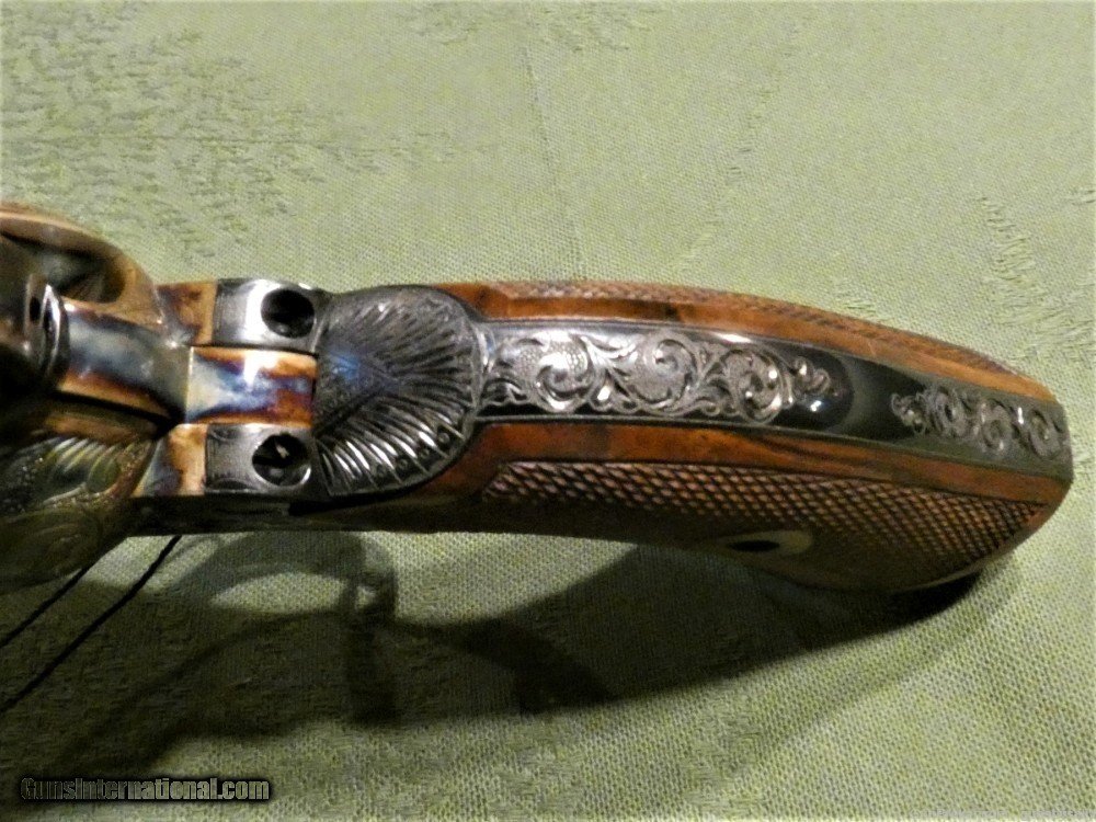 Description: Guns by Sally-always the best for less. We are right proud to offer this stunning deluxe version of Standard's single action wheel gun. These are very well made revolvers, and the quality is apparent as soon as you pick it up. With rich, deep blue, vivid case colored frame, and finely checkered rosewood grips. The screws are fire blued, and are atually timed, which I have not seen on any other revolver. The engraving is a sight to behold, with lots of coverage and mighty fine detail. This one is fresh from Connecticut, with all literature, the trigger guard tag, and the factory box and cardboard sleeve. The 5 1/2 inch gunfighter length barrel is chambered in .45 long Colt. There are a few light handling marks on the grips. She came in with the hammer tethered, and she will go out the same way, unturned and unfired. These fine guns are sure to gather collector attention as time goes on, and the engraved version has instant value. Getting in early with a 3 digit serial number doesn't hurt, either. If you have been looking for the right Standard Manufacturing SAA to collect or for investment, but want the added clout of a finely engraved gun, then look no further. SOLD Handgun Caliber: .45 Colt |