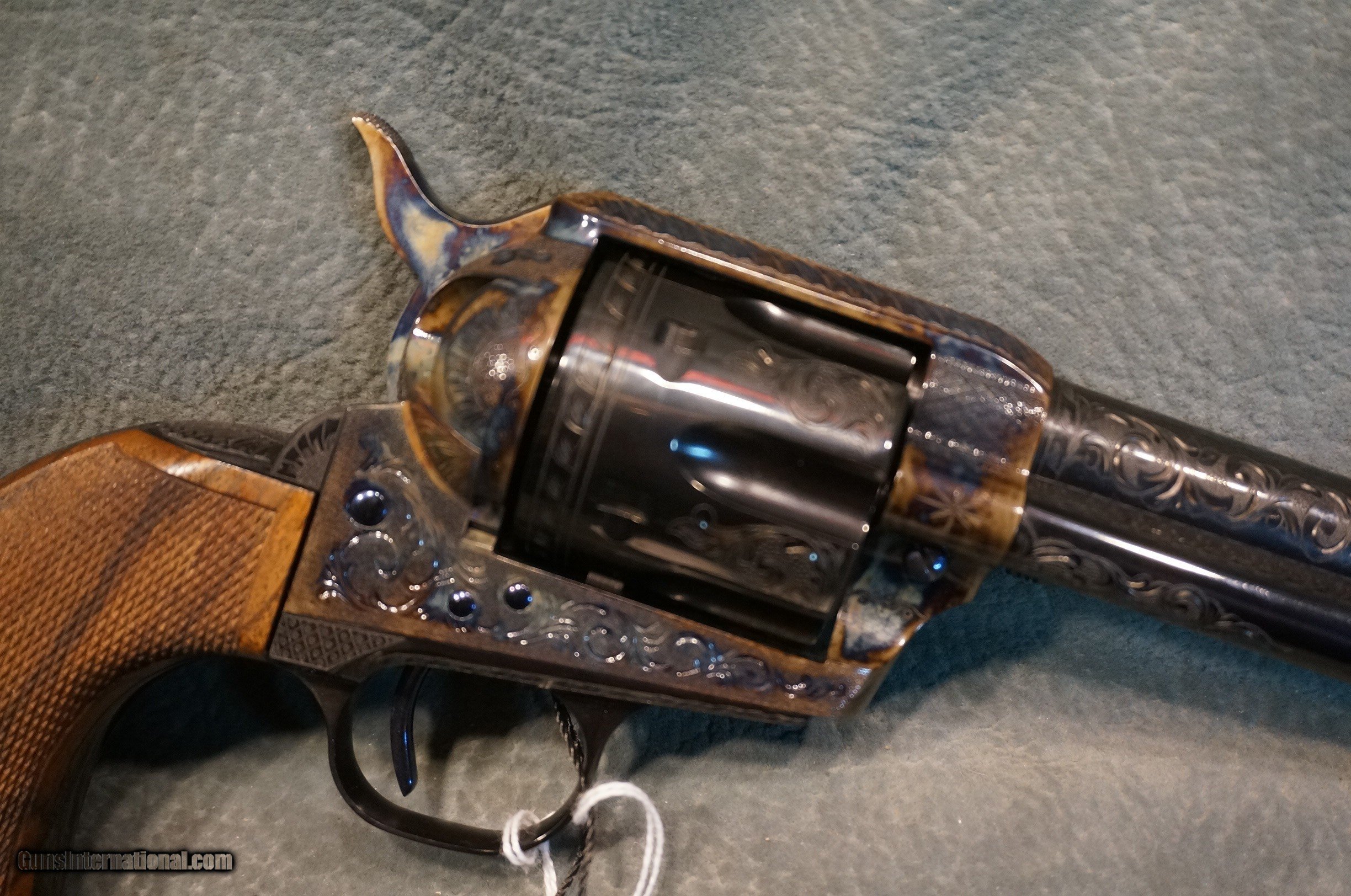 Description: Standard Arms SAA 45LC 5 1/2" barrel,blue/casecolored with fire blued screws,fully factory hand engraved with scroll and borders,deluxe checkered wood grips,great workmanship to rival Colt or USFA,new in the box with papers. GUN COLLECTIONS WANTED FOR CASH! We buy, sell, consign and trade new and used firearms.We will pay finders fees and travel for large collections. This is our 46th year in business. We offer 90 day layaways with 20% down. No return on layaways. Firearms will need to be transferred through a FFL dealer. Prices reflect a cash discount. There will be 3% added to credit card sales. We trade for gold and silver. THANK YOU! SOLD |