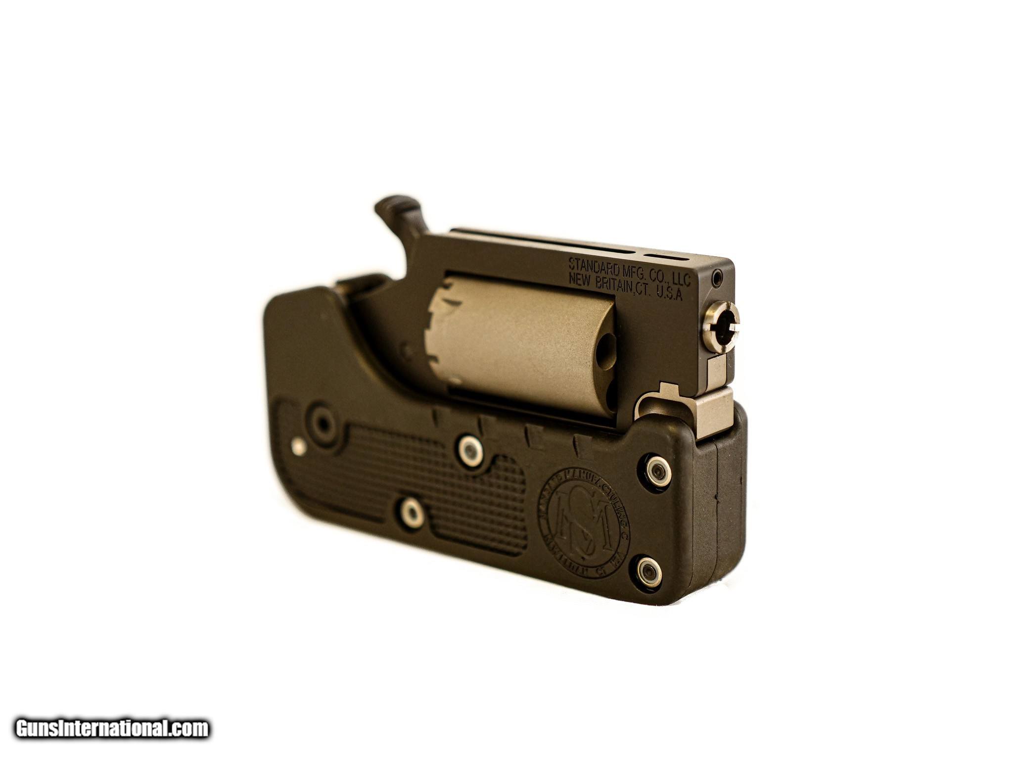 Description: THE STANDARD MANUFACTURING SWITCH-GUN™ The revolutionary new SWITCH GUN is the latest advancement in personal protection from Standard Manufacturing. The SWITCH GUN fits into your pocket and occupies about the same amount of space as your cell phone. When in the folded position, the grip of the SWITCHGUN completely encapsulates the trigger to prevent any type of accidental discharge. Upon depressing a button the SWITCHGUN immediately springs open as is ready for the immediate and reliable discharge of five .22 Magnum cartridges. When not in use, the SWITCHGUN can be folded into a very small form factor and stored in your pocket to conceal. Unlike any of it's competitors, the SWITCHGUN features a large handle to provide a tremendous amount of grip similar to a full-sized revolver which provides the highest degree of control and accuracy. TECHNICAL SPECIFICATIONS