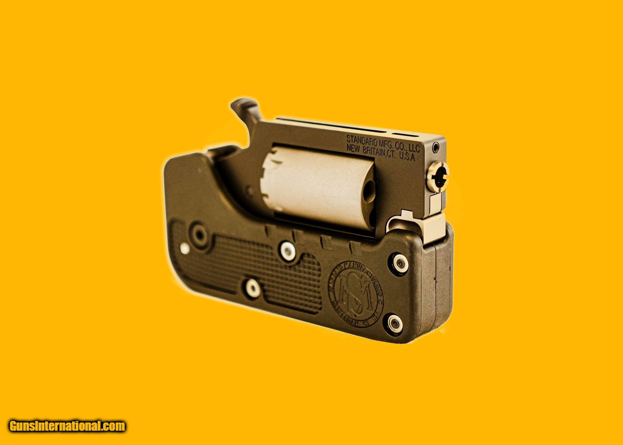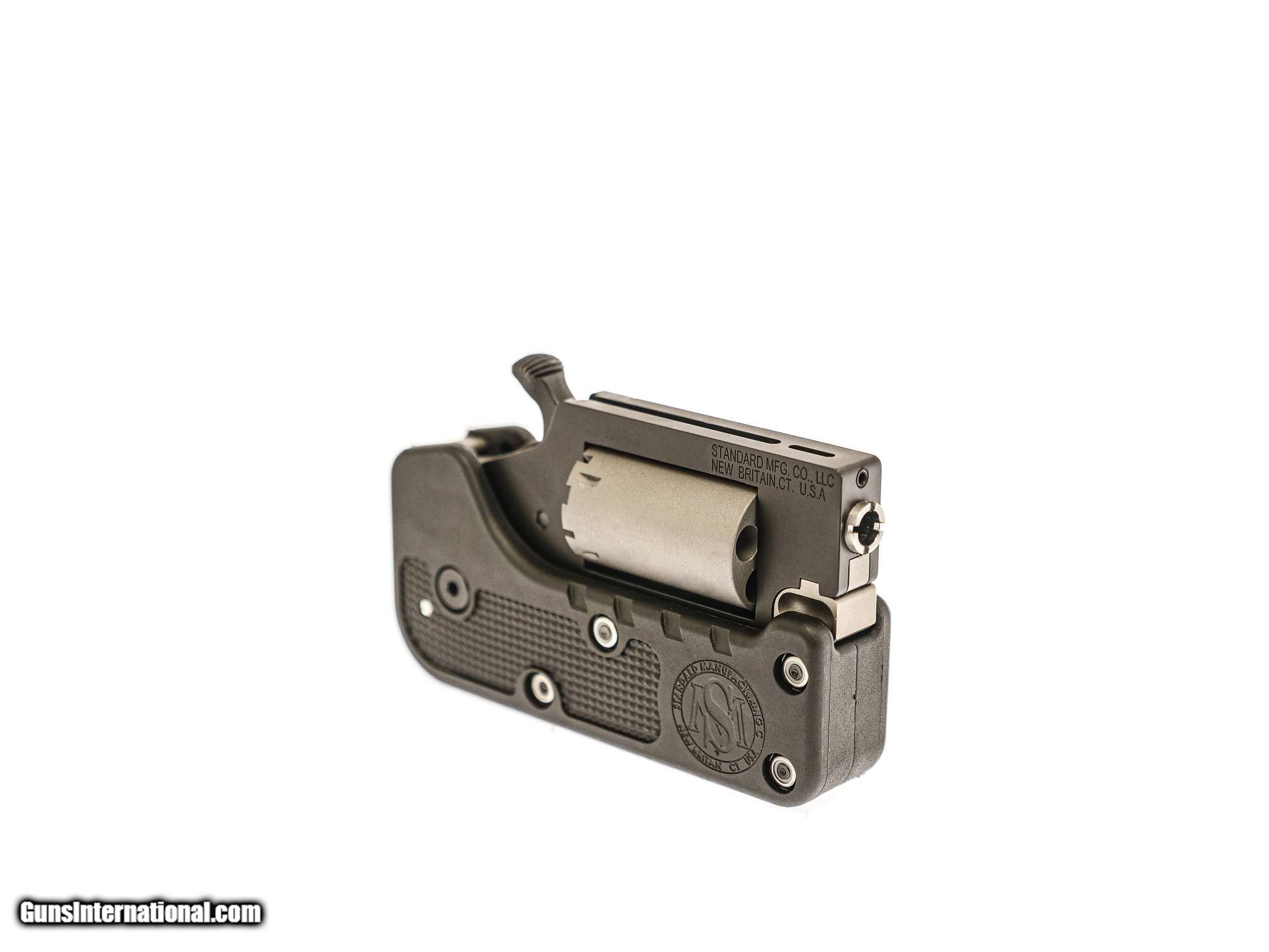 Description: NOTE: THIS GUN IS NOT YET LEGAL IN THE FOLLOWING STATES: CA, MA, MD. THE STANDARD MANUFACTURING SWITCH-GUN™ The revolutionary new SWITCH GUN is the latest advancement in personal protection from Standard Manufacturing. The SWITCH GUN fits into your pocket and occupies about the same amount of space as your cell phone. When in the folded position, the grip of the SWITCHGUN completely encapsulates the trigger to prevent any type of accidental discharge. Upon depressing a button the SWITCHGUN immediately springs open as is ready for the immediate and reliable discharge of five .22 Magnum cartridges. When not in use, the SWITCHGUN can be folded into a very small form factor and stored in your pocket to conceal. Unlike any of it's competitors, the SWITCHGUN features a large handle to provide a tremendous amount of grip similar to a full-sized revolver which provides the highest degree of control and accuracy. TECHNICAL SPECIFICATIONS