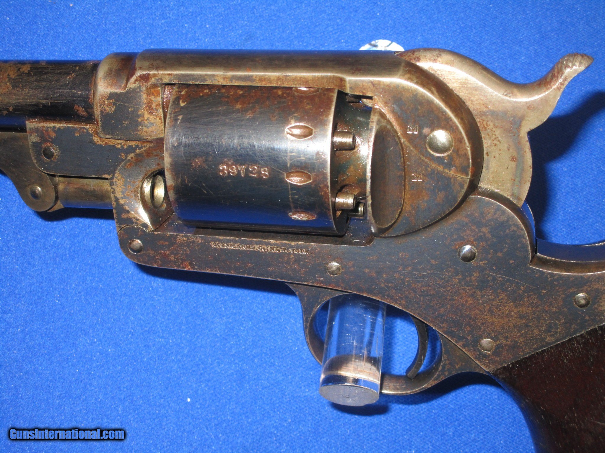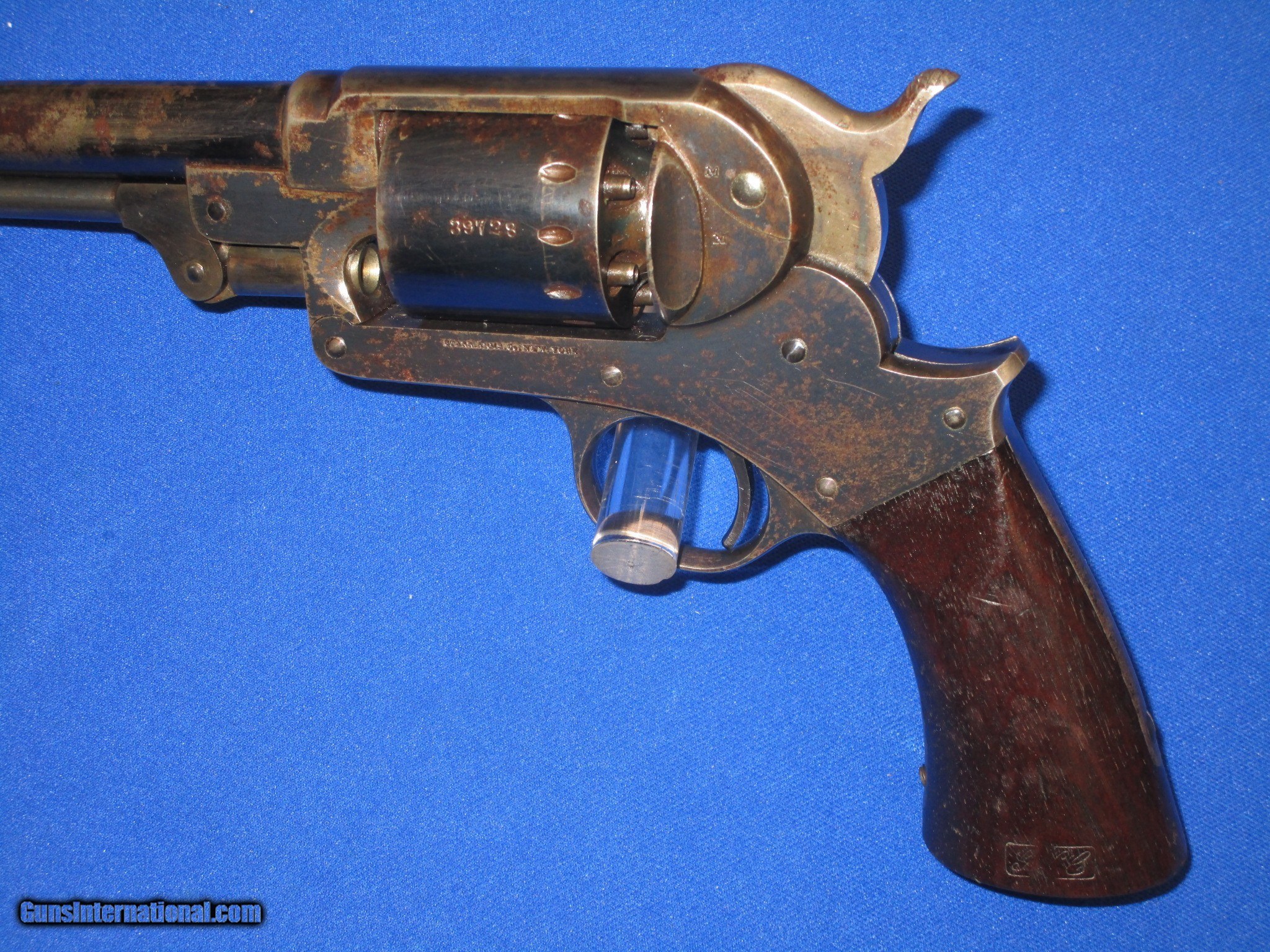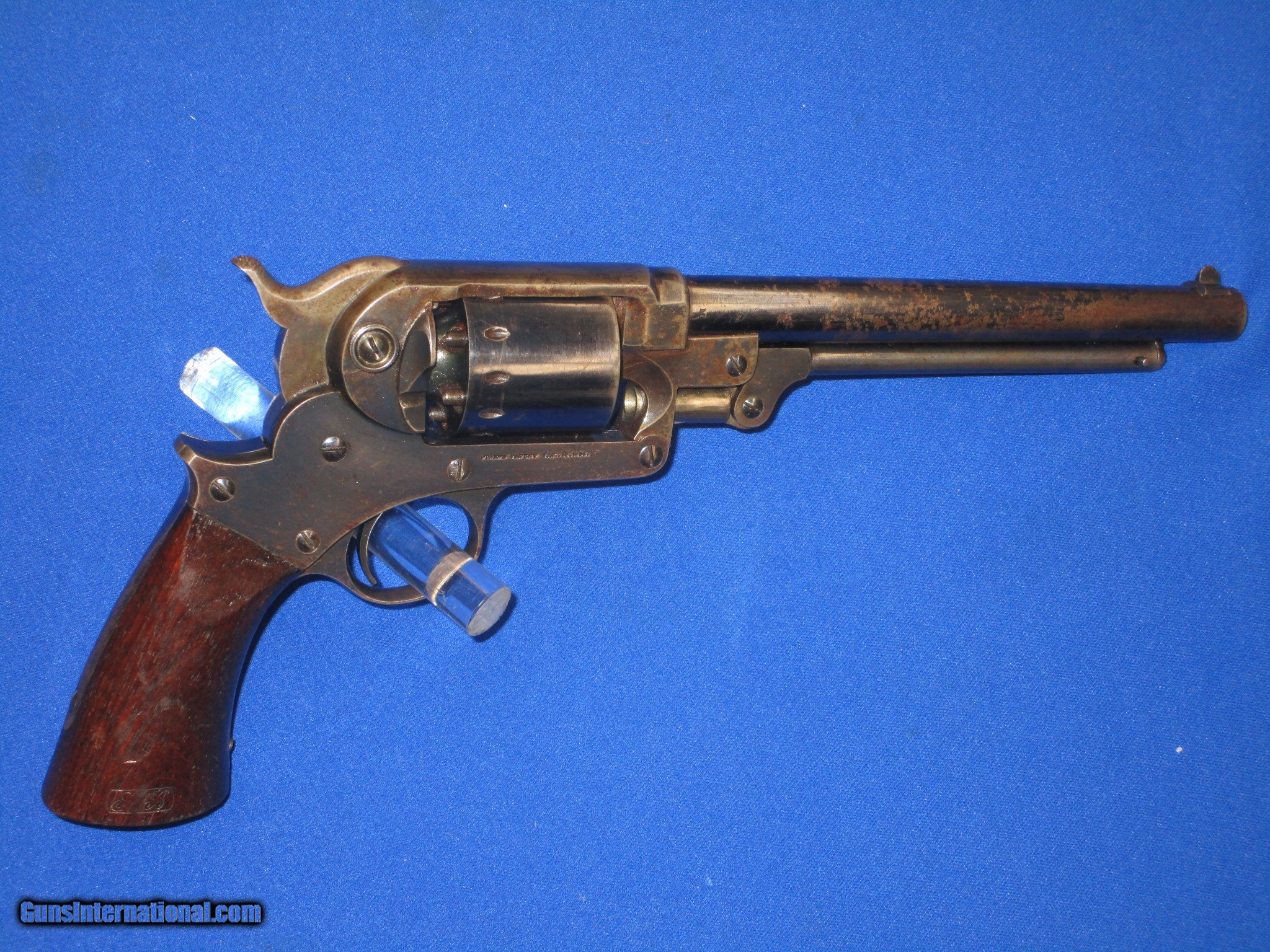 Description: A U.S. CIVIL WAR MILITARY ISSUED PERCUSSION STARR ARMS CO. MODEL 1863 S/A ARMY REVOLVER IN FINE PLUS TO EXCELLENT CONDITION. SERIAL #39,728, ALL MATCHING NUMBERS. ALL ORIGINAL AND COMPLETE. THE REVOLVER HAS EXCELLENT METAL AND MARKINGS THROUGHOUT. ALL EDGES ARE CRISP. IT IS FULLY U.S. SUB INSPECTED. THE BARREL RETAINS MOST OF ITS ORIGINAL BLUE WITH SOME AREAS SHOWING WEAR MOST LIKELY FROM A HOLSTER. THE CYLINDER AND FRAME BOTH RETAIN NEARLY ALL OF THEIR ORIGINAL FACTORY BLUE FINISH WITH THE TOP OF THE FRAME FADING INTO A PLUM BLUE COLOR. THE TRIGGER GUARD AND BACKSTRAP HAVE AN EVEN MIX OF ORIGINAL BLUE AND NATURAL PLUM BROWN PATINA ON THEM. THE LOADING LEVER AND HAMMER RETAIN MOST OF THEIR ORIGINAL CASE COLORS. ALL SCREWS ARE EXCELLENT AND RETAIN THEIR FIRE BLUE FINISH. THE ORIGINAL GRIP ARE EXCELLENT THROGHOUT AND HAVE A CLEAR U.S. INSPECTORS CARTOUCHE ON EACH SIDE. IT HAS AN EXCELENT BORE AND ACTION. THIS IS A VERY FINE LOOKING EXAMPLE OF A U.S. CIVIL WAR PERCUSSION STARR ARMS CO. MODEL 1863 S/A ARMY REVOLVER! SOLD Antique: Yes Manufacturer: STARR ARMS CO. Model: 1863 S/A ARMY REVOLVER Serial Number: 39,728 Condition: FINE Metal Condition: FINE Wood Condition: FINE Bore Condition: FINE |