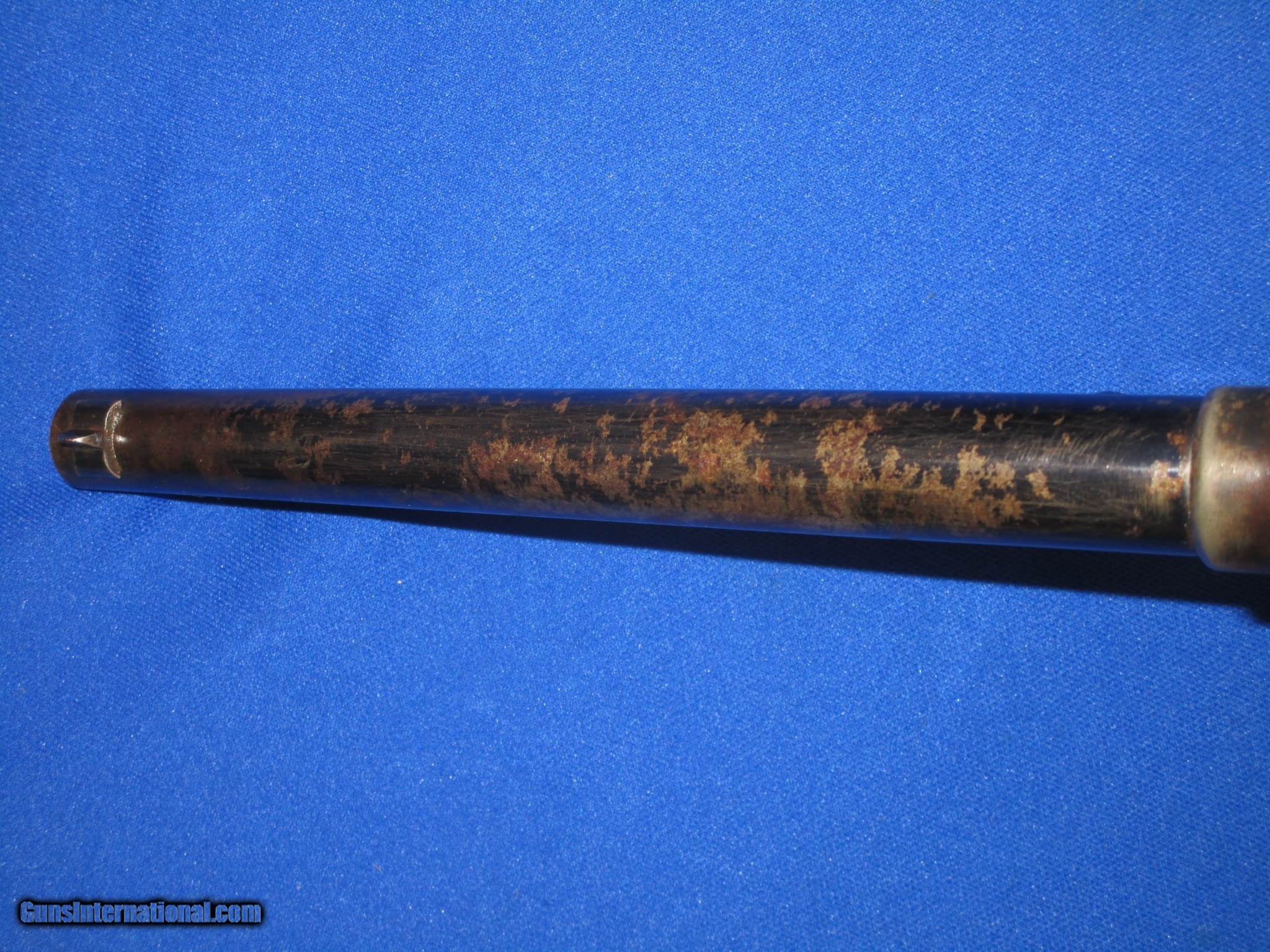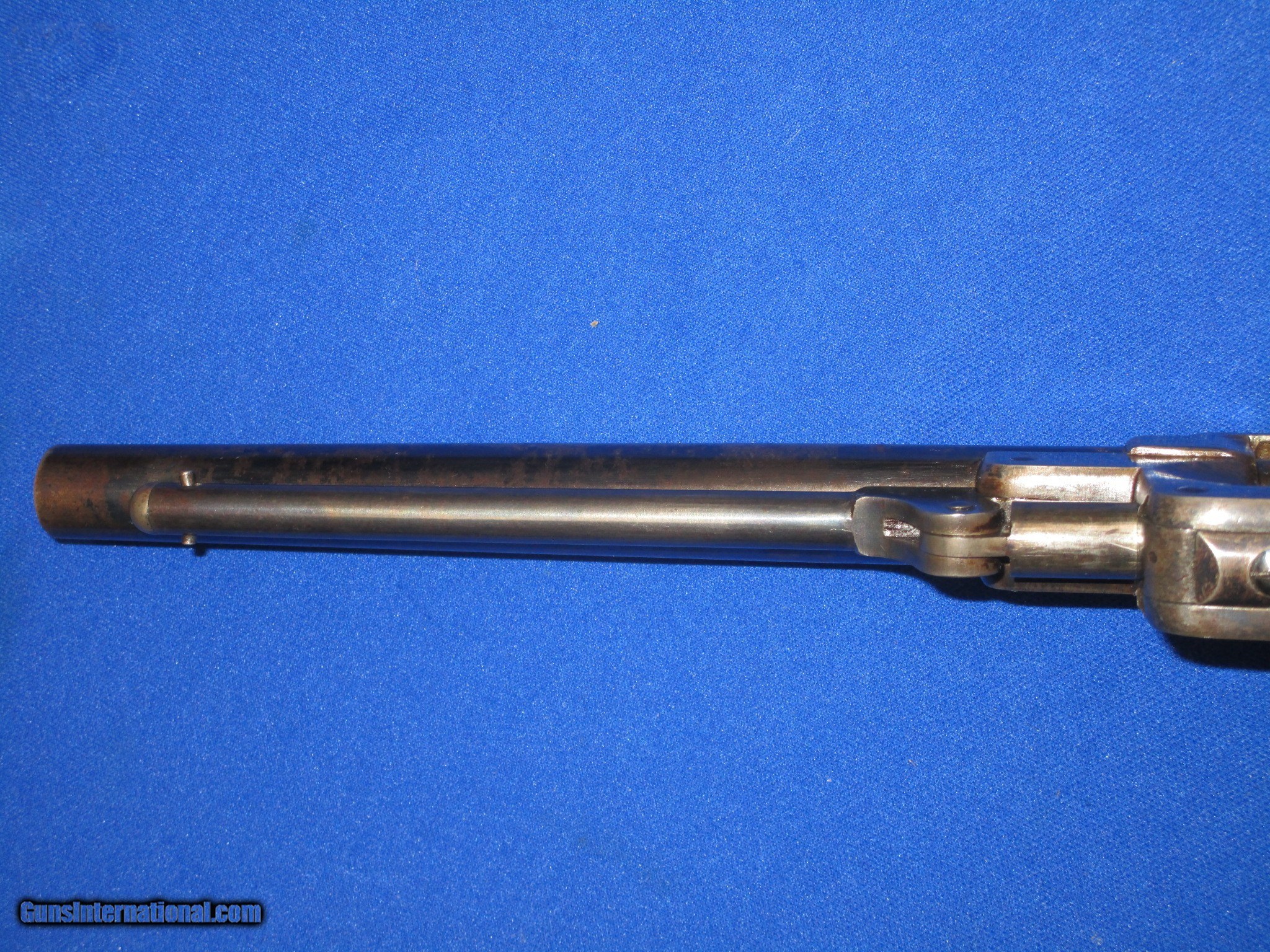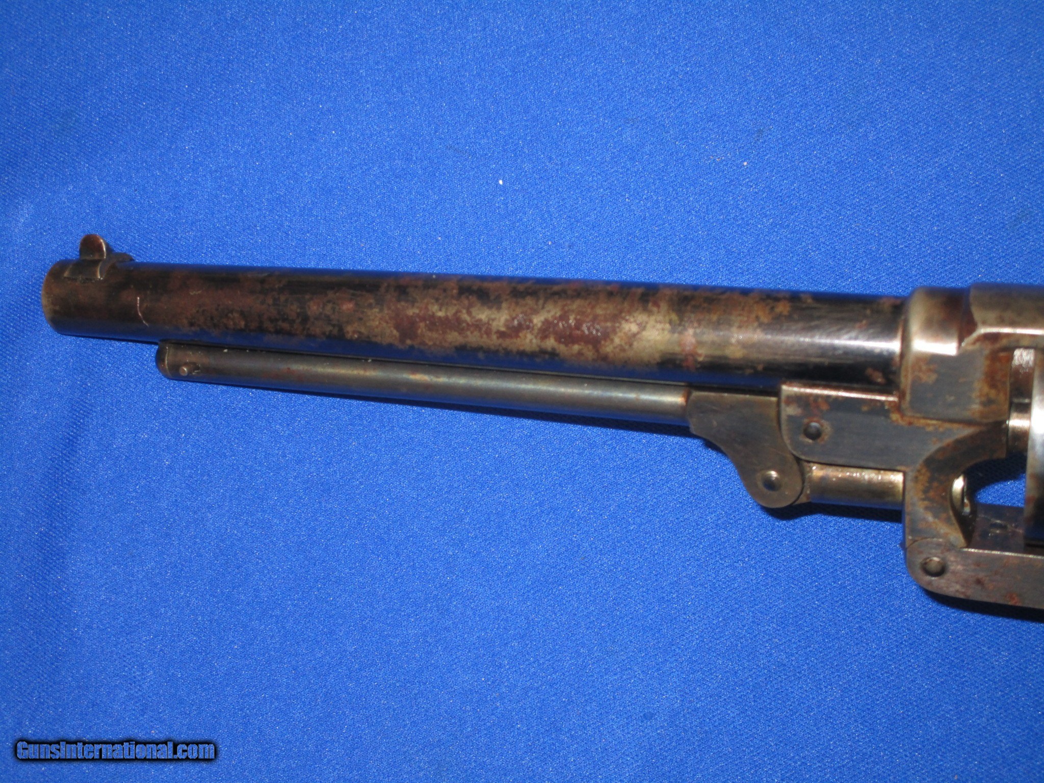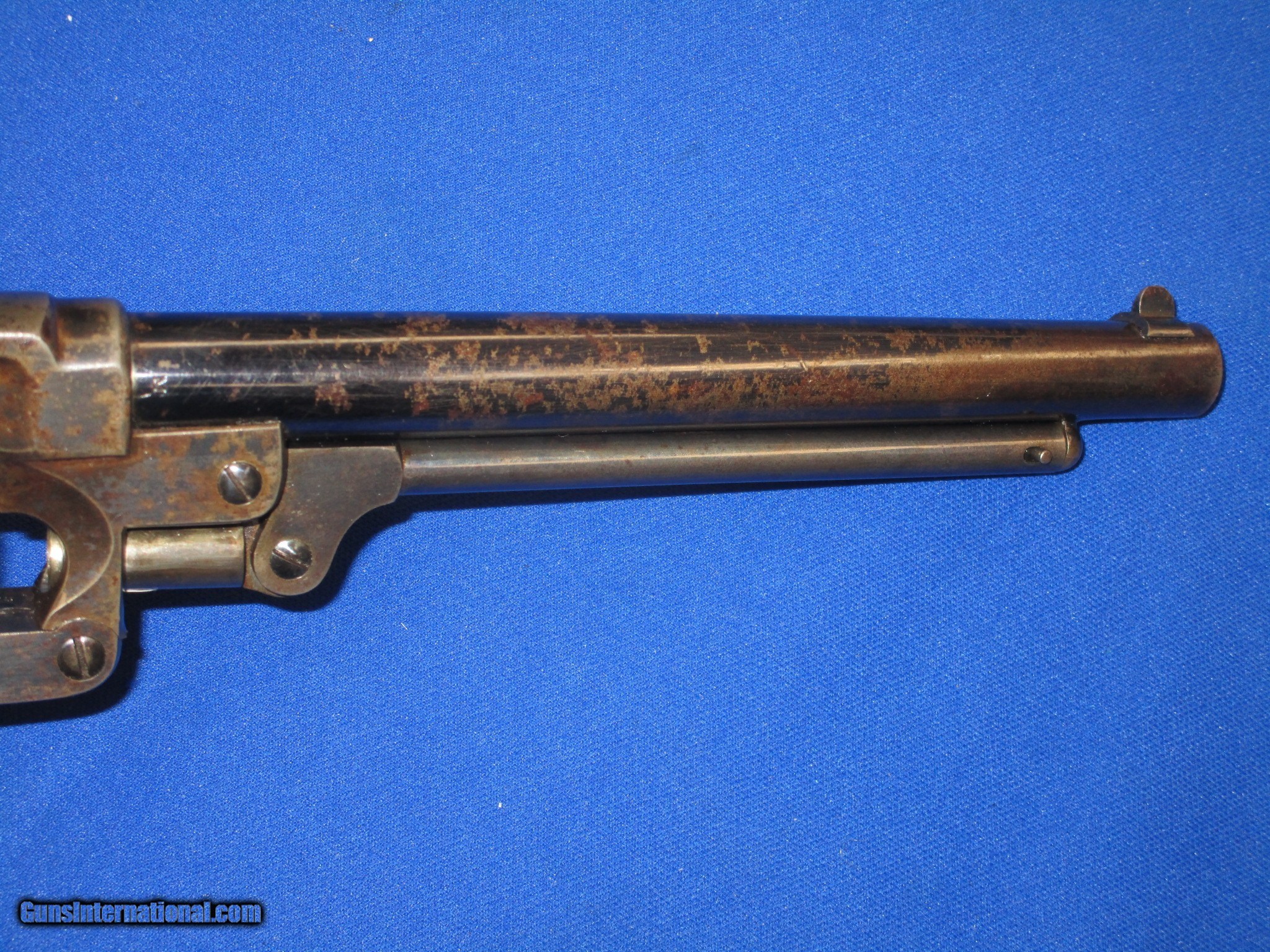 Description: A U.S. CIVIL WAR MILITARY ISSUED PERCUSSION STARR ARMS CO. MODEL 1863 S/A ARMY REVOLVER IN FINE PLUS TO EXCELLENT CONDITION. SERIAL #39,728, ALL MATCHING NUMBERS. ALL ORIGINAL AND COMPLETE. THE REVOLVER HAS EXCELLENT METAL AND MARKINGS THROUGHOUT. ALL EDGES ARE CRISP. IT IS FULLY U.S. SUB INSPECTED. THE BARREL RETAINS MOST OF ITS ORIGINAL BLUE WITH SOME AREAS SHOWING WEAR MOST LIKELY FROM A HOLSTER. THE CYLINDER AND FRAME BOTH RETAIN NEARLY ALL OF THEIR ORIGINAL FACTORY BLUE FINISH WITH THE TOP OF THE FRAME FADING INTO A PLUM BLUE COLOR. THE TRIGGER GUARD AND BACKSTRAP HAVE AN EVEN MIX OF ORIGINAL BLUE AND NATURAL PLUM BROWN PATINA ON THEM. THE LOADING LEVER AND HAMMER RETAIN MOST OF THEIR ORIGINAL CASE COLORS. ALL SCREWS ARE EXCELLENT AND RETAIN THEIR FIRE BLUE FINISH. THE ORIGINAL GRIP ARE EXCELLENT THROGHOUT AND HAVE A CLEAR U.S. INSPECTORS CARTOUCHE ON EACH SIDE. IT HAS AN EXCELENT BORE AND ACTION. THIS IS A VERY FINE LOOKING EXAMPLE OF A U.S. CIVIL WAR PERCUSSION STARR ARMS CO. MODEL 1863 S/A ARMY REVOLVER! SOLD Antique: Yes Manufacturer: STARR ARMS CO. Model: 1863 S/A ARMY REVOLVER Serial Number: 39,728 Condition: FINE Metal Condition: FINE Wood Condition: FINE Bore Condition: FINE |