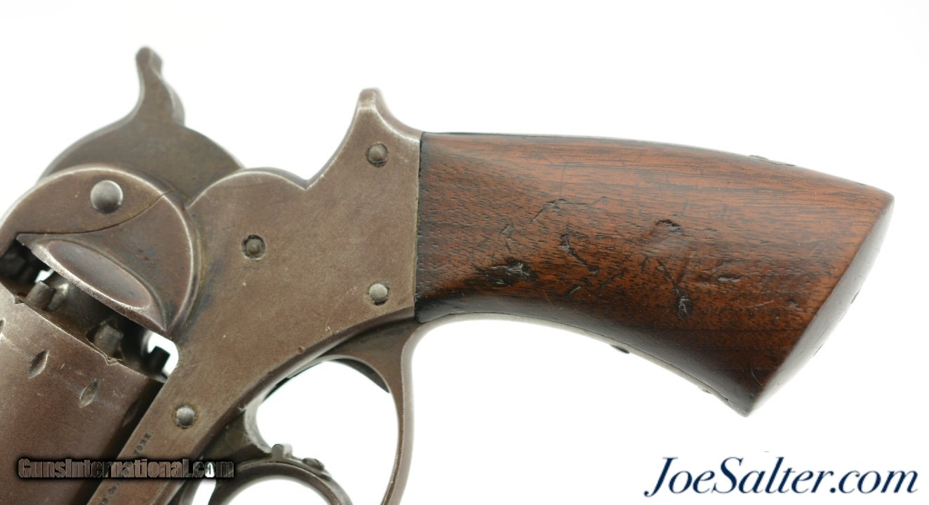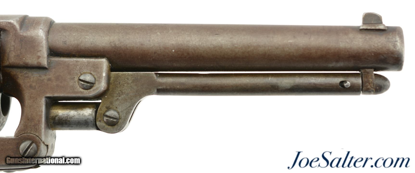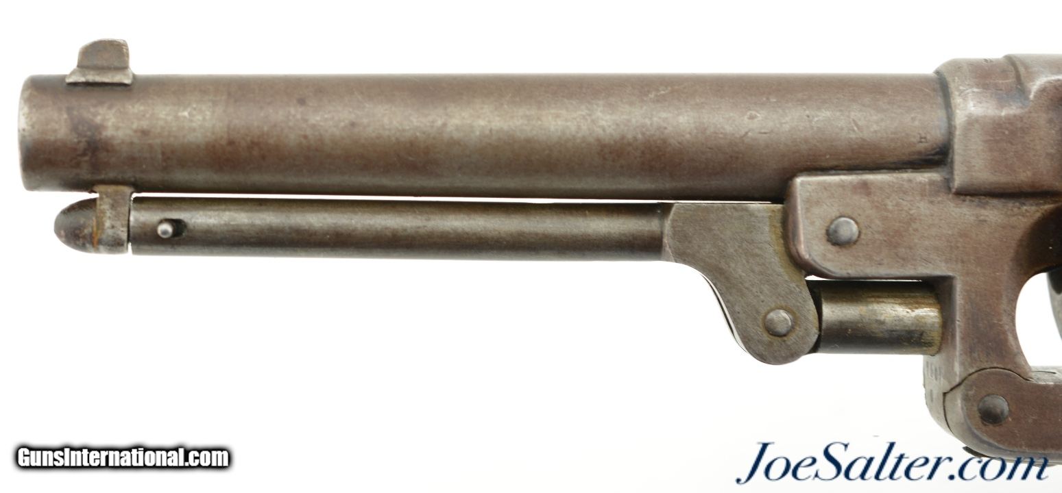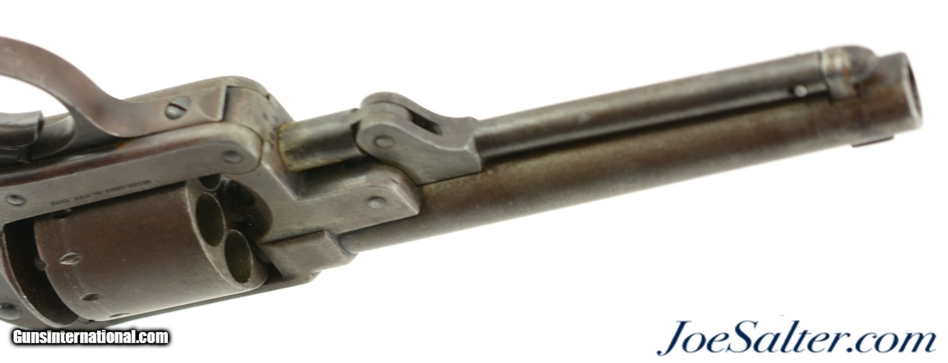Description: Serial #7505, .44 Caliber, 6" barrel with a good bore that has dark freckling within the grooves, and some mild pinprick pitting along its length. This is an attractive revolver that has matching numbers, with an overall smooth plum-brown patina throughout. Some traces of the original blue remain on protected areas, with some further streaks of pewter gray, mostly along the barrel, topstrap, and loading lever. The one-piece walnut grip does not have US inspector marks, and has numerous small handling marks and blemishes in the original oil finish. The lock-up is tight, and the action is fully functional. This is a very nice revolver that has a great antique look, and would make a great piece for display. Antique SOLD Antique: Yes |