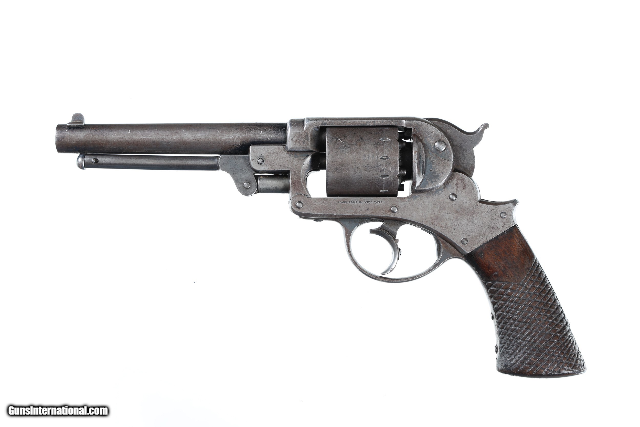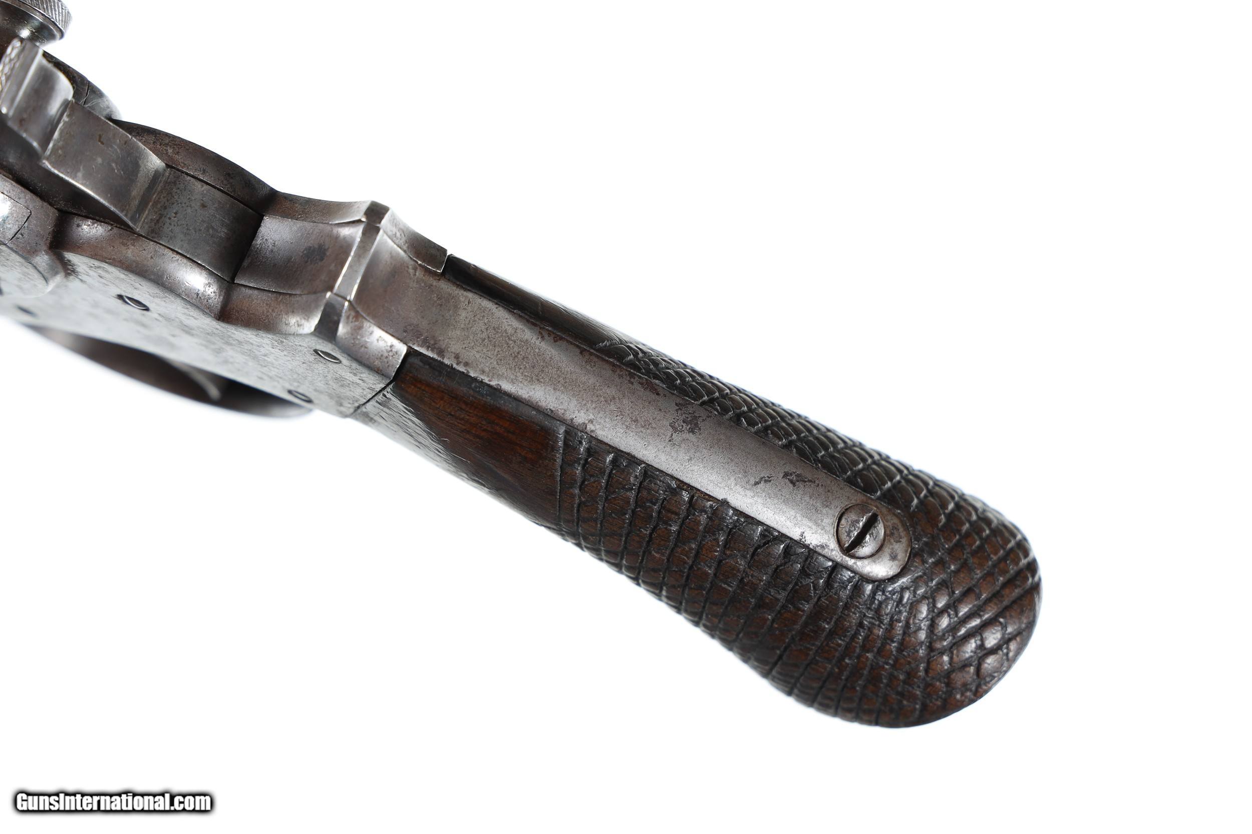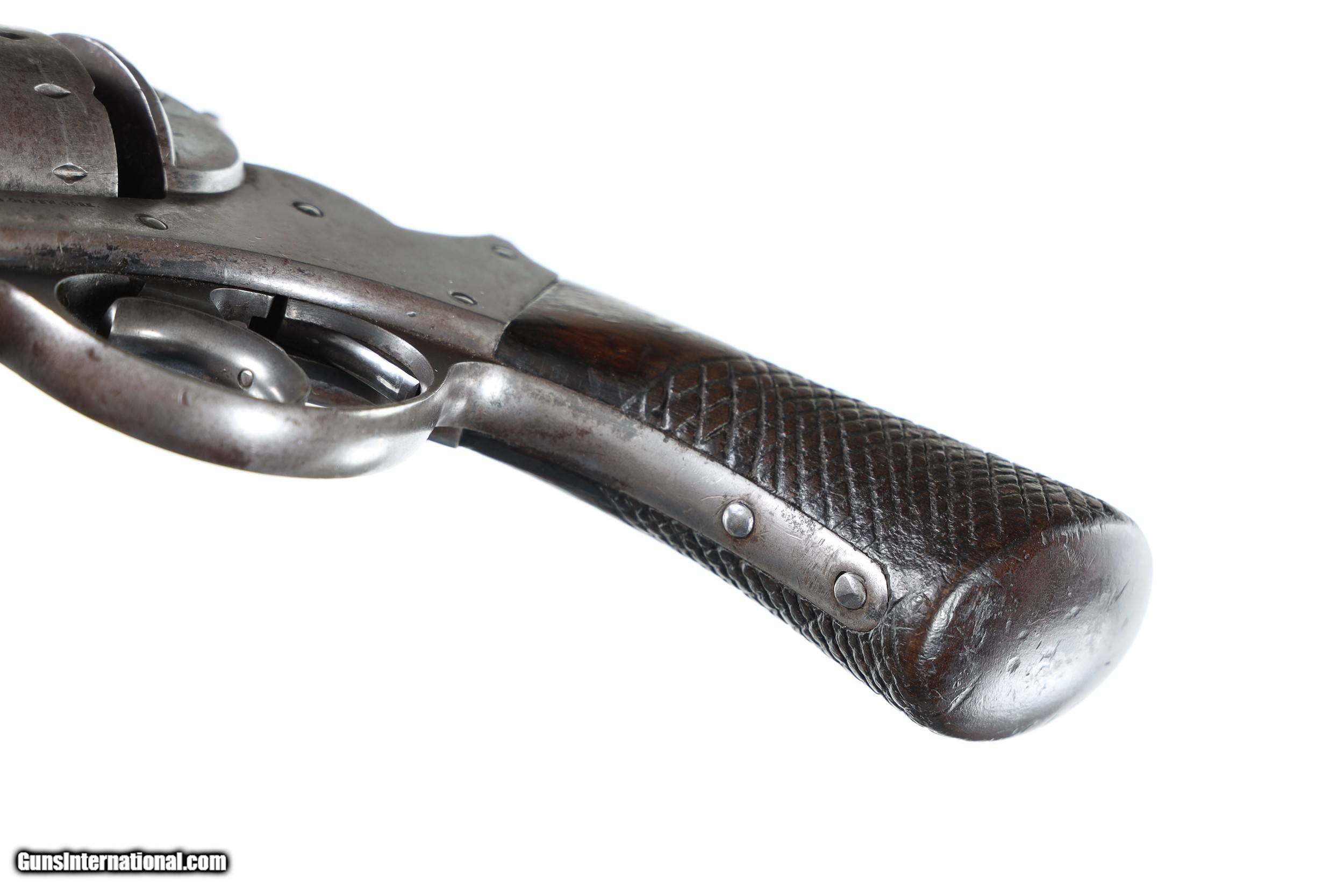 Description: Serial 5981 Bbl, 6" Cal, .44 Percussion. Mfg, Circa 1860. Manufactured during the US Civil war and many purchased by US Gov't and martially marked. Post war the large bore 1858 Starr revolvers found their way west and were used extensively with many being photographed with early western inhabitants. Condition, Good with a mottled dove grey mixed with patina finish. The one piece walnut grips have been period modified with course checkering. The action operates properly in its double action and the bore is strong with some oxidation in the grooves. The grips remain full sized with their period checkering. All legends remain sharp and legible. Antique SOLD Antique: Yes Handgun Caliber: .44 Manufacturer: Starr Arms Model: 1858 Serial Number: 5981 Barrel Length: 6 |