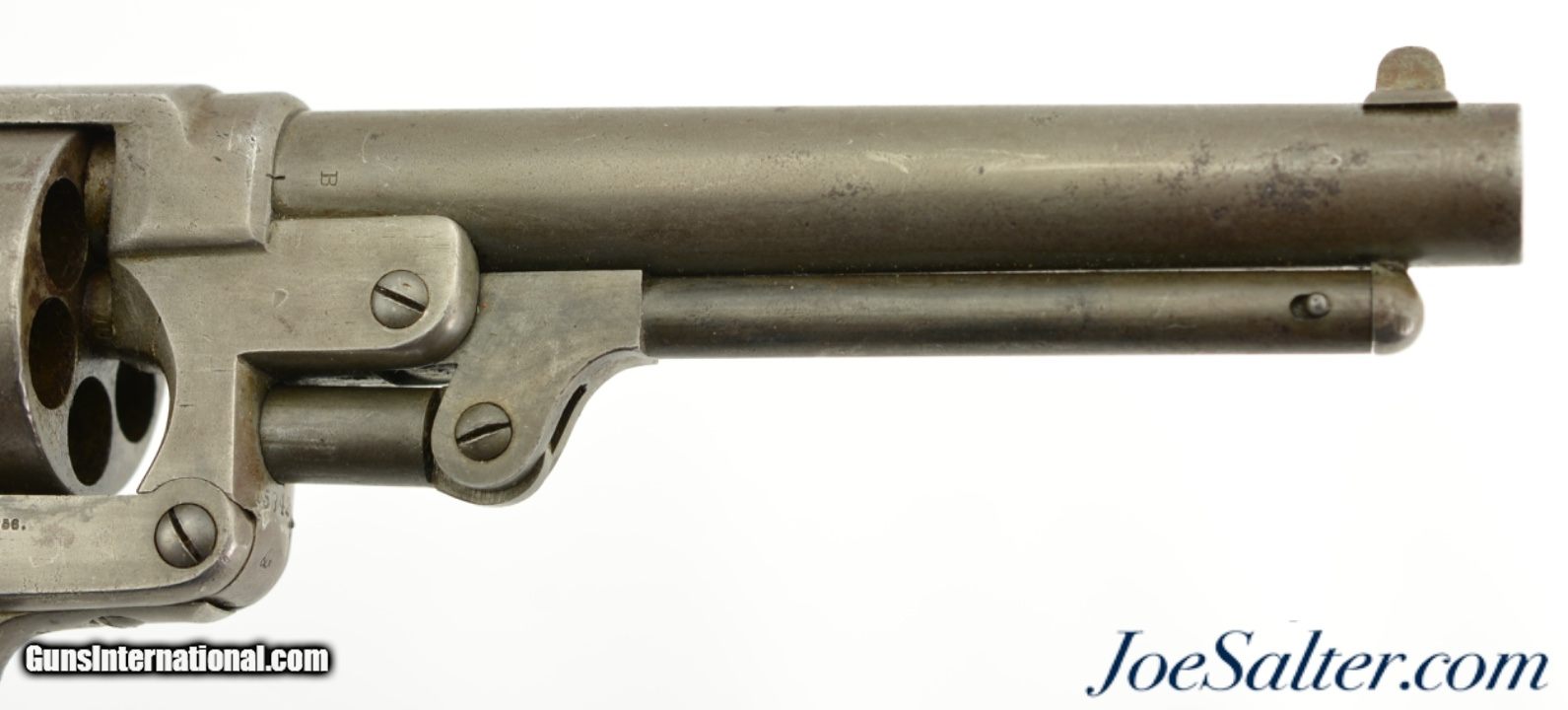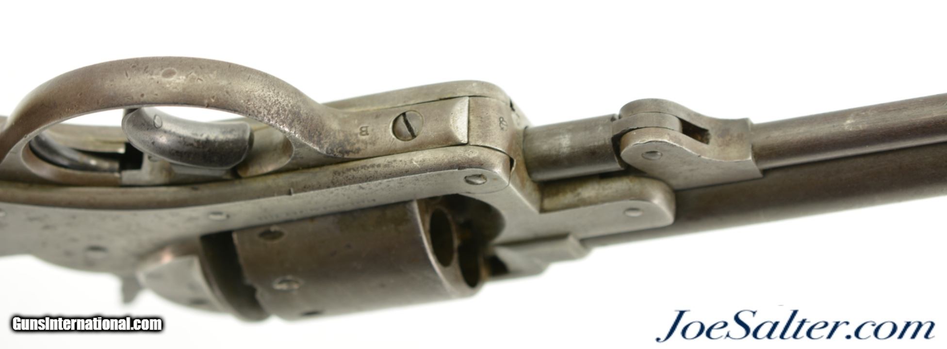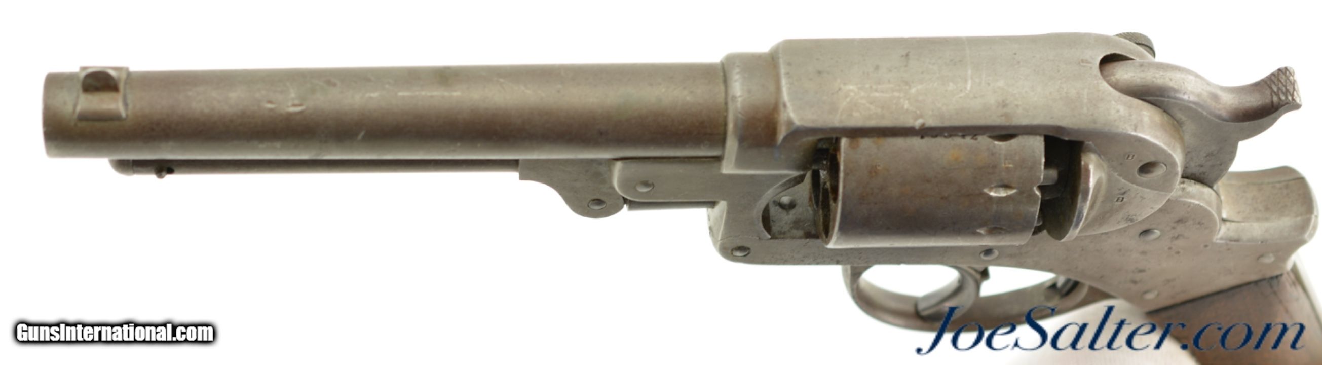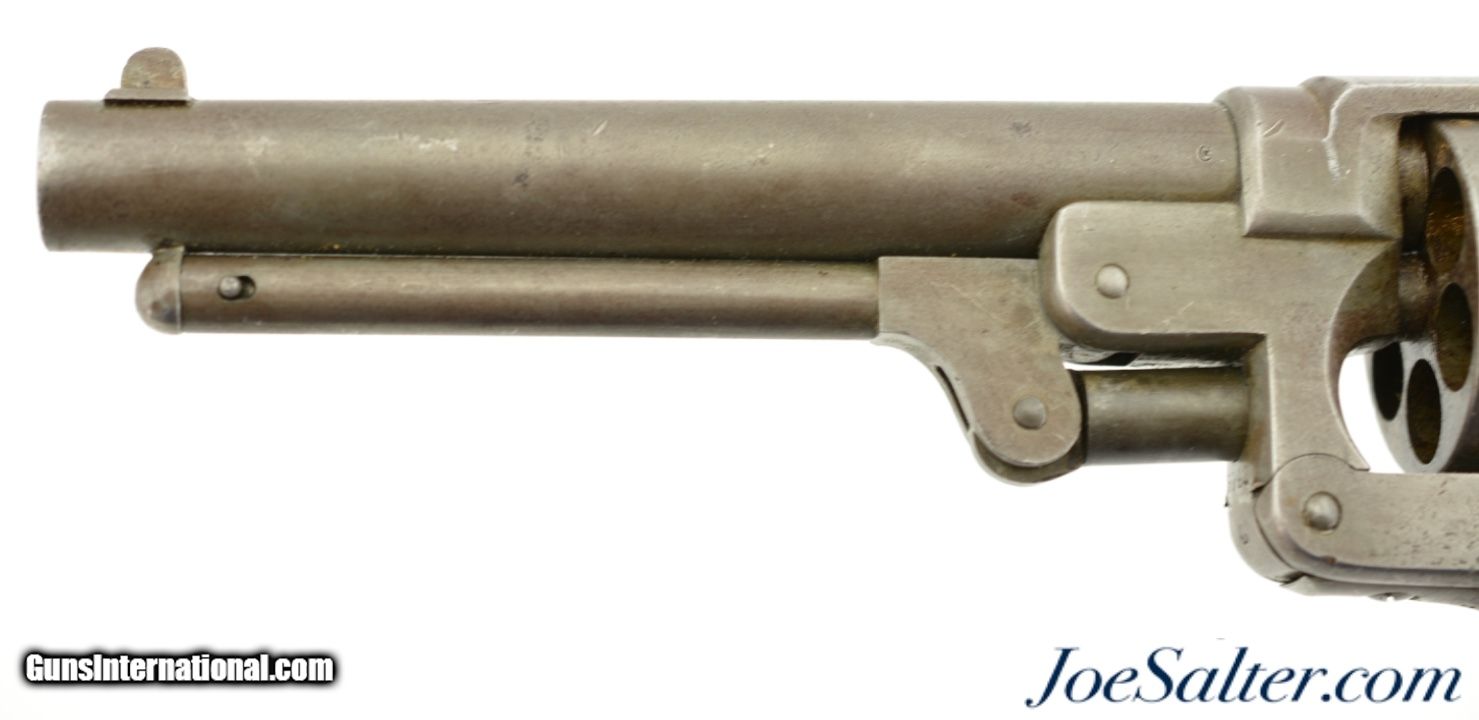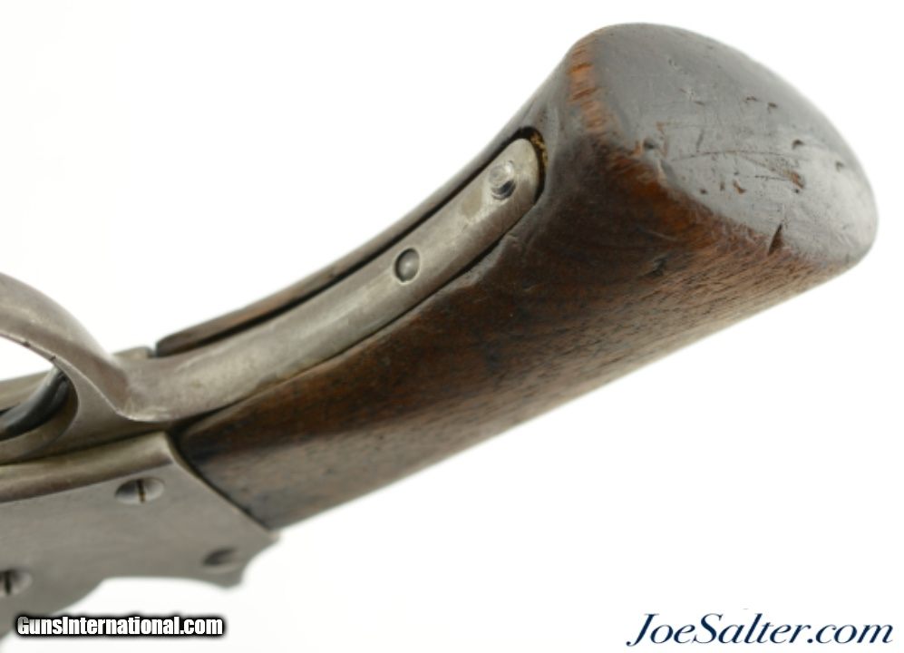 Description: Serial #15342, .44 Caliber, 6" barrel with a good bore that has dark freckling within the grooves. This is an attractive revolver that has matching numbers on the frame, cylinder, and barrel, with an overall smooth pewter gray patina throughout. Some hints of the original color case-hardening can still be seen on the loading lever. The one-piece walnut grip has a faint US inspector cartouche on the right side, and has numerous small handling marks and blemishes throughout. Additionally, there are some stable, with-the-grain cracks at the top of the grip on either side. The lock-up is tight, and the action is functional, however the hammer return spring no longer works reliably. This is a very nice US-purchased Civil War revolver that has a great antique look, and would make a great piece for display. Antique SOLD |