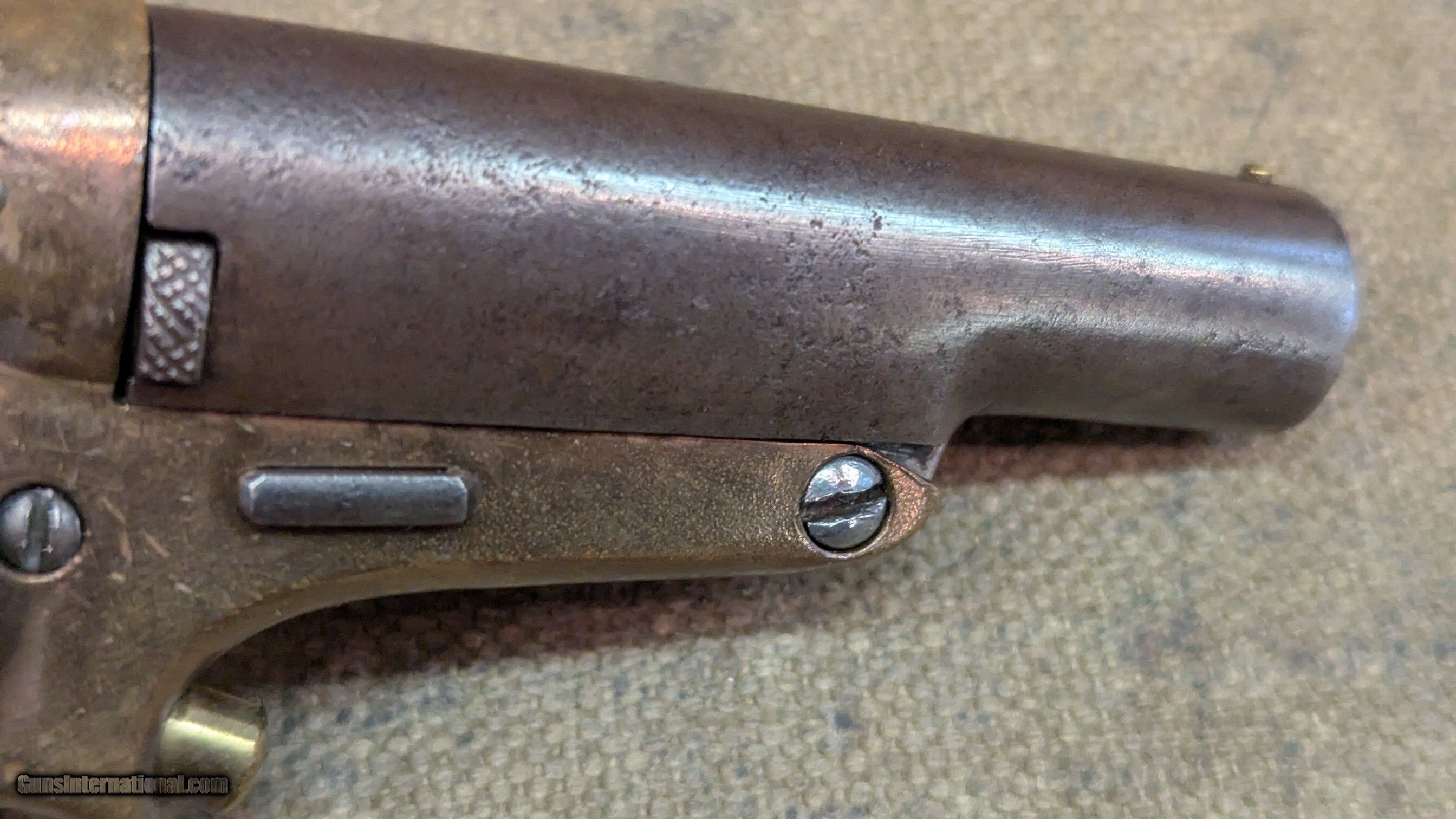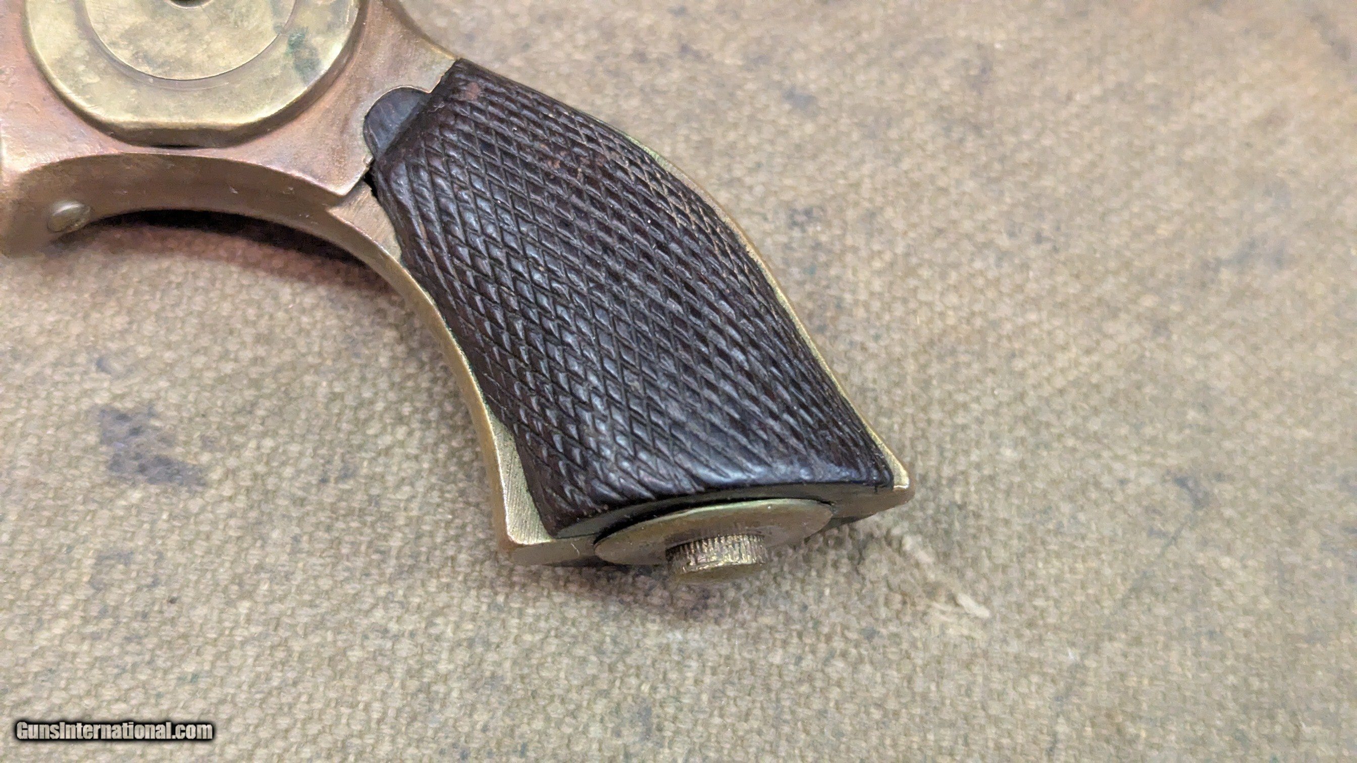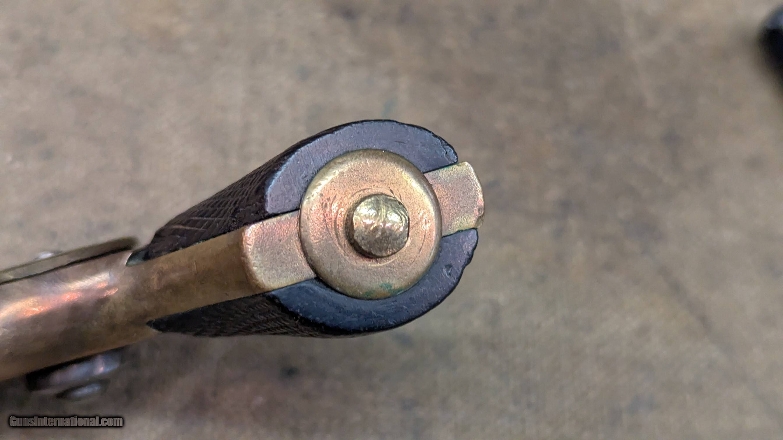 Description: Starr 41 RF cal single shot derringer side plate looks to have be altered, as in turned with a step, or replaced removing the name brass frame with most of the blackening or graying worn off, some still under the barrel grips show 2 chips out of right side, otherwise good shape for age iron or steel barrel is gray in finish, as is hammer frosty bore with shallow rifling, 2-3/4 inches long manual extractor moves freely all marked parts are marked S or SS, including internal sear neat old derringer very uncommon $1395 + shipping ships Priiority insured w/ signature The Fine Print Go to our chandlersfirearms to sign up for our weekly email for what we acquire each week. Items are listed here before anywhere else. We buy and sell estates, willing to travel. We like to buy everything offered, no cherry picking We ship within 72 hrs. to the address listed (or address on FFL) NOTE, Cali buyers we cannot accept C&R for handguns, per your laws, may apply to other States as well We do not shoot any of our inventory unless noted. Standard 3-day inspection, no damage, use of any kind, shooting, swapping of parts, etc. No refund on ANY shipping, in either direction. NO PAYPAL, ever. We accept Money Order, Cashiers’ Check, Cash, or Credit Cards, Payment in 10 business days please or we will relist and leave negative feedback. No warranties written or implied. All items for sale in our shop, if sold, will end. All items are listed to the best of our ability but there may be typos. Best contact is email:saleschesterfieldarms Calls accepted from 10AM to 6PM EST. leave a VM if I cannot pickup SHIPPING DETAILS: Less than a pound, First Class, over a pound, Ground Advantage Handguns, USPS Priority, Flat Rate if possible, INSURED Long guns, and larger items, USPS Ground Advantage or UPS Ground if you prefer, all insured. all ammo ships UPS Ground We will send you a tracking number to the email you have listed in . Tracking comes from our postage supplier, XPShipper, check your spam box if you don’t see a tracking number If you need a shipping quote, I need a zip code to calculate it. If your address is not correct in , PLEASE let me know. Better yet, change it We will combine shipping if possible Thank you for . Antique: Yes Handgun Caliber: .41 Rimfire Manufacturer: Star Serial Number: SS Barrel Length: 2-3/4 Bore Info: frosty, good Condition: good Wood Condition: good Bore Condition: good Price: $1,395.00 Shipping: $40.00 Buy Now Contact Seller |