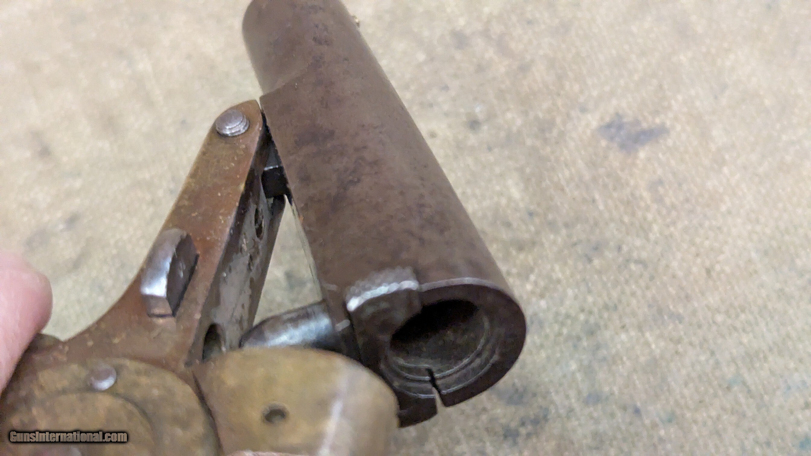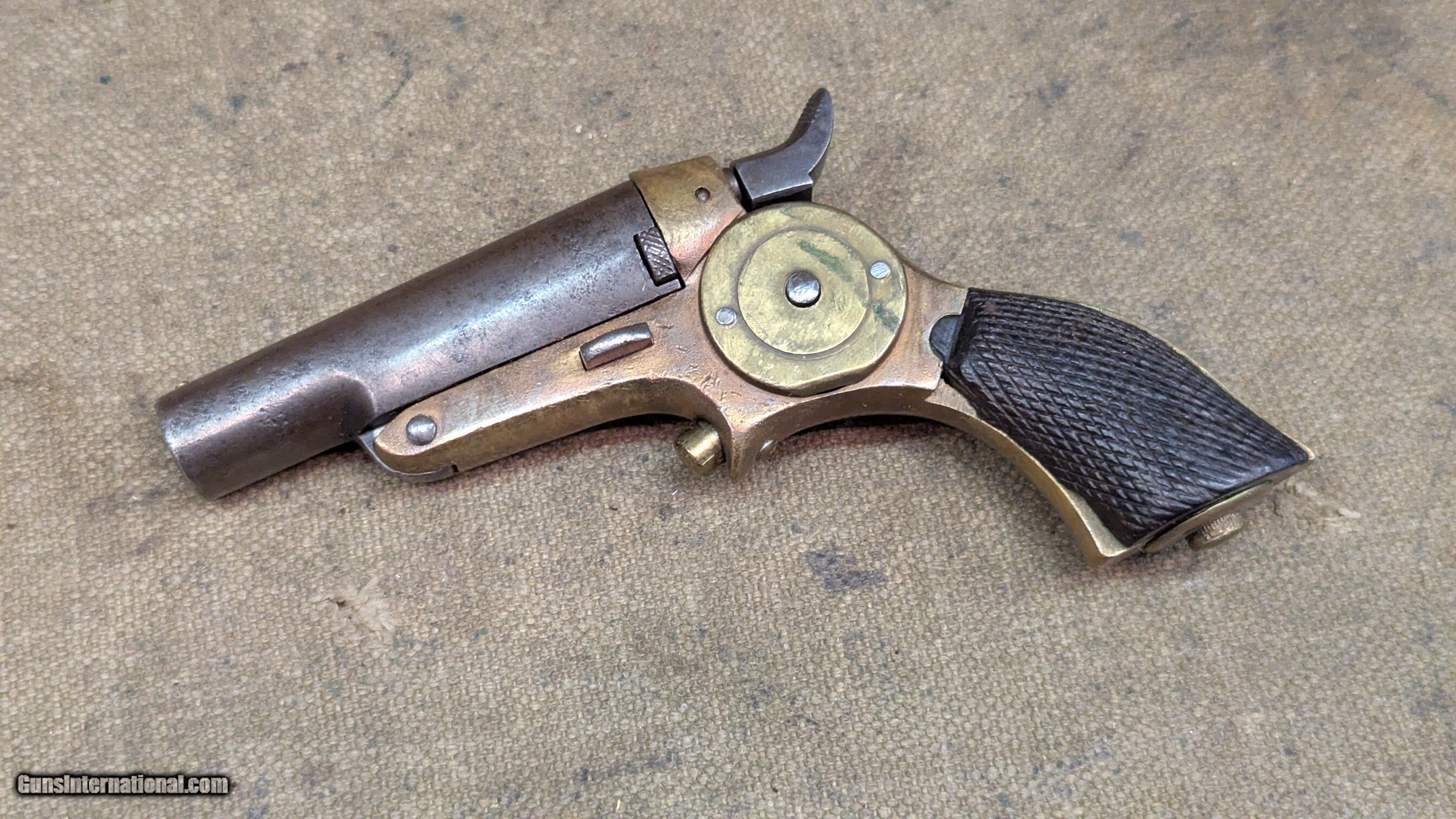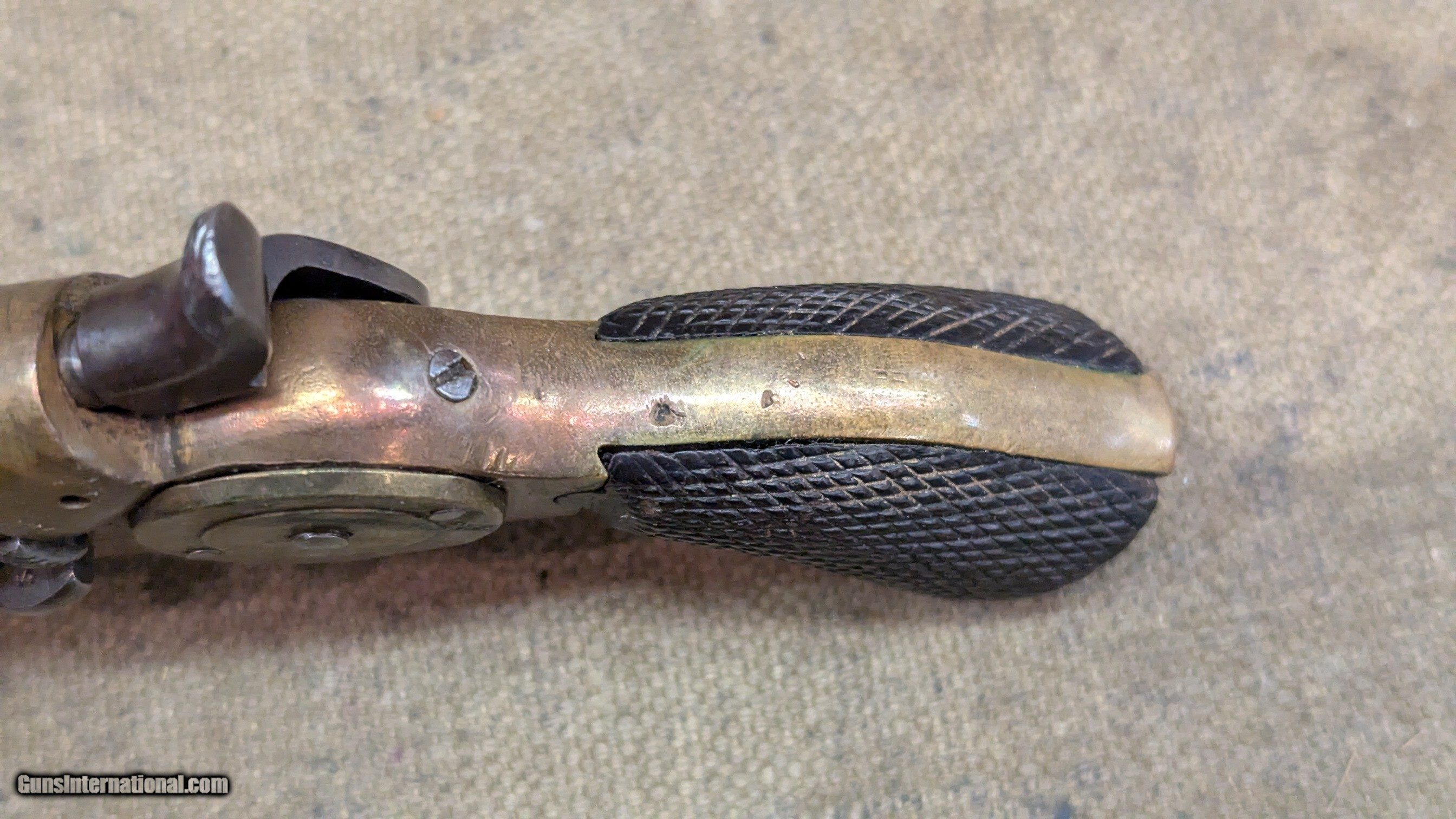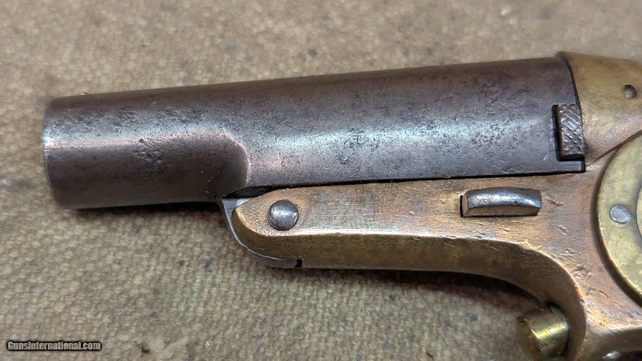 Description: Starr 41 RF cal single shot derringer side plate looks to have be altered, as in turned with a step, or replaced removing the name brass frame with most of the blackening or graying worn off, some still under the barrel grips show 2 chips out of right side, otherwise good shape for age iron or steel barrel is gray in finish, as is hammer frosty bore with shallow rifling, 2-3/4 inches long manual extractor moves freely all marked parts are marked S or SS, including internal sear neat old derringer very uncommon $1395 + shipping ships Priiority insured w/ signature The Fine Print Go to our chandlersfirearms to sign up for our weekly email for what we acquire each week. Items are listed here before anywhere else. We buy and sell estates, willing to travel. We like to buy everything offered, no cherry picking We ship within 72 hrs. to the address listed (or address on FFL) NOTE, Cali buyers we cannot accept C&R for handguns, per your laws, may apply to other States as well We do not shoot any of our inventory unless noted. Standard 3-day inspection, no damage, use of any kind, shooting, swapping of parts, etc. No refund on ANY shipping, in either direction. NO PAYPAL, ever. We accept Money Order, Cashiers’ Check, Cash, or Credit Cards, Payment in 10 business days please or we will relist and leave negative feedback. No warranties written or implied. All items for sale in our shop, if sold, will end. All items are listed to the best of our ability but there may be typos. Best contact is email:saleschesterfieldarms Calls accepted from 10AM to 6PM EST. leave a VM if I cannot pickup SHIPPING DETAILS: Less than a pound, First Class, over a pound, Ground Advantage Handguns, USPS Priority, Flat Rate if possible, INSURED Long guns, and larger items, USPS Ground Advantage or UPS Ground if you prefer, all insured. all ammo ships UPS Ground We will send you a tracking number to the email you have listed in . Tracking comes from our postage supplier, XPShipper, check your spam box if you don’t see a tracking number If you need a shipping quote, I need a zip code to calculate it. If your address is not correct in , PLEASE let me know. Better yet, change it We will combine shipping if possible Thank you for . Antique: Yes Handgun Caliber: .41 Rimfire Manufacturer: Star Serial Number: SS Barrel Length: 2-3/4 Bore Info: frosty, good Condition: good Wood Condition: good Bore Condition: good Price: $1,395.00 Shipping: $40.00 Buy Now Contact Seller |
