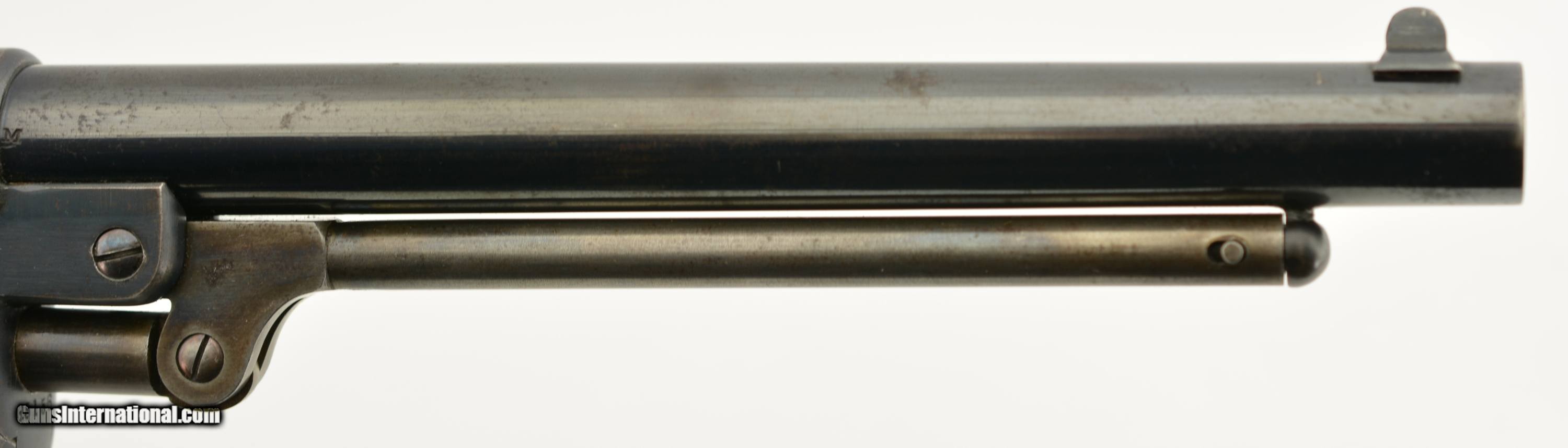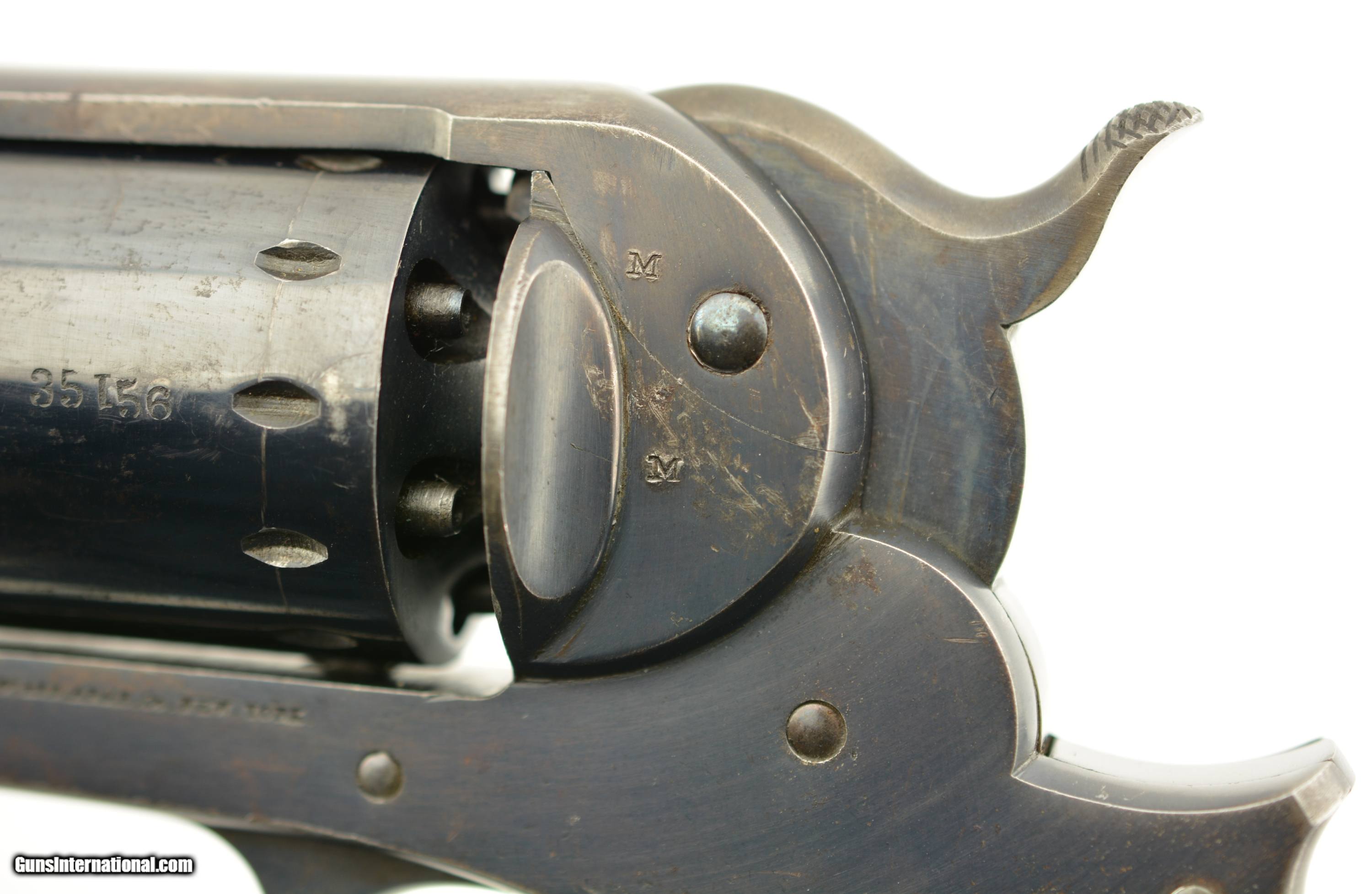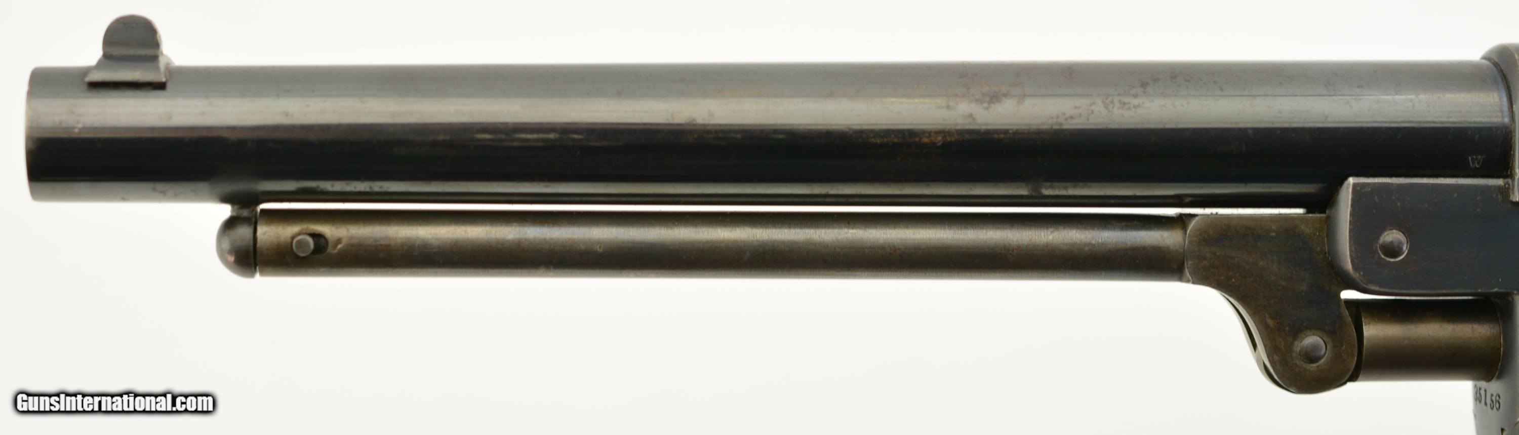 Description: Serial #35156, .44 Caliber, 8" barrel with an excellent, bright bore. This is a handsome revolver that has matching numbers on the frame, barrel assembly, and cylinder, with the metal retaining 95-97% of the original bright blue finish. There is some silvering along some of the high edges, and a few specks of brown freckling along the rear of the frame, but these are negligible, and do not detract from the abnormally high amount of original blue remaining. Additionally, there is some gray fading along the gripstraps, but the hammer and loading lever also retain most of the original color case-hardening. The mechanism is tight and fully functional with robust springs and a tight, positive lock-up. The walnut grip has minor handling marks and blemishes throughout, including some bruises near the butt on the left side, but the cartouches are still crisp and clear. The revolver is accompanied by an original Starr .44 caliber, single cavity mold, and original combination nipple wrench/screwdriver. This is a handsome Civil War era revolver, the best example of a Starr Model 1863 we have ever seen, and is in excellent condition. Near impossible to upgrade! Antique SOLD Antique: Yes Manufacturer: Starr Model: 1863 Caliber Info: .44 Gauge Info: .44 |