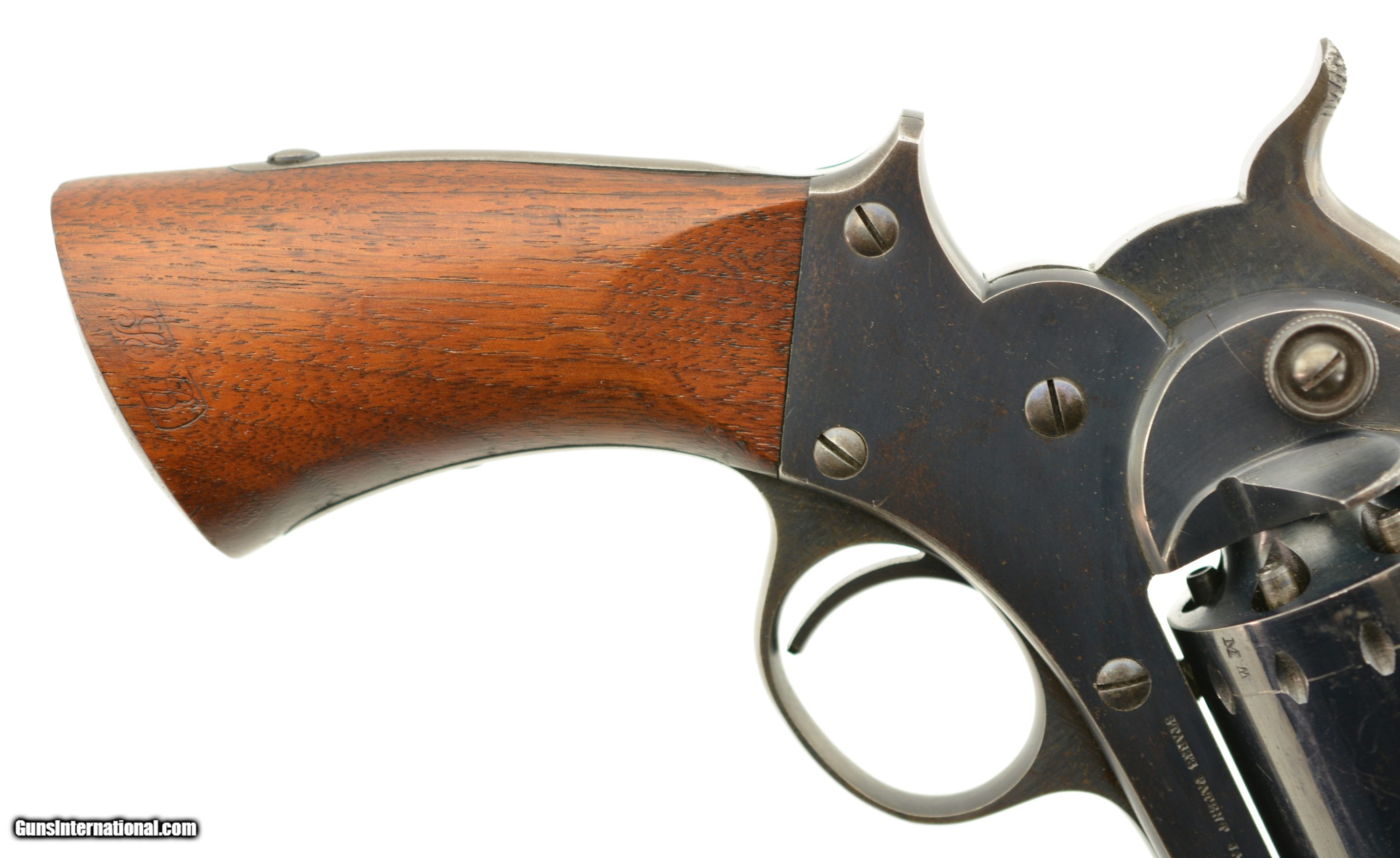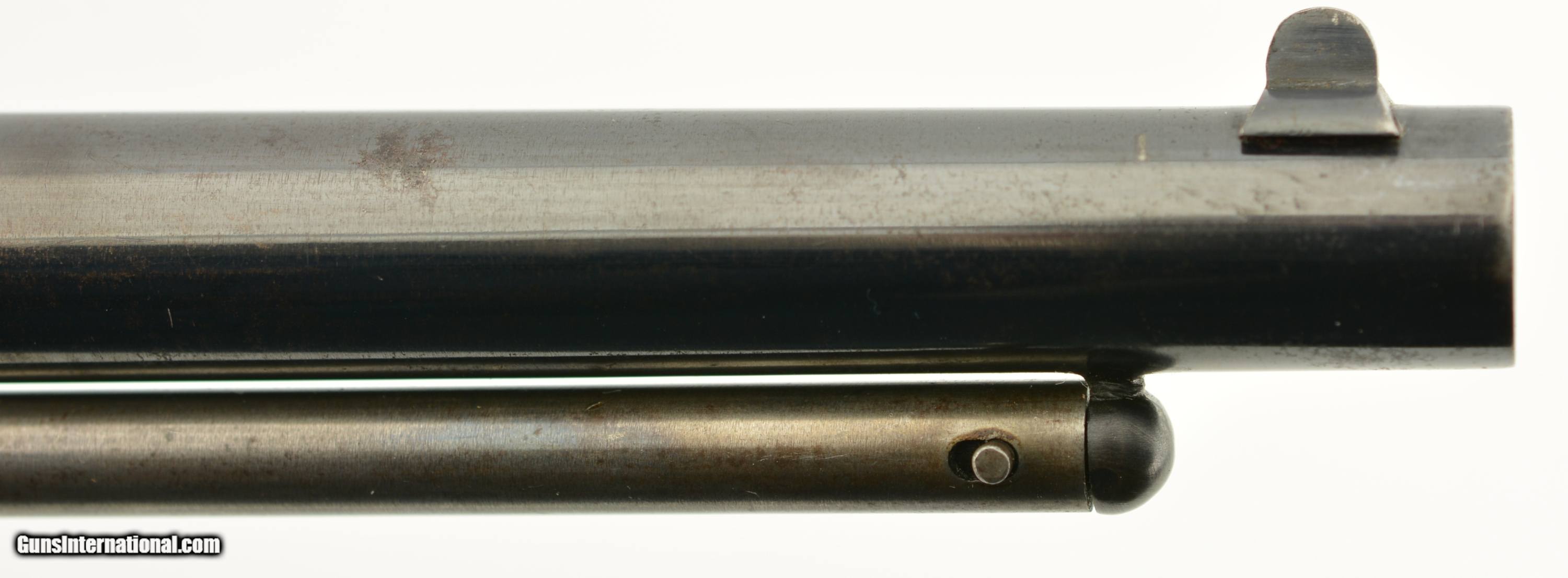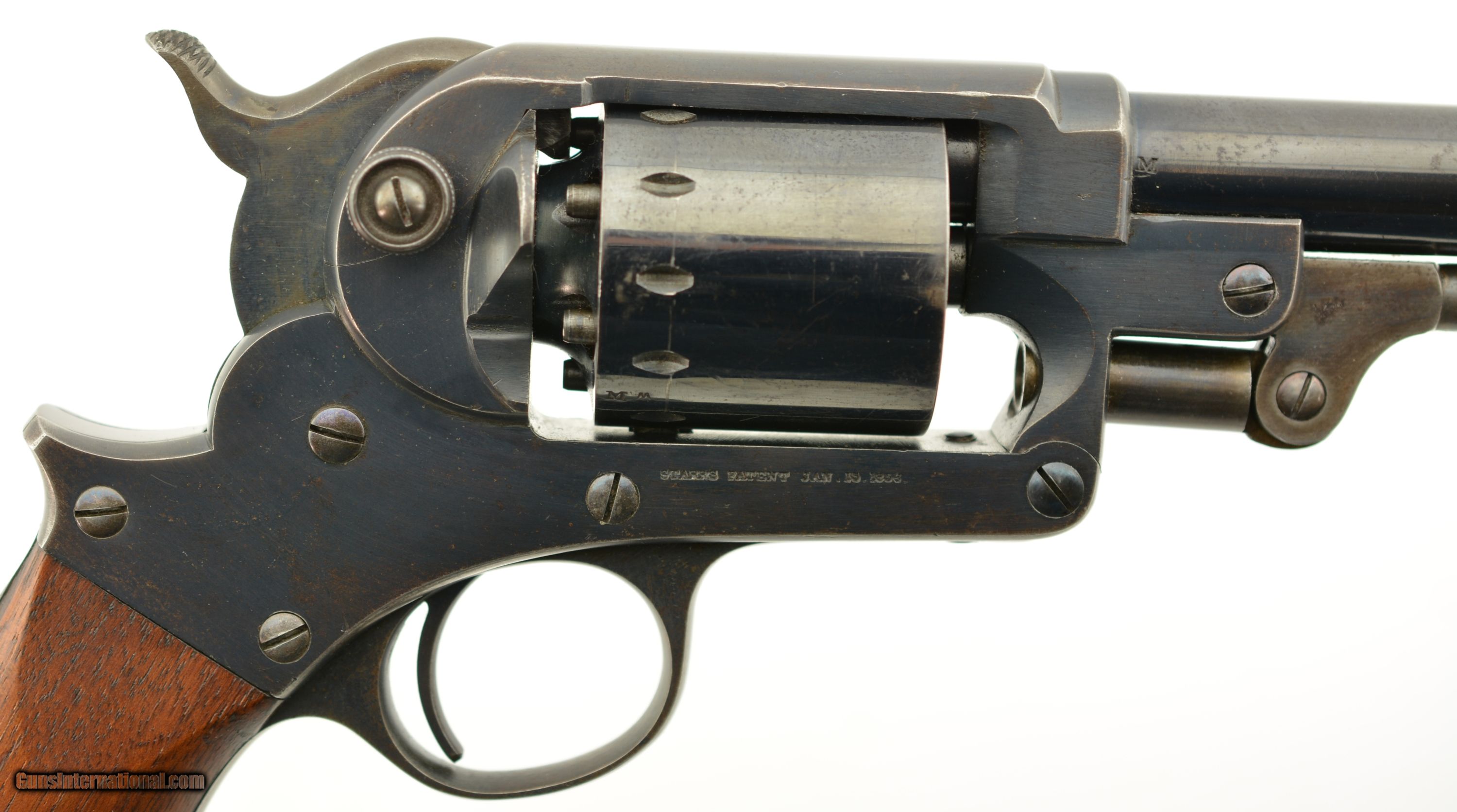 Description: Serial #35156, .44 Caliber, 8" barrel with an excellent, bright bore. This is a handsome revolver that has matching numbers on the frame, barrel assembly, and cylinder, with the metal retaining 95-97% of the original bright blue finish. There is some silvering along some of the high edges, and a few specks of brown freckling along the rear of the frame, but these are negligible, and do not detract from the abnormally high amount of original blue remaining. Additionally, there is some gray fading along the gripstraps, but the hammer and loading lever also retain most of the original color case-hardening. The mechanism is tight and fully functional with robust springs and a tight, positive lock-up. The walnut grip has minor handling marks and blemishes throughout, including some bruises near the butt on the left side, but the cartouches are still crisp and clear. The revolver is accompanied by an original Starr .44 caliber, single cavity mold, and original combination nipple wrench/screwdriver. This is a handsome Civil War era revolver, the best example of a Starr Model 1863 we have ever seen, and is in excellent condition. Near impossible to upgrade! Antique SOLD Antique: Yes Manufacturer: Starr Model: 1863 Caliber Info: .44 Gauge Info: .44 |