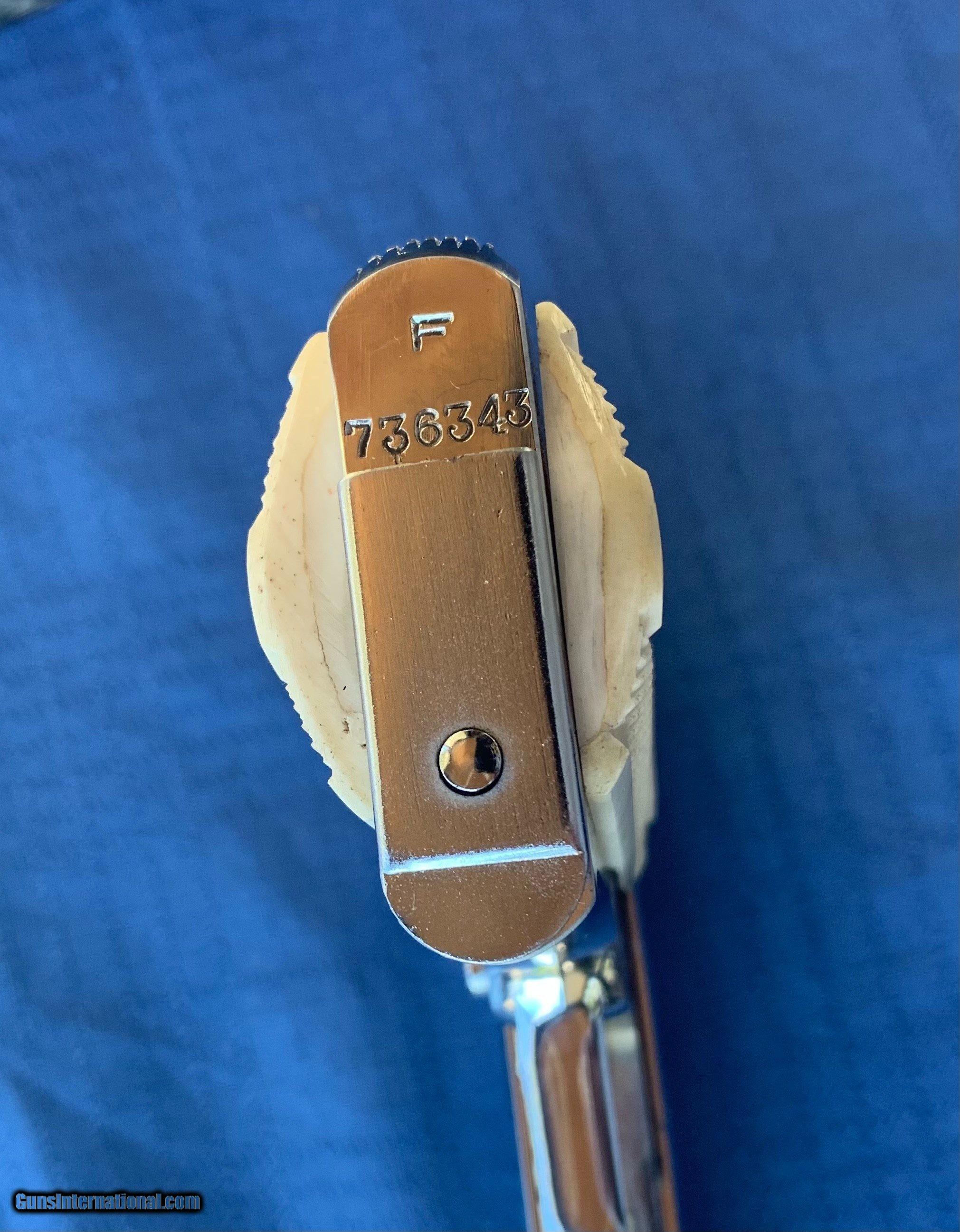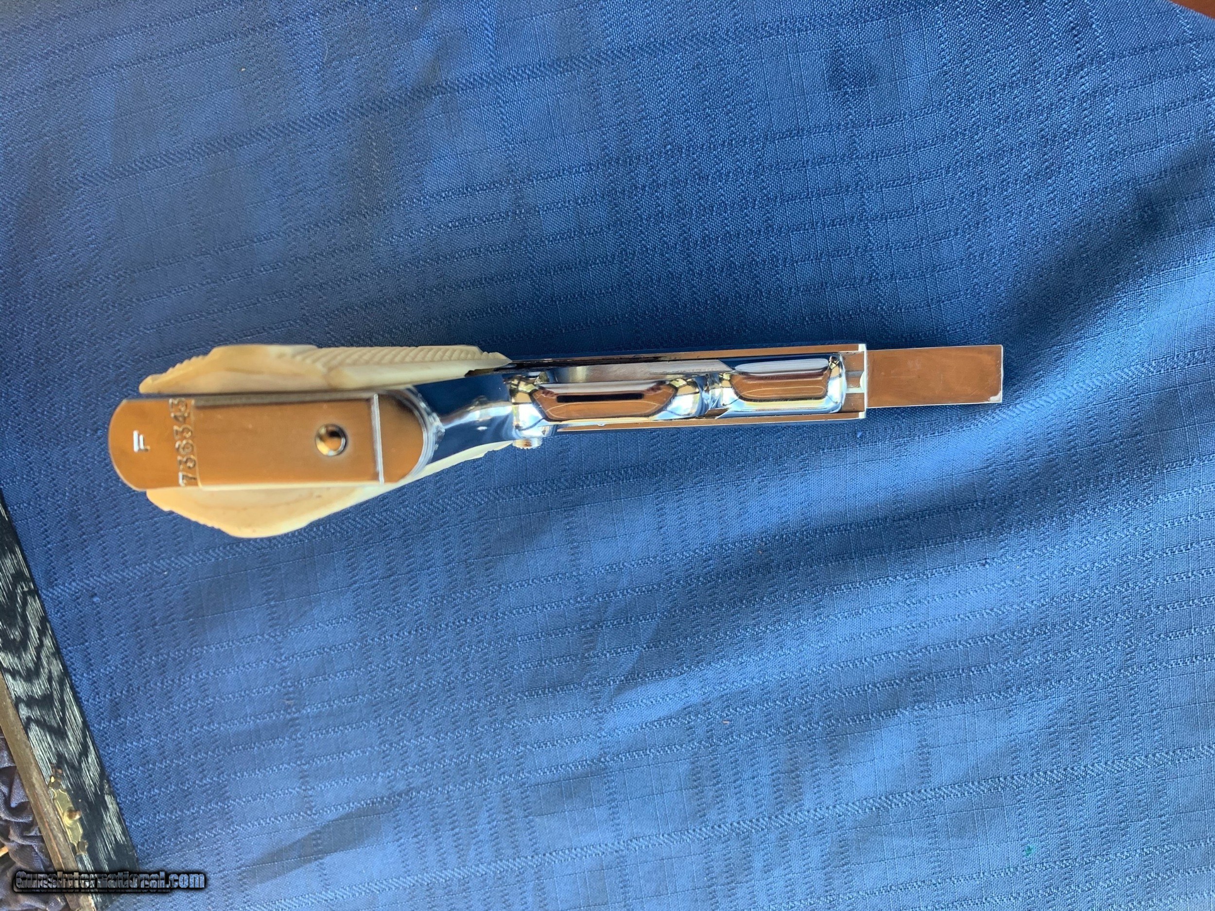 Description: STARR ARMS CO. PRESENTATION 22 LONG PISTOL. FULL COVERAGE FACTORY ENGRAVED WITH FACTORY PRESENTATION BOX AND 2 FACTORY MATCHING MAGS. SUPER RARE SET IN ANY CONDITION. THIS GUN IS IN MINT ORIGINAL CONDITION. UN-USED CONDITION. GUN HAS ALL OF ITS BRIGHT FACTORY NICKEL FINISH STILL REMAINING , GRIPS LOOK LIKE IVORY. BOX IS MADE OF WOOD AND A SILK LINING.BORE AND MECHANICS ARE MINT ! COLECTOR QUALITY . SUPER NICE EXAMPLE OF A VERY LOW PRODUCTION GUN ! PLEASE REVIEW MY PHOTOS AND EMAIL ME WITH ANY QUESTIONS ? 3 DAY INSPECTION AS ALLWAYS. THANKYOU FOR LOOKING , LITTLE JO SOLD Curio/Relic: Yes Handgun Caliber: .22 Long Manufacturer: STARR Model: 22 LONG |