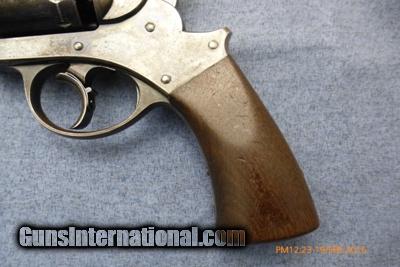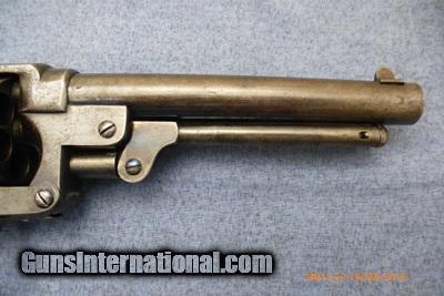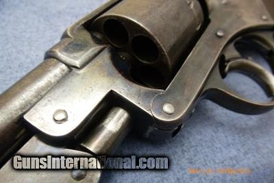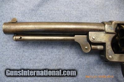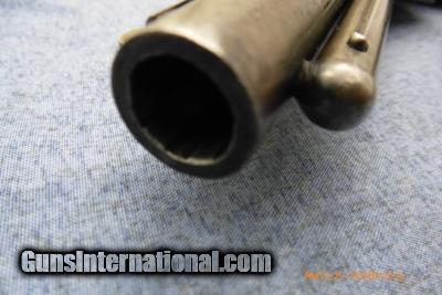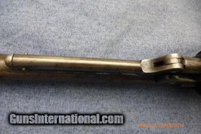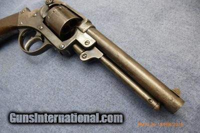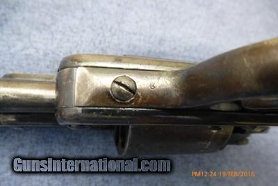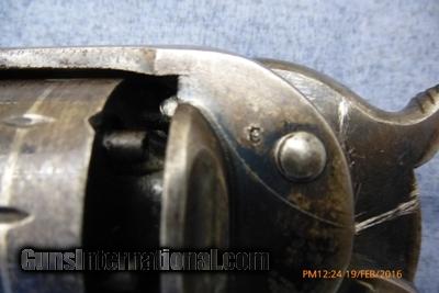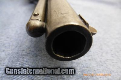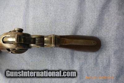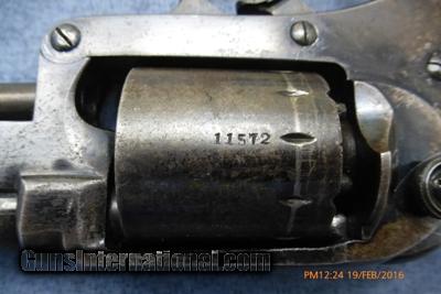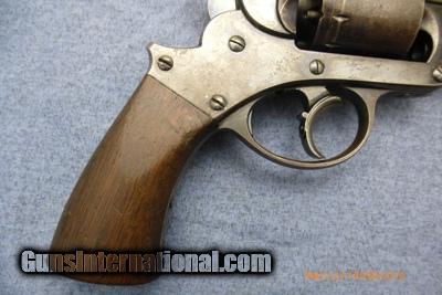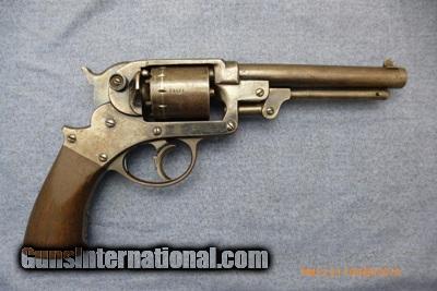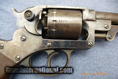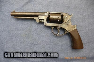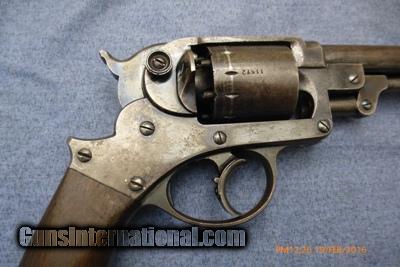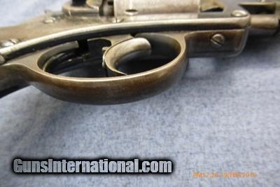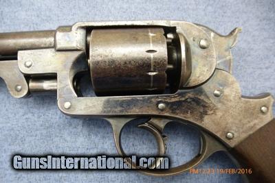 Description: Starr Arms Co. D. A. 1858 Civil War Army Revolver 16-8 Condition: 50-60% Original bright blue finish on barrel, loading lever, trigger guard, hammer, metal is clean with no corrosion, some letters from military inspectors marks on various parts frame and BBL. Bore has 70% of rifling and a little corrosion; grips are excellent. Actions works perfectly and locks tight. Over all very fine condition. Starr Arms Co., New York City. Double Action Model 1858 Army Revolver. Made c. late 1850 s early 1860s; totally quantity about 23,000.44 Caliber. 6-shot round barrel. Walnut grips. Blue, with casehardened hammer, trigger, and lever. Frame marking: STARR ARMS CO. NEW YORK and STARR’S PATENT JAN.15, 1856. Starr Arms Co., New York City. Single Model 1863 Arm Revolver. Made c. 1863-65; total quantity about 32,000. 44 caliber .6-shot round cylinder, the nipples partially protruding from the back section. 8” round barrel. Walnut grips. Blued, with case hardened hammer and lever. Frame Jan. 15, 1856. The Starr Single Action was designed as an improved and less costly successor to their D.A. model 1858 Army. Next to colts and Remington, this was major model of revolving handgun bought by the U.S. government in the Civil War period. (16-8) $1,650.00 FUNCTIONING OF STARR DOUBLE ACTION REVOLVERS The Starr .36 caliber Navy and the first model .44 caliber Army are both double action revolvers. The Navy was the first to be produced. A total of approximately 3000 were made from 1858 to August of 1861. On August 31, 1861, The Starr Arms Company proposed to deliver 12,000 of their 44 caliber double action Army models to the United States Government. A total of approximately 23,000 were produced from February 1862 through the year 1863. Both revolvers have similar actions, with only minor differences between them. Both employ a double trigger mechanism. The front or main trigger (referred to in Starr’s literature as the firing-lever) is used for cocking the hammer. The rear trigger is a small set trigger (referred to in Starr’s literature as the sear) which, when depressed, releases the hammer after it is cocked by the front trigger. The front trigger also has an adjustable slide attached to the rear. This slide, when positioned properly, makes contact with the rear set trigger at the end of its cocking travel. This causes the set trigger to release the hammer in a single motion like a straight double. The cylinder locks is an integral part of the front trigger rather than a separate part. It releases and locks the cylinder as the front trigger rocks back and forth during its cocking action. Because of this feature, if someone tries to cock the hammer with their thumb instead of employing the front trigger, the cylinder lock remains in contact with the cylinder thus jamming the action. If enough force is exerted on the hammer when the lock is in contact with the cylinder, damage to the rotator hand, ratchet assembly on the rear of the cylinder or the cylinder lock itself can and usually does occur. This appears to be the main weakness of the Starr double action design. It accounts, in my opinion, for the reason so many Starr double actions are encountered with damage or missing hands and the cylinder lock projections. SOLD Antique: Yes |