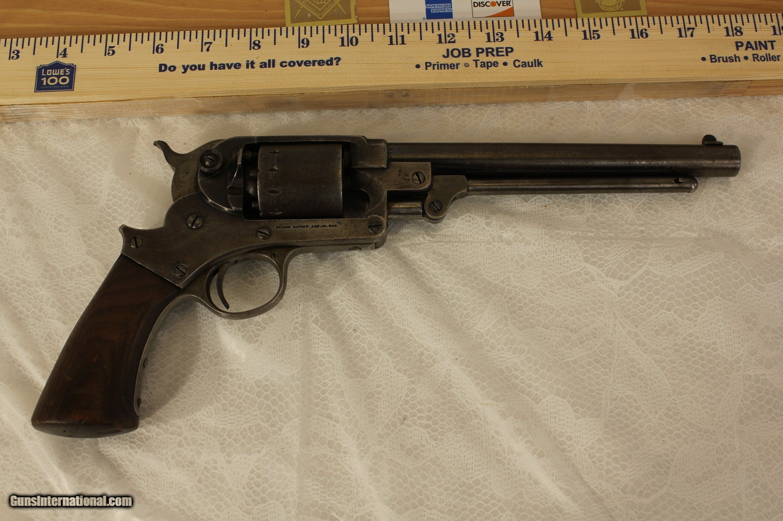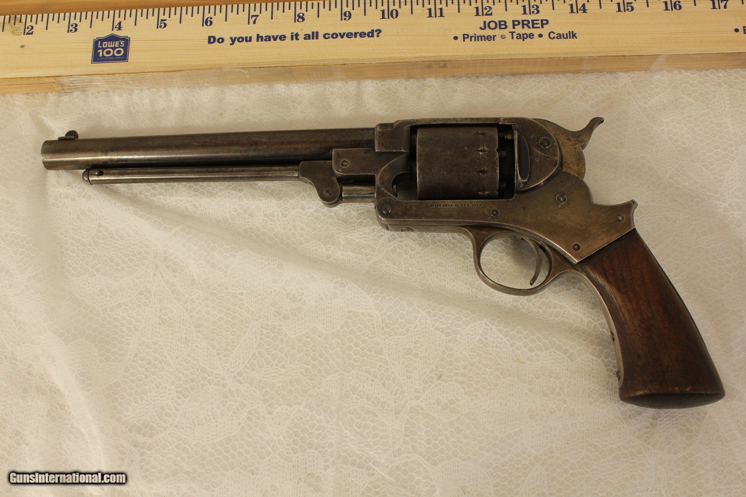 Description: This is a nice, sound Civil War revolver with a very good bore. The finish is turning to a plumb brown in many areas. The cartouches are just visible on the wood grips. Civil War revolvers in this condition are becoming very hard to find. It has an 8 inch barrel and appears to be all original. $30.00 shipping via Priority Mail Antique, no paperwork required. SOLD Antique: Yes |