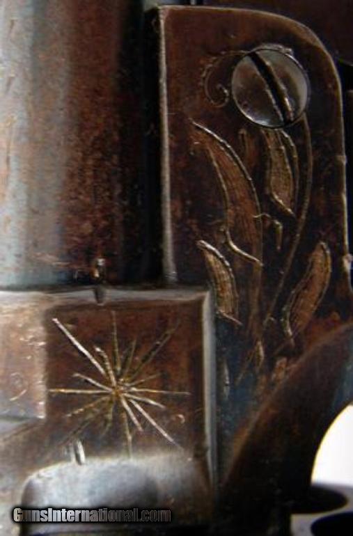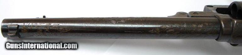Description: Starr Civil War .44 caliber revolver. Single action model. Gun is floral engraved with flourishes. Bore is excellent. Grips show handling wear and some nicks and dings. We have seen at least 10 examples of this same pattern over the last 40 plus years. This is period engraved and cut through the blue (as are all the examples we have seen). This was done possibly by Starr or a retail dealer during or after the Civil War using Civilian Starr single actions. Very colorful and well done period work! SOLD |
