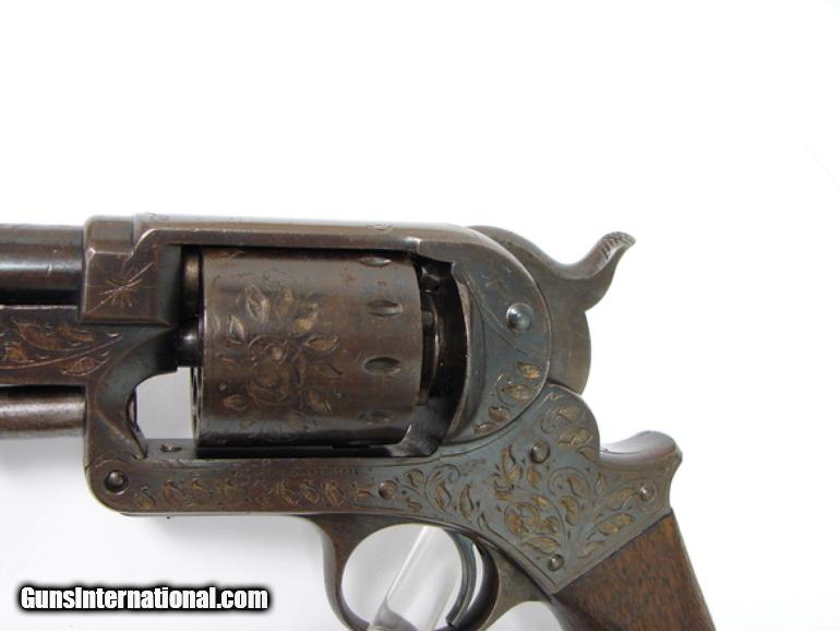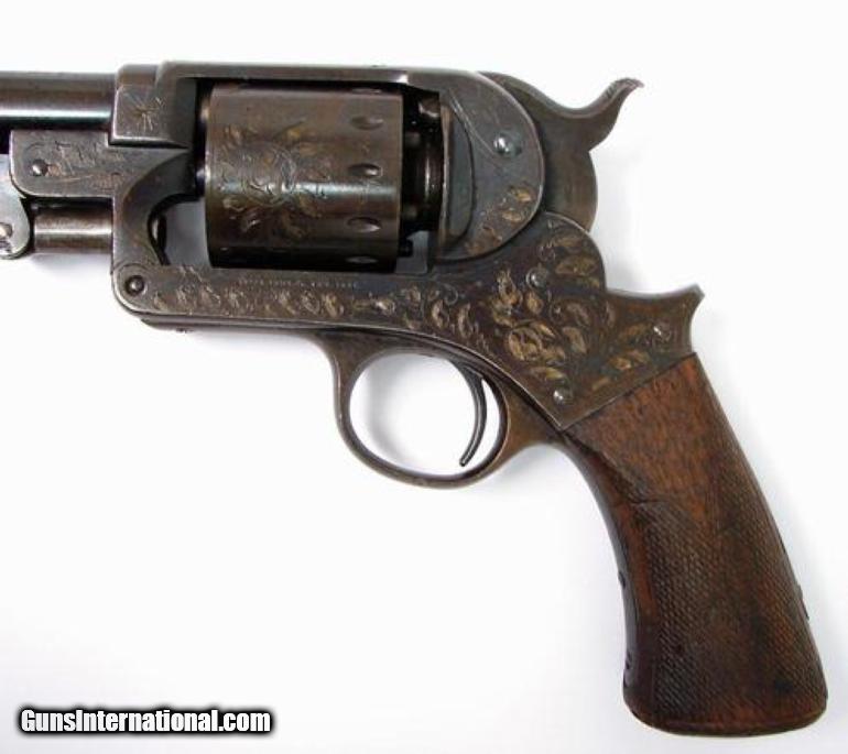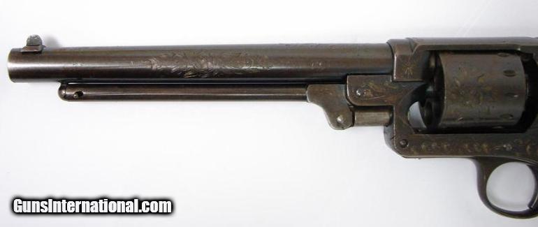 Starr Civil War .44 caliber revolver. Single action model. Gun is floral engraved with flourishes. Bore is excellent. Grips show handling wear and some nicks and dings. We have seen at least 10 examples of this same pattern over the last 40 plus years. This is period engraved and cut through the blue (as are all the examples we have seen). This was done possibly by Starr or a retail dealer during or after the Civil War using Civilian Starr single actions. Very colorful and well done period work!