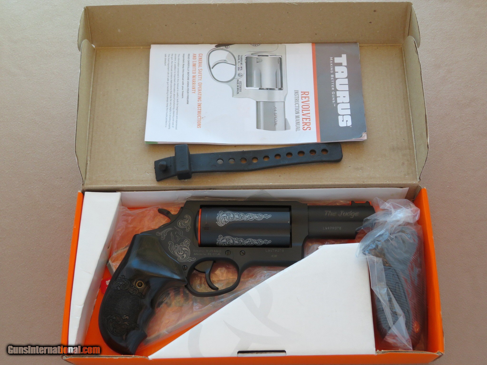 Description: LNIB Taurus "The Judge" chambered in 45 Long Colt/ .410 Gauge. This revolver was a limited edition Lipsey"s exclusive, and featured black finish with scroll engaving, and engraved hardwood grips. This gun is in like new condition, with its original box, paper work, and an extra set of factory grips. The gun shows a light drag line, and appears to have been fired, but very little. A very nice and unique Taurus Judge. SOLD Manufacturer: Taurus Model: The Judge Serial Number: LW479078 Caliber Info: .45 L.C/.410 Gauge Bore: Excellent Condition: LNIB Metal Condition: Excellent |