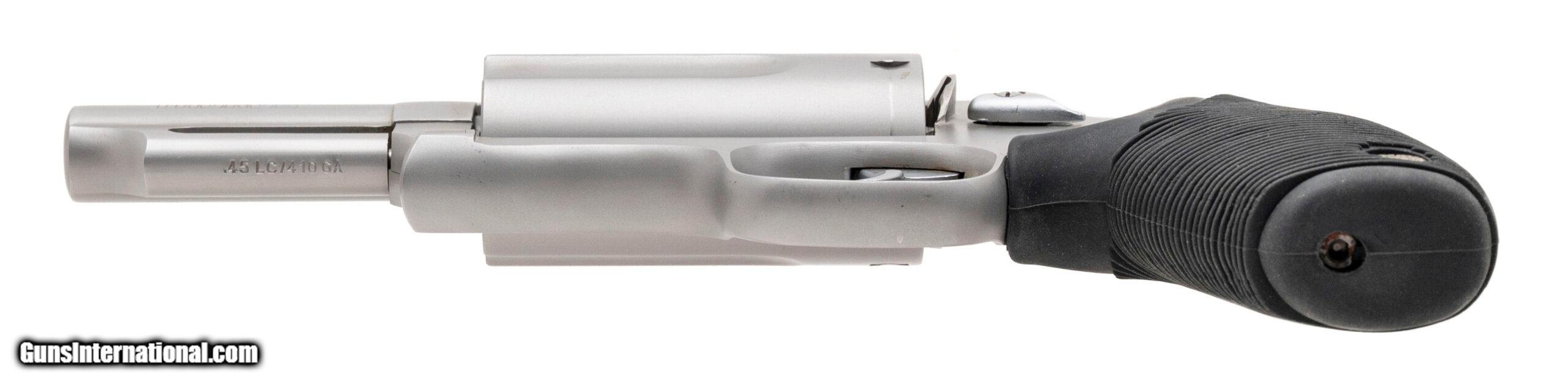 Description: "SN: FS619248. Modern production, .45LC/.410 gauge with a 3"" barrel. Bore is good. Double-action revolver with a 3"" Magnum chamber, fiber-optic front sight, stainless steel frame, and black rubber grips. Metal shows minor marks. Overall condition is very good. SOLD |