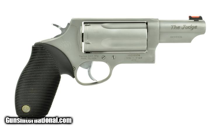 Description: Taurus Judge 410GA/45LC caliber revolver. Matte stainless Judge with 3” barrel and 3” chamber in excellent condition.