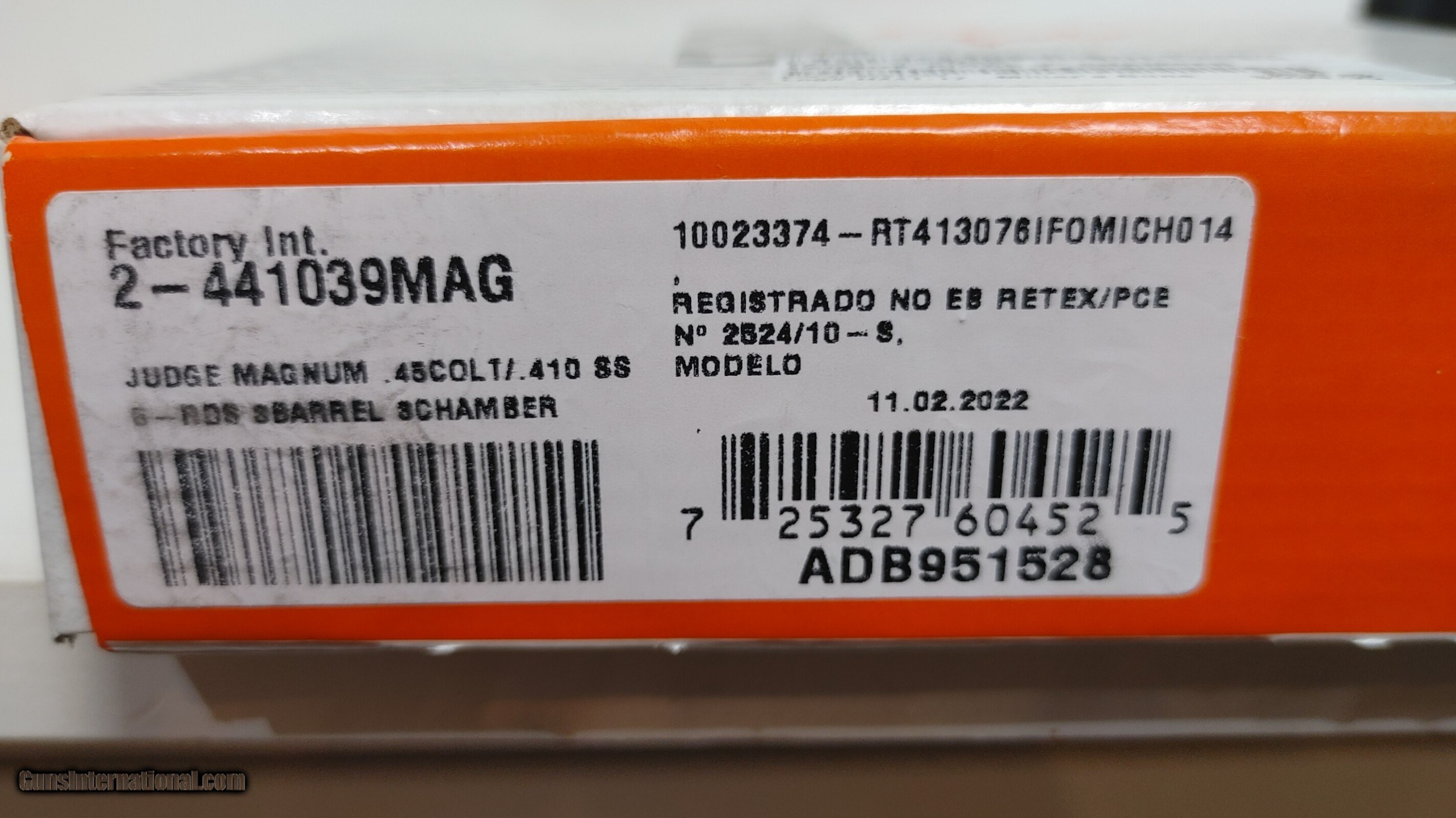 Description: (CALIBER:45LC|410 GAUGE); (MAG CAPACITY:5); (MODEL SERIES:45-410); (CAPACITY:5); (FINISH:STAINLESS STEEL); (STOCK:RIBBER GRIP); (SIGHTS:FRONT: RED FIBER OPTIC REAR: FIXED); (OVERALL LENGTH:9.5); (FEATURES:THE JUDGE STAMPED ON THE BARREL); (GUN TYPE:REVOLVER: DOUBLE ACTION); (ACTION:DOUBLE ACTION); (BARREL LENGTH:3); (DEPT:HANDGUN) Buyer pays shipping Millers Gun Center Located in New Castle, Delaware "Home of TAX-Free shopping" No Credit Card Fees SOLD Serial Number: ADB951528 |