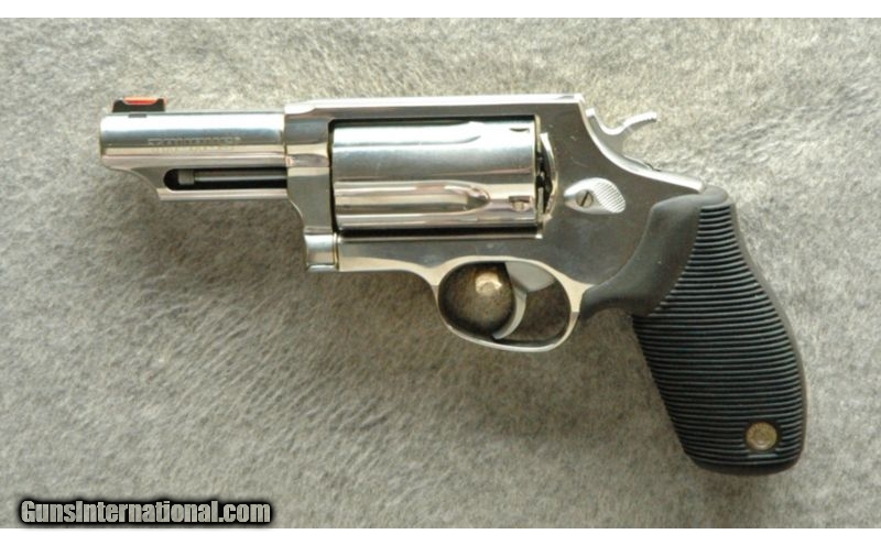 Description: Taurus The Judge revolver .45 / .410. Excellent condition, good pick for back packers defense from predators and vipers. SOLD Caliber Info: .45 Colt and 2-1/2" .410 Shotshells Metal Condition: Excellent, Light Finish Wear, Small Nicks & Scratches Wood Condition: Grips Are In Excellent Condition Bore Condition: Bright Barrels: 3 Triggers: Double and Single Action Stock: Factory Grips Weight: 2 lbs 4 ozs Sights: Fixed Rear Sight Channel, Red Fiber Optic Front Sight Extras: No box Item Location: La Vista, NE |