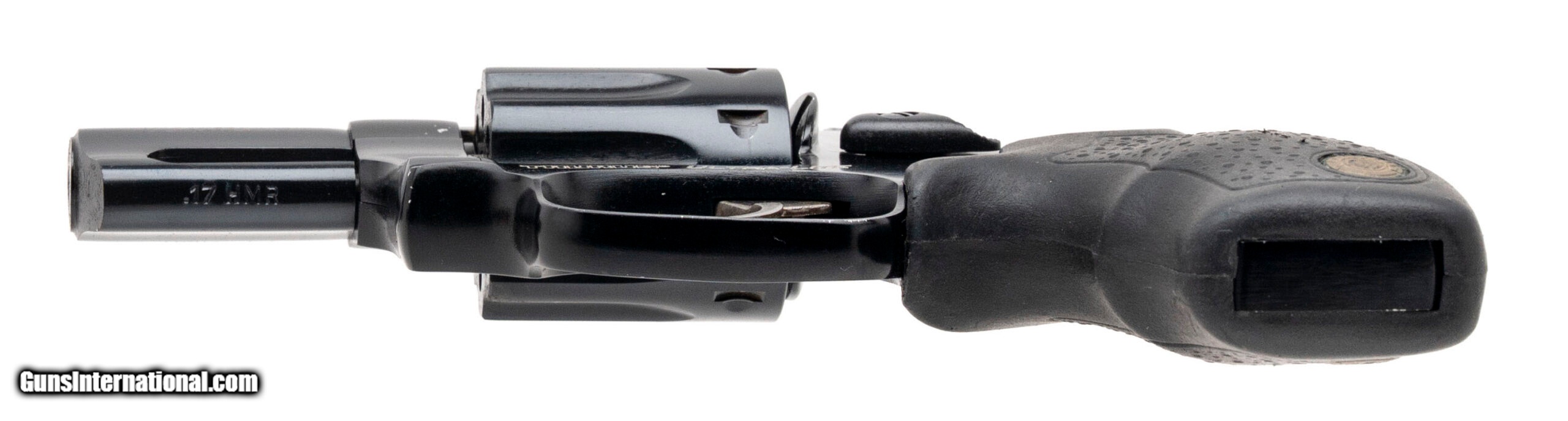 Description: "SN:WI27723. Modern Production, 17.HMR revolver with a 2"" snub-nosed barrel. Bore is excellent. Compact alloy-framed revolver with 8rd cylinder and adjustable rear sight. Blued finish with rubber grips. Pitting to left side of barrel & front sight, including minor loss to finish. Overall condition is good. SOLD |
