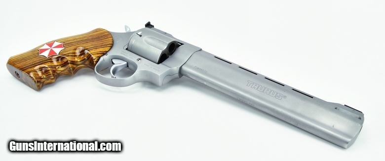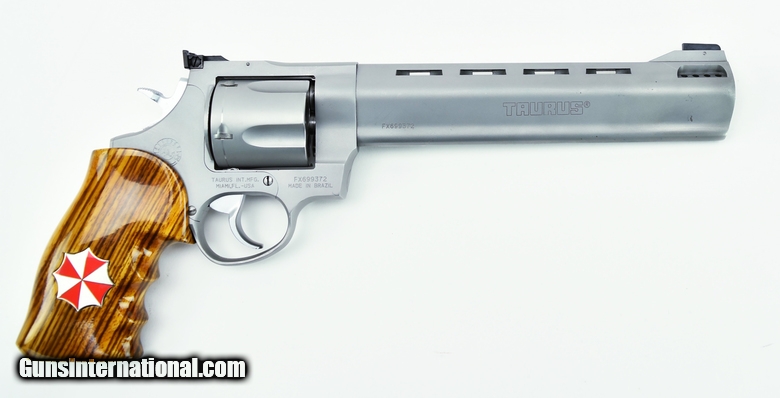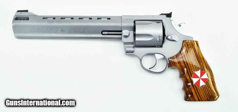 Description: Taurus Raging Bull .454 Casull caliber revolver. 8 .375” barrel with stainless steel finish and custom “Umbrella Corporation” grips in very good condition.