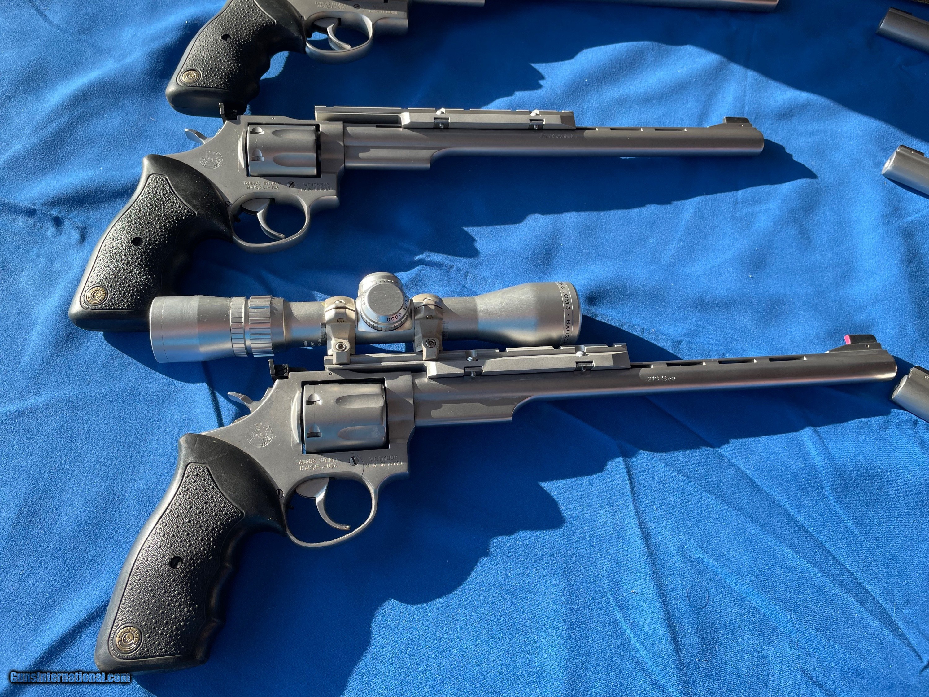 Description: Time to let someone else enjoy these fine revolvers. Up for sale this time is a set of used Taurus target revolvers chambered in 44 Magnum, 357 Magnum, 218 Bee, 17 HMR, 22 WMR & 22 LR. The condition would rate, in my opinion, good-very good, but I can provide more pictures and you be the judge. 4 of the revolvers come with factory boxes and Taurus factory scope rail if shown, scopes not included. For more information or pictures email or feel free to call (580) 320-3521. Payment by USPS money order, certified bank check or pay app, due within 7 days. Shipping/insurance is available to your FFL of choice for out of state sales. For Oklahoma residents pick up is available in Ada or Durant, must have valid ID and be willing to sign BOS. Please see my current and future listings for more rifles including LE Davidsons Marlin Trappers, Marlin Cowboy rifles, hunting handguns, scopes, ammo and reloading supplies. LISTING EXPIRING SOON, MAKE OFFER ON ALL OR INDIVIDUAL REVOLVERS Price Reduced $4500.00 SOLD Rifle Caliber: .218 Bee Manufacturer: Taurus Model: M12 Condition: Very Good Metal Condition: Very Good Bore Condition: Very Good Finish: SS Sights: Factory Irons Item Location: Ada/Durant Oklahoma |