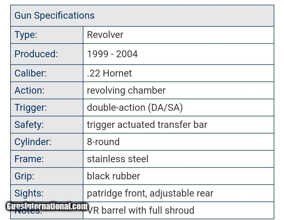 Description: Taurus 22 Raging Hornet. 10" barrel. 8 shot revolver 50oz Stainless steel. Clear crisp scope and rings inc. In excellent condition. Discontinued Model. Buyer to pay actual 2 day UPS Shipping to FFL SOLD Handgun Caliber: .22 Hornet Manufacturer: Taurus Model: Raging Hornet Barrel Length: 10 Condition: Exc |