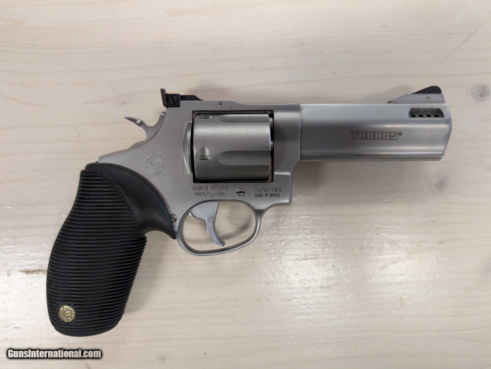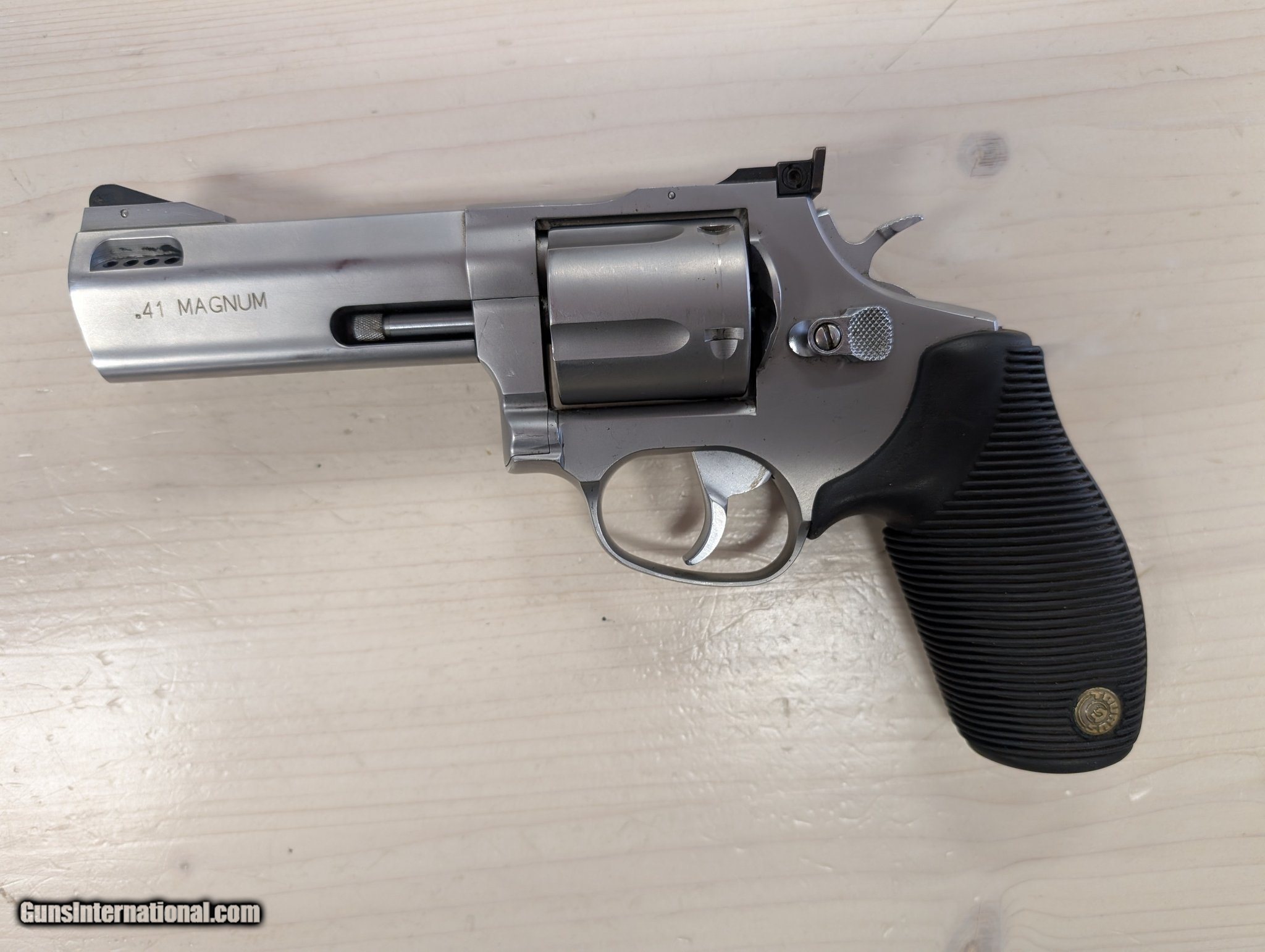 Description: Guns Listing ID: 485516 Hammer forged stainless steel models of the Model 425 5-shot in .41 Magnum will be appearing in backpacks and fishermens tackle boxes, especially when there are bears and other predators around. The Taurus Tracker has established a standard for pack guns for hunters and hikers. Finished in stainless steel, the 425 Tracker holds 5-rounds of .41 Magnum and carries the Taurus Security System and the exclusive ribber grip. More Information Brand Taurus Action Double/Single Action Barrel Length 4\" Caliber .41 Remington Magnum Capacity 5 Product Type Revolver SOLD Manufacturer: TAURUS Model: 425 TRACKER Condition: Used - Non-Certified Barrels: 4 Gauge Info: .41 REM MAG Finish: BRUSHED STAINLESS |