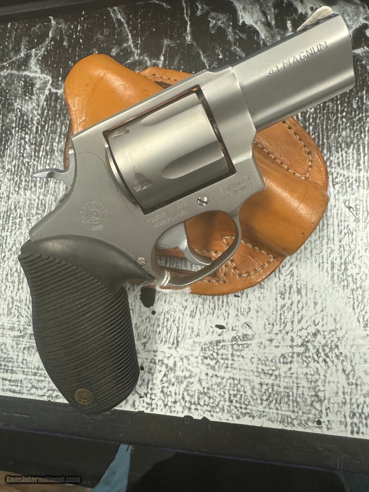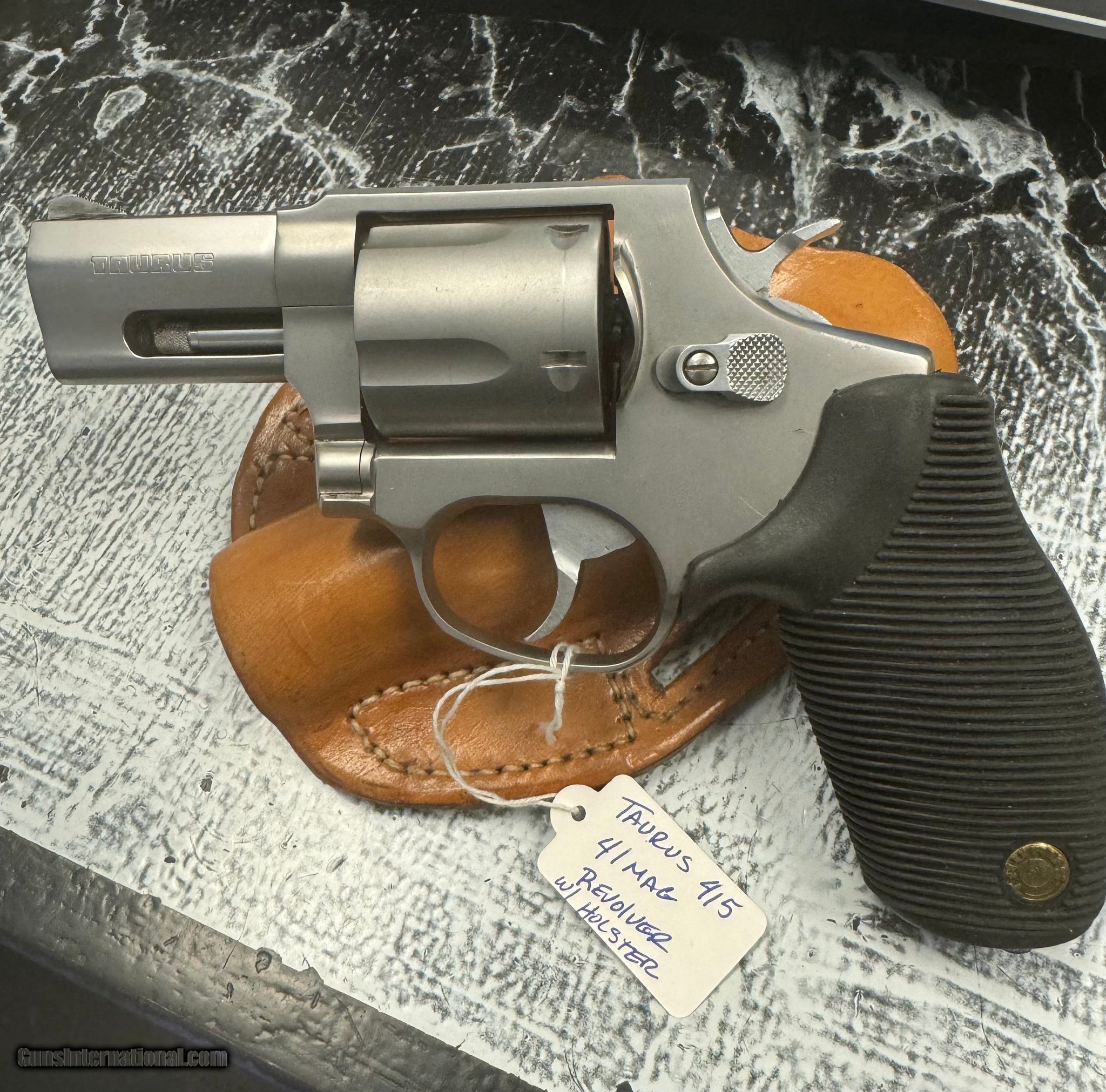 Description: Guns Listing ID: 1320001 Discontinued Model: Comes with leather holster Model: 415SS2C Finish: Matte Stainless Steel Status: Discontinued Caliber: .41 MAG Grips: Rubber UPC: 7-25327-33093-6 Capacity: 5 Weight: 30.1 oz Rate of Twist: 1:18.75\" Barrel Length: 2.5\" Height: 5.10\" Frame: Compact Width: 1.531\" Action: DA/SA Front Sight: Fixed Length: 7.125\" Grooves: 6 Safety: Transfer Bar Trigger Type: Smooth SOLD Manufacturer: TAURUS Model: M415 2.5" Ported Caliber Info: .41 REM MAG Condition: Used - Non-Certified Barrels: 2.5 BARREL Finish: STAINLESS |