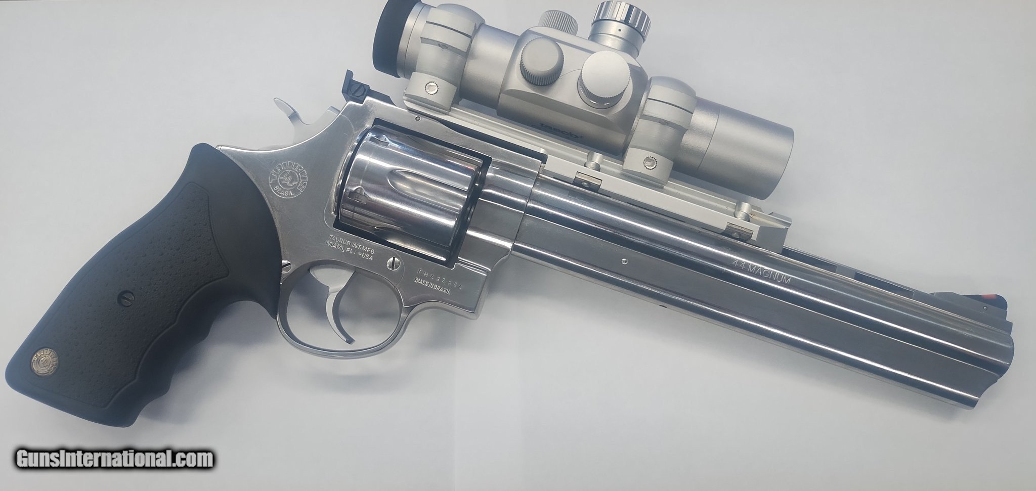 Description: Guns Listing ID: 547802 Nice condition taurus m44. includes tasco propoint red dot. no box/ case SOLD Manufacturer: TAURUS Model: M44 Caliber Info: .44 MAGNUM Condition: Used - Non-Certified Barrels: 7.5 BARREL Action: REVOLVER Finish: black & stainless |
