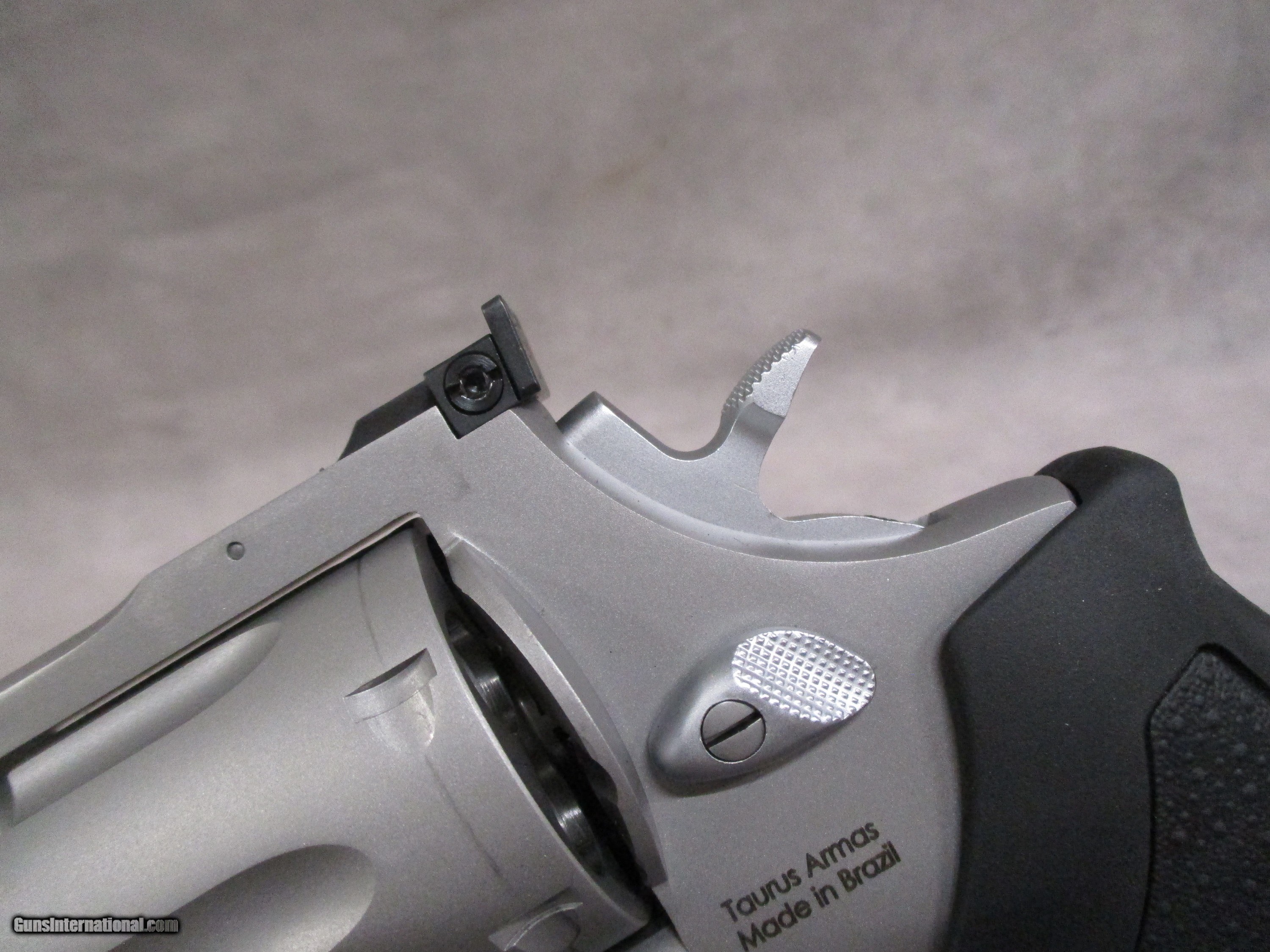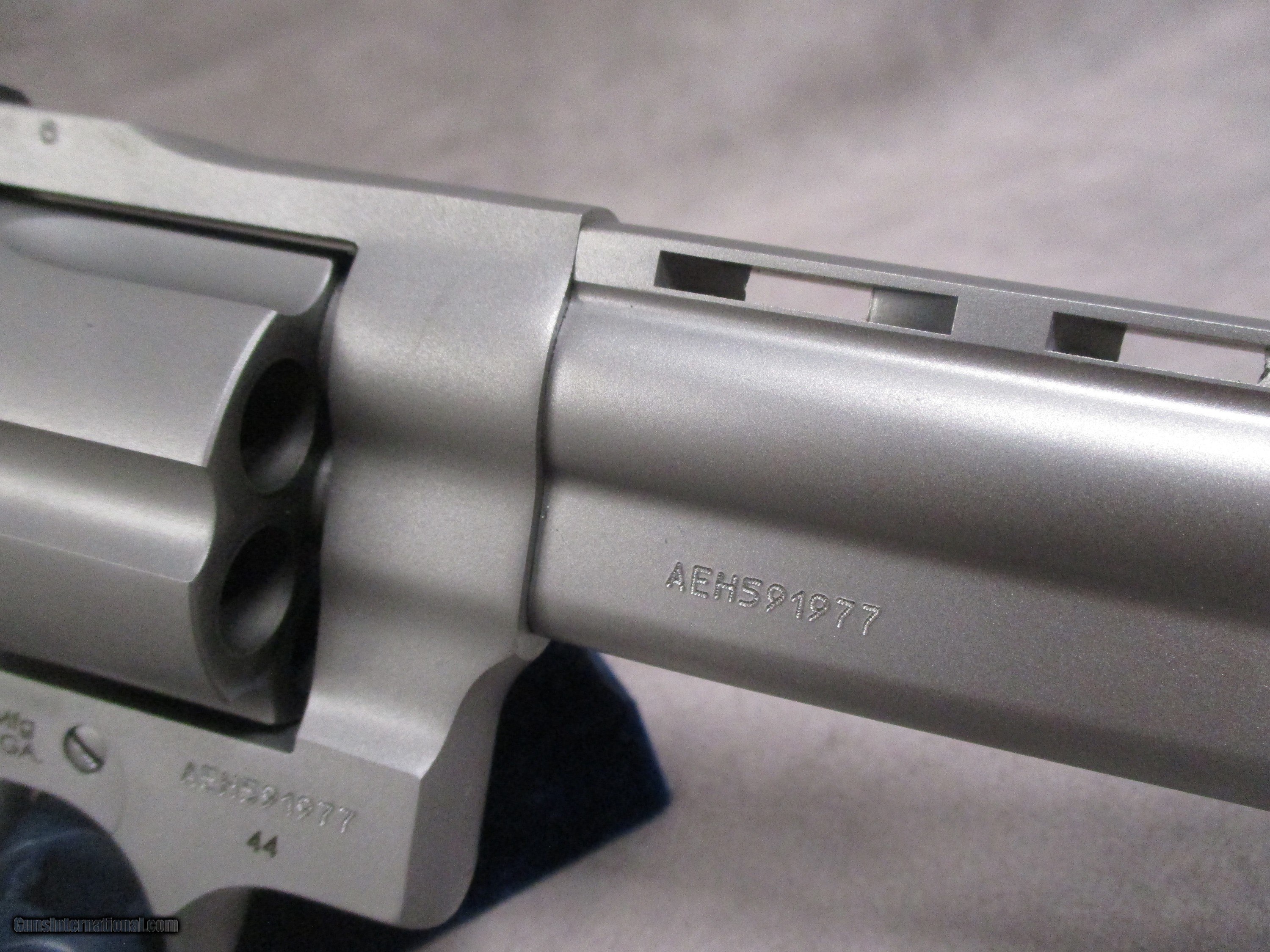 Description: The Taurus M44 is very comparable to the Smith & Wesson Model 629. It too, is a large frame revolver made of stainless steel and chambered for the famous .44 Remington Magnum cartridge. The example shown here is SKU # 2-440089. It features an 8 3/8-inch long, ported barrel. The porting helps to reduce recoil and muzzle flip, reducing time between follow-up shots. The barrel also has a full lug to reduce recoil. The rubber grip provides a generous amount of padding on the backstrap to reduce wear to the user’s hand. This can be an issue for revolvers with exposed backstraps. Over the course of shooting such a gun, the user will begin to feel pain in theof the hand because the force of the recoil is being directly sent into the user’s hand and wrist. A rubber backstrap helps reduce this wear quite significantly. The sights are the usual adjustable rear and red ramp front found on most revolvers today. The yoke (or crane) features a spring-loaded plunger that fits into a recess inside the frame under the barrel, acting as a third locking point. This effectively makes the M44 a stronger firearm than older versions of the 629 as the cylinder locking into three places instead of two provides greater overall lockup. Newer versions of the 629 also have this feature. At 57.00 oz. unloaded, the M44 with the long barrel is a fairly heavy revolver, but this is what you want in a large-caliber revolver. As it is chambered for the .44 Magnum, the M44 with an 8.375-inch barrel would make an excellent target gun as well as something fun to plink around with. It could also be used for handgun hunting. As with any .44 Magnum revolver, the M44 will also chamber the .44s two predecessors, the .44 S&W Special and .44 S&W Russian. These can be useful for practice at the range as their lower pressure results in reduced felt recoil. Indeed, with the ports and great length of the barrel, the .44 Russian would likely have little if any recoil. This M44 is brand new in the box and has not been fired since leaving the factory. There does appear to be slight blemish in the finish on the right hand side of the barrel. SOLD Handgun Caliber: .44 Special, .44 S&W Russian, .44 Remington Magnum Manufacturer: Taurus Mfg. Model: M44 Serial Number: AEH591977 Bore: Rifled, 5 grooves, 1:18.75 inches (1 in 476.25 mm) RH twist Chambers: 6 Ejectors: Manual, simultaneous 6-round ejection Condition: New in Box Barrels: Stainless steel Barrel Type: Full-lug, Vent Ribbed Action: Double/Single Action Triggers: 0.400 inches (10 mm) smooth trigger Stock: Rubber grips Finish: Matte stainless Weight: 57.0 oz. unloaded Sights: Fully adjustable rear, red ramp front, sight radius 10.5 inches (266.7 mm) Manufacture Date: 2023 Case: Taurus box |
