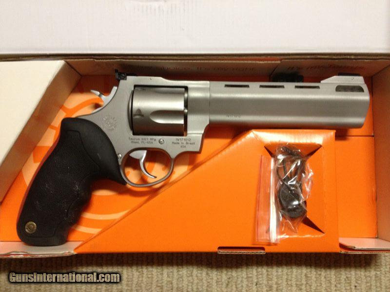 Description: This is a new in the box Taurus Raging Bull Model 454SS6M chambered for the powerful.454 Casull and.45 Long Colt. It comes with new RCBS .454 Casull carbide dies ($52.99 value). This Raging Bull has a 6 1/2 inch ported barrel, rubber cushioned grips, adjustable rear sight with sight guard, dual lock up cylinder for strength, and the Taurus Security System with transfer bar for safety. It is a 5 shot single/double action revolver in a matte stainless steel finish. The Taurus MSRP for this model is $1070.05. Buyer pays $50 shipping for UPS 2nd day air. USPS money order or cashiers check only. SOLD Manufacturer: Taurus Model: .454SS6M Serial Number: IW171012 Caliber Info: .454 Casull Chambers: 5 Condition: Factory New |