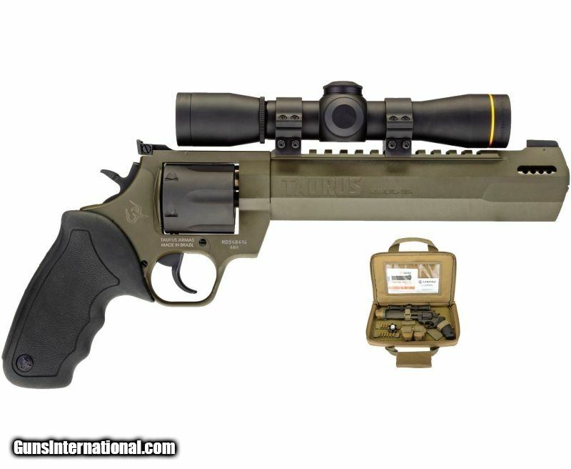 Description: Manufacturer: Taurus International MFG, Inc. Model: Raging Hunter™ Hunting Package Sku: 2-440081RH-DLX Optics: Leupold FX-II 4x28mm Handgun Scope Caliber: .44 Magnum Barrel Length: 8.38" Ported Capacity: 6 Round Cylinder Cylinder Finish: Matte Black Oxide Frame Finish: Military Spec Green Cerakote Grips: Black Rubber with Cushioned Insert Weight: 55 oz Overall Length: 15" Picatinny Rail Sights: Front - Fixed, Rear - Adjustable Action: Double / Single Action Winner of the 2019 American Hunter Hunting Handgun of the Year Golden Bullseye Award, the Taurus Raging Hunter is a next-generation, big-bore revolver that’s first in innovation-and built to last. A fun and effective alternative for short-to medium-range hunting scenarios, this 44 Magnum, six-shot revolver is now available in Military Spec Green Cerakote. Its revolutionary angular barrel design cuts down on overall weight, while its factory-tuned porting and gas expansion chamber reduces muzzle lift for quicker target acquisition. Cushioned insert grips ensure a comfortable, controllable shooting experience. This Kit comes with a Taurus Deluxe Carry Case FDE, Two HKS 29-M Speed Loaders and, a Leupold FX-II Handgun 4x28mm Scope, with PRW2 1” Low mounting rings; these scopes can take a beating, they’re tested to the same harsh standards as all other Leupold scopes, a perfect match for this award-winning hunting handgun. SOLD |