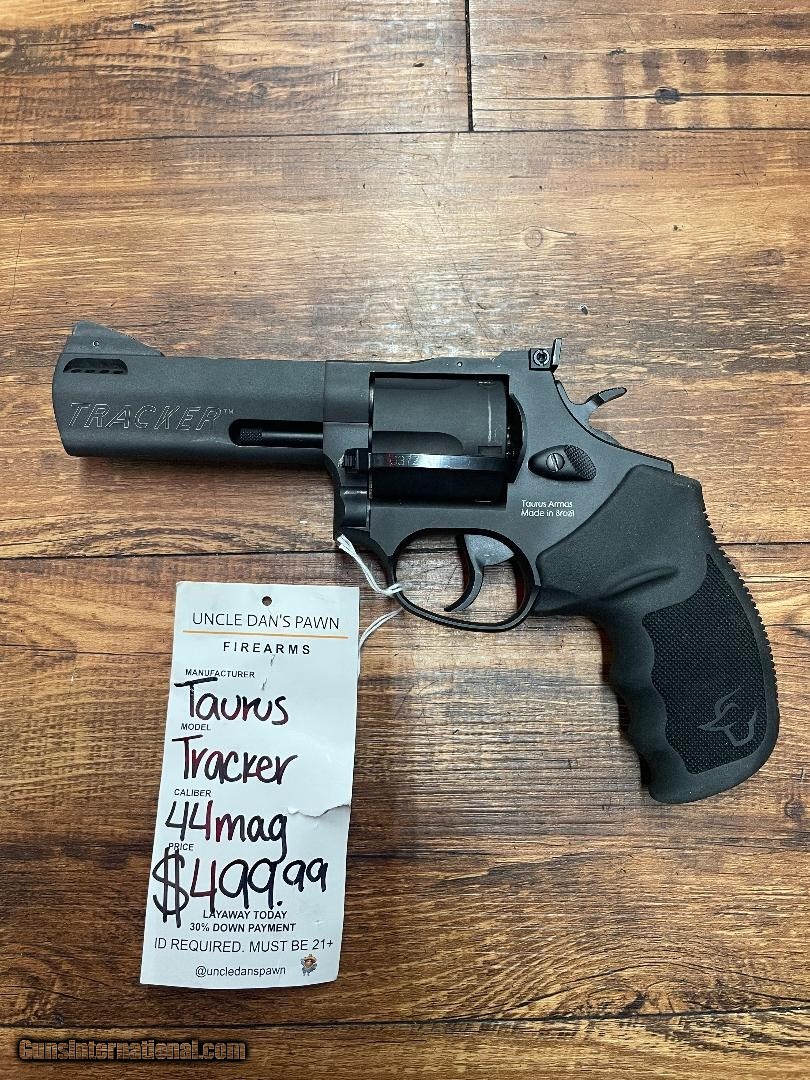 Description: Guns Listing ID: 584292 TAURUS TRACKER .44 MAG 5 ROUND REVOLVER SOLD Manufacturer: TAURUS Model: TAURUS TRACKER Caliber Info: .44 MAGNUM Condition: Used - Non-Certified Barrels: 5" BARREL Action: REVOLVER Finish: black matte |