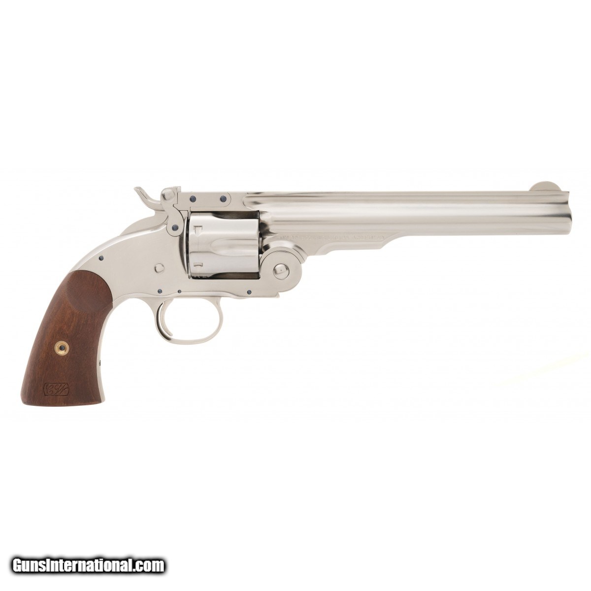Auto ejecting, top break, nickel-plated 7"" pistol with wood grips and blued small parts with a 6RD cylinder. NEW. UPC:839665008676.