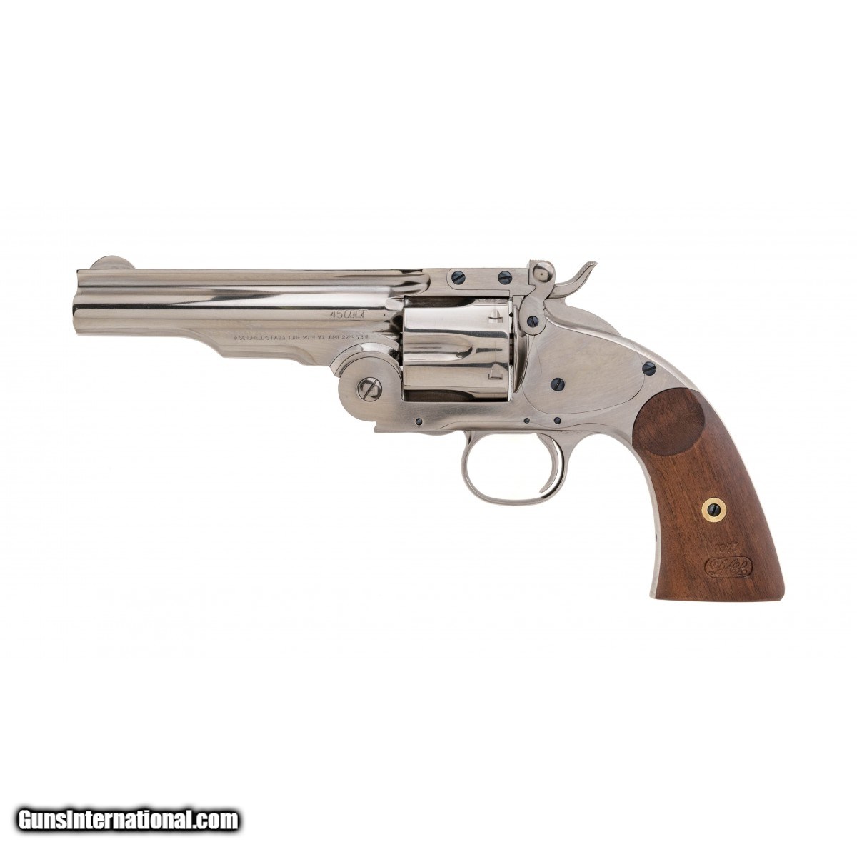 Auto ejecting, top break, nickel-plated 5"" revolver with wood grips, blued small parts, and a 6RD cylinder. NEW. UPC:810012510790.