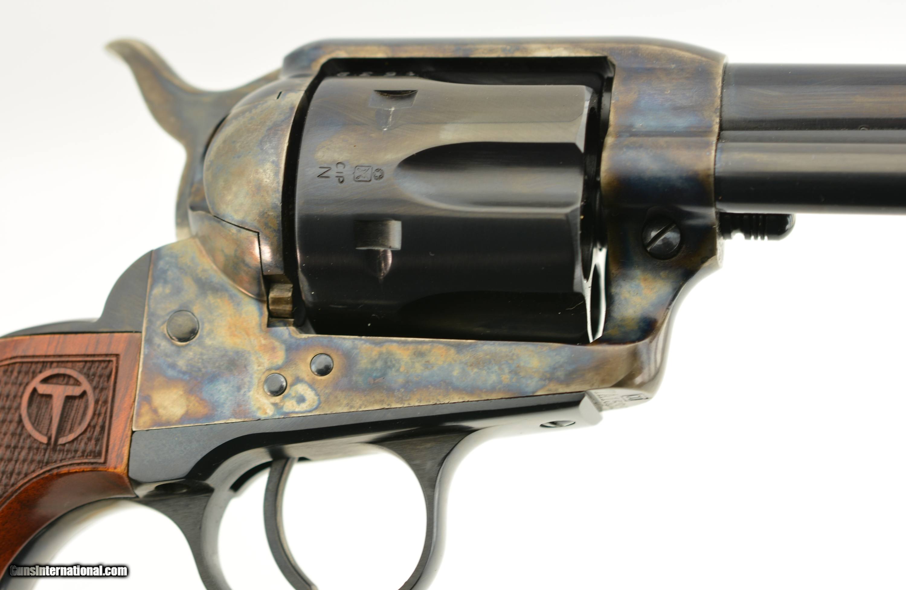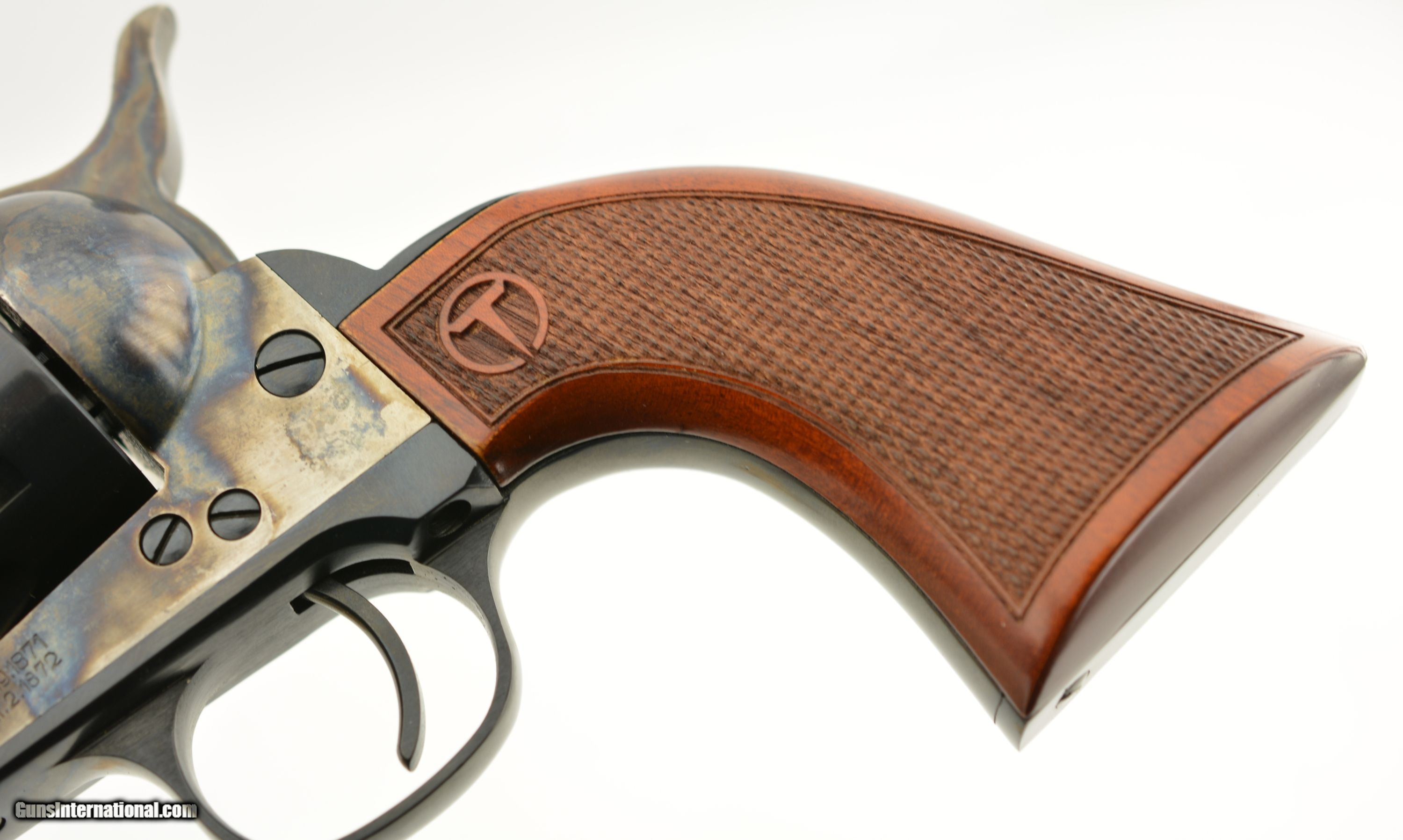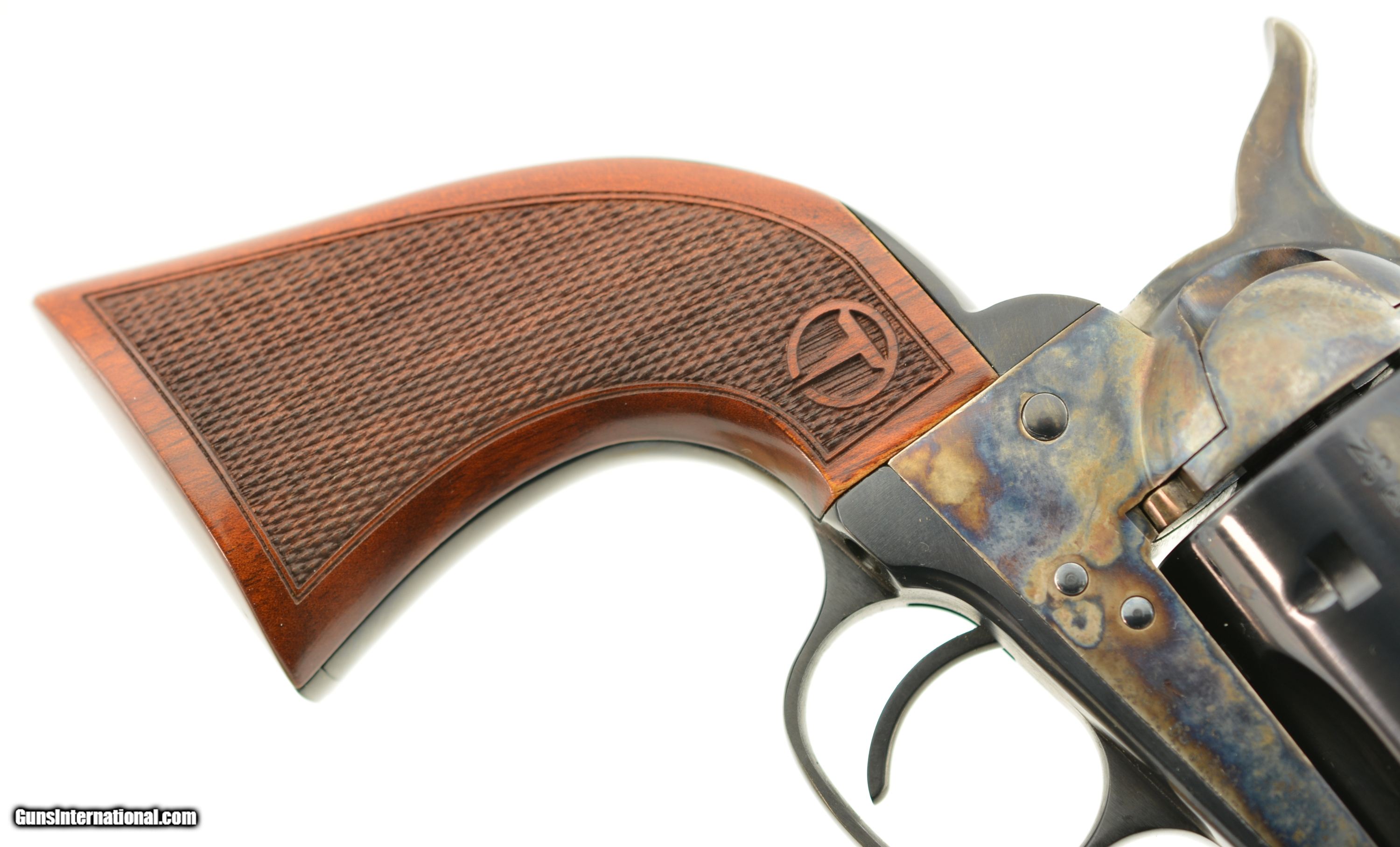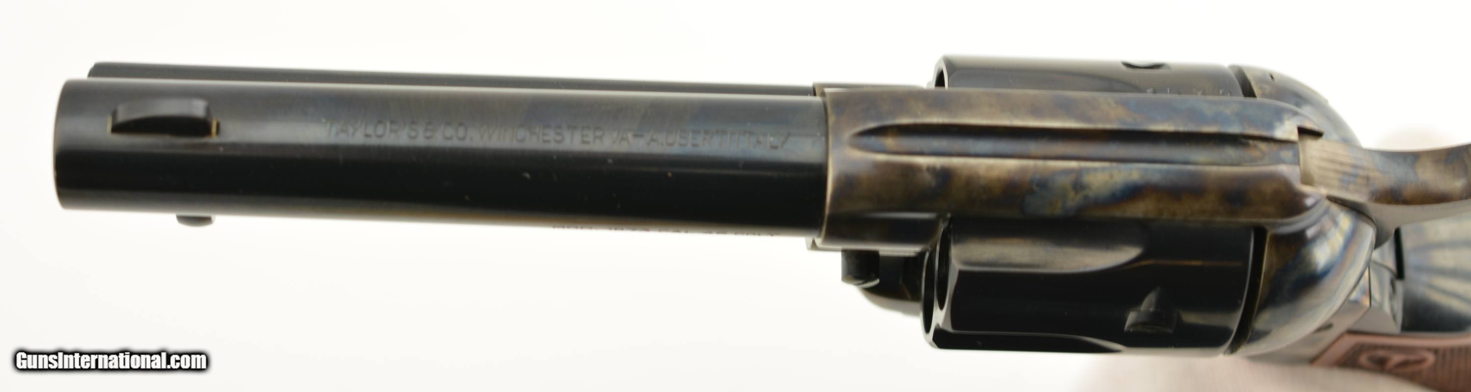Description: Serial #TA1532, .45 Long Colt, 4" inch barrel with a bright, excellent bore. This is the Taylor's & Co. Smokewagon model 1873 SAA manufactured in Italy by A. Uberti (#REV4109DE) that has a "Taylor Tuned" action and features laser-engraved Taylor logo checkered grips and a beautiful case color frame. In excellent, like new condition, the barrel and grips frame retain virtually all, 99% plus, original blue finish with the frame and hammer showing beautiful case color. The grips are likewise excellent with very little evidence of handling. It comes in the original box numbered to the gun with paperwork and manual. A great looking revolver for the Cowboy Action shooter. FFL SOLD |